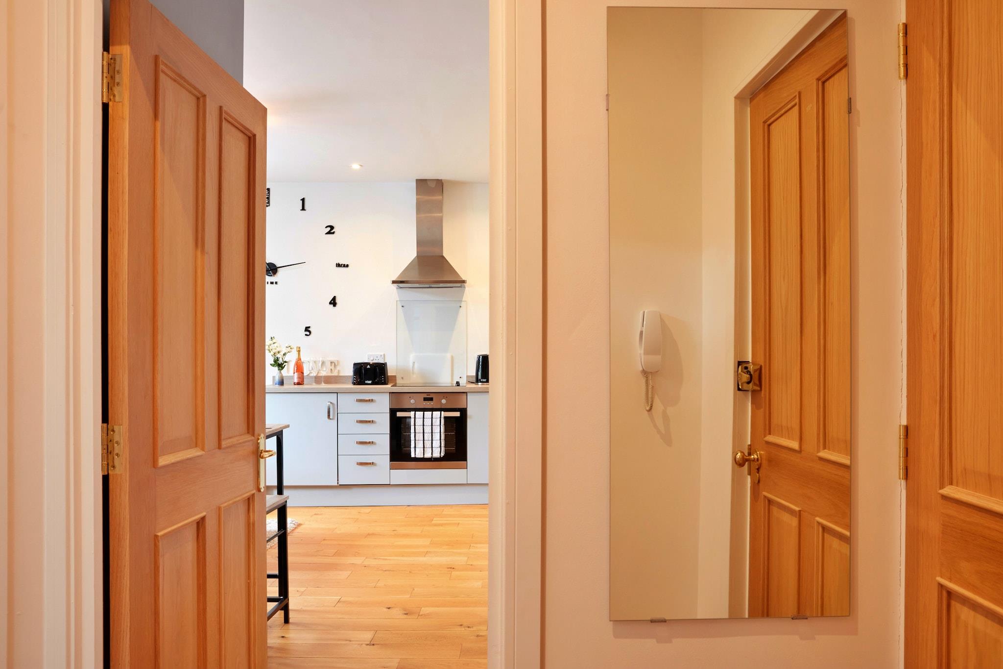 Diese charmante Ferienwohnung bietet stilvolle Unterkunft für bis zu vier Gäste, mit einem Schlafzimmer mit Doppelbett und einem zweiten Schlafzimmer mit Etagenbett, was sie ideal für Paare, kleine Familien oder Alleinreisende macht. Das Apartment befindet sich in der obersten Etage eines wunderschön renovierten Gebäudes und verbindet ursprünglichen Charakter mit modernem Design und Möbeln. Große Fenster erhellen den offenen Wohn-, Küchen- und Essbereich und schaffen eine gemütliche und einladende Atmosphäre. Obwohl Haustiere nicht gestattet sind, können Gäste für einen entspannten Aufenthalt kostenloses Internet, Zentralheizung, frische Bettwäsche und Handtücher genießen. Das Apartment liegt im Herzen von Matlock, einer lebhaften Stadt im Peak District, und ist von zahlreichen Pubs, Cafés und unabhängigen Geschäften umgeben, die alle zu Fuß erreichbar sind. Die zentrale Lage von Matlock macht es zu einem hervorragenden Ausgangspunkt für die Erkundung der Naturschönheiten und historischen Sehenswürdigkeiten des Nationalparks. Zu den beliebten Attraktionen in der Nähe zählen der Hall Leys Park, die Heights of Abraham mit Blick auf die Seilbahn und das Crich Tramway Village. Öffentliche Verkehrsmittel und Wanderwege sind gut erreichbar, sodass es auch für Gäste ohne Auto bequem ist. Das Apartment verfügt außerdem über eine voll ausgestattete Küche mit Mikrowelle, Kühlschrank, Backofen und allen notwendigen Utensilien, ideal für Gäste, die lieber zu Hause kochen. Das geräumige Badezimmer ist sauber und modern und bietet einen komfortablen und funktionalen Raum. Endreinigung, Heizung und Internetzugang sowie eine rückzahlbare Kaution sind im Mietpreis enthalten. Dieses ruhige und zentral gelegene Apartment verspricht einen komfortablen Rückzugsort für diejenigen, die Matlock und den umliegenden Peak District erkunden möchten.