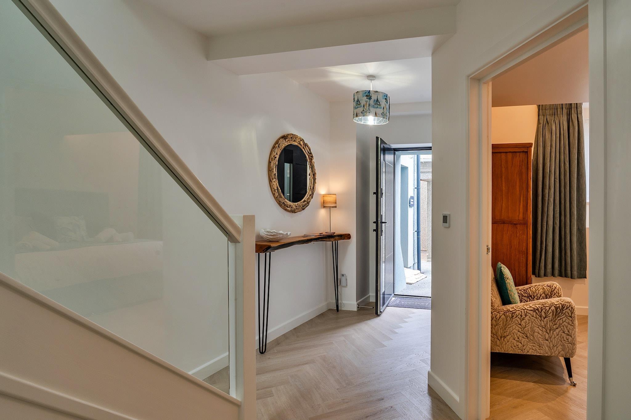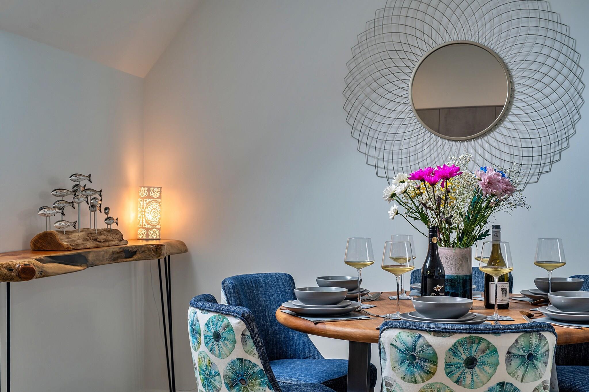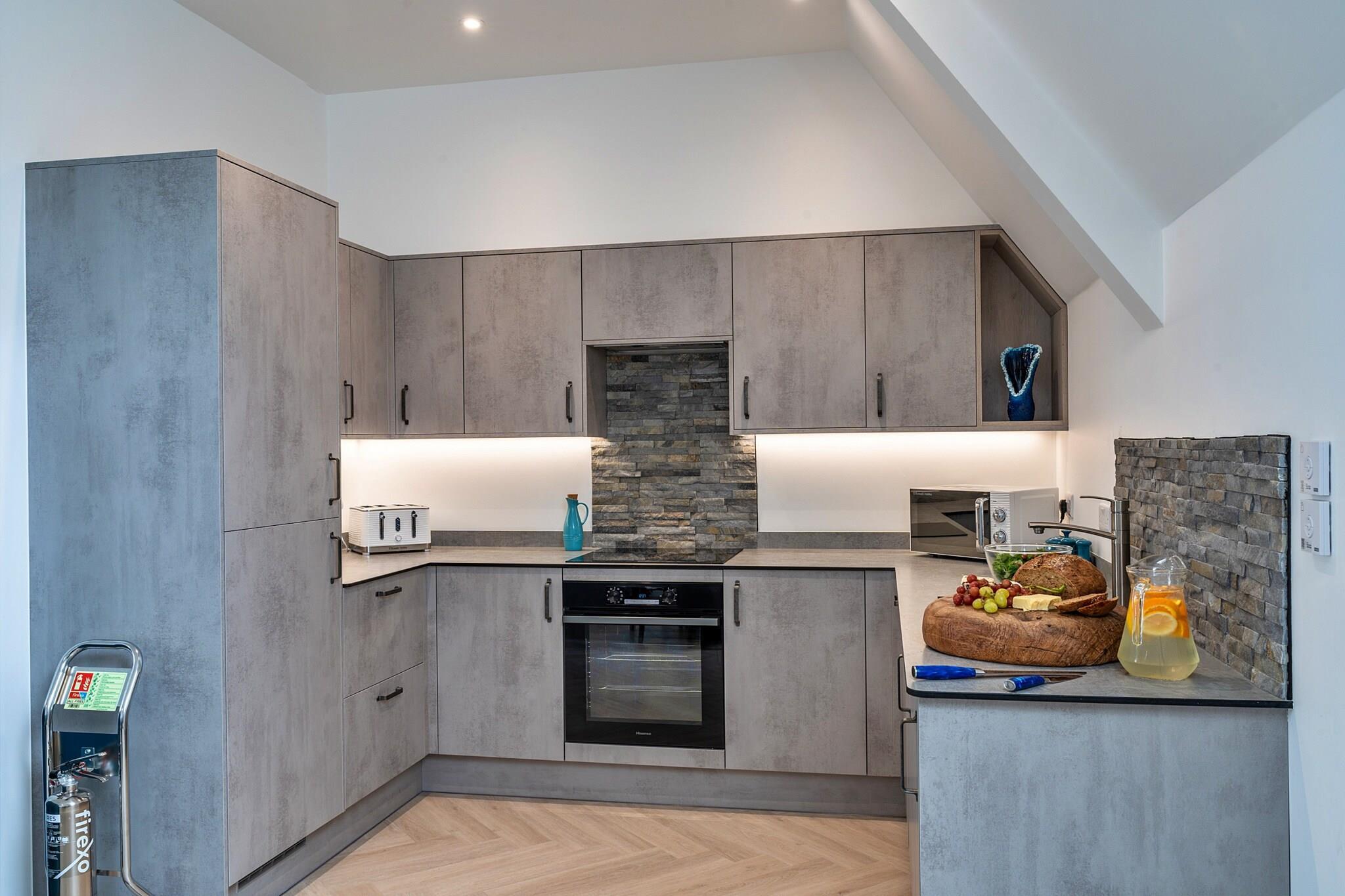 Willkommen in diesem atemberaubenden Umbau einer modernen Kapelle im Herzen von Newquay, wo moderner Luxus auf Küstencharme trifft. Nur 200 Meter vom goldenen Sandstrand von Towan Beach entfernt ist diese exquisite Oase eines von drei wunderschön gestalteten Ferienobjekten, die sowohl Genuss als auch Komfort für Familien, Paare und Gruppen bieten sollen, die einen unvergesslichen Kurzurlaub in Cornwall verbringen möchten. Wenn Sie diesen bemerkenswerten Rückzugsort betreten, werden Sie im Erdgeschoss zwei prächtige Super-Kingsize-Schlafzimmer mit Reißverschluss und Verbindungstür entdecken, die jeweils sorgfältig mit einem Smart-TV und einem eigenen Badezimmer ausgestattet sind, um Ihren Komfort und Ihre Privatsphäre zu gewährleisten. Steigen Sie die markante, glasgetäfelte Treppe hinauf, um im ersten Stock eine weitläufige, offene Lounge und Küche zu finden. Diese elegante, voll ausgestattete Küche ist ein kulinarischer Genuss und eignet sich perfekt für die Zubereitung von Familienmahlzeiten oder Snacks, die Sie im schönen Essbereich genießen können. Auf der obersten Etage erwartet Sie ein drittes Super-Kingsize-Schlafzimmer mit einem geräumigen Bad, einer bezaubernden Wand mit Eichenbalken, einem Smart-TV und einem stilvollen Schminktisch. Für zusätzliche Flexibilität können die Super-Kingsize-Betten auf Anfrage als Einzelbetten arrangiert werden, um den Bedürfnissen Ihrer Gruppe gerecht zu werden. Treten Sie hinaus auf Ihre private, umzäunte Terrasse, wo Sie bequeme Gartenmöbel und einen luxuriösen Whirlpool für sechs Personen finden, der sich perfekt zum Entspannen nach einem erlebnisreichen Tag eignet. Dieses kleine Stück Paradies ist haustierfreundlich und heißt Ihre pelzigen Begleiter herzlich willkommen, an dem Spaß teilzunehmen, und stellt sicher, dass jeder die Schönheit des Küstenlebens genießt. Ein vor Ort befindliches Ladegerät für Elektrofahrzeuge sorgt für jede Menge Komfort und erleichtert Ihnen die Erkundung der atemberaubenden Sehenswürdigkeiten in der Nähe. Das pulsierende Herz von Newquay ist voller Annehmlichkeiten, darunter köstliche Restaurants, lebhafte Bars und ein Kino, die alle nur einen gemütlichen Spaziergang entfernt sind. Fistral Beach, bekannt für seine Surfkultur, liegt weniger als 1,6 km von Ihrer Haustür entfernt, während Sie in Crantock und darüber hinaus malerischere Küstenwanderungen erwarten. Mit Strandtüchern und Bademänteln sind Sie bestens gerüstet, um sich dem Küstenlebensstil hinzugeben. Dieser moderne Rückzugsort ist ein Zufluchtsort des ruhigen Luxus, der für ein unvergessliches Abenteuer in Cornwall konzipiert ist.