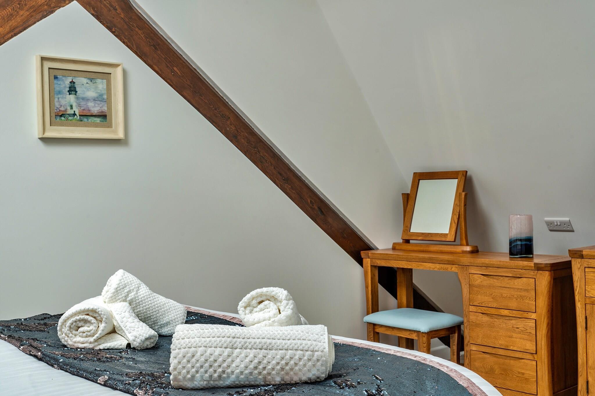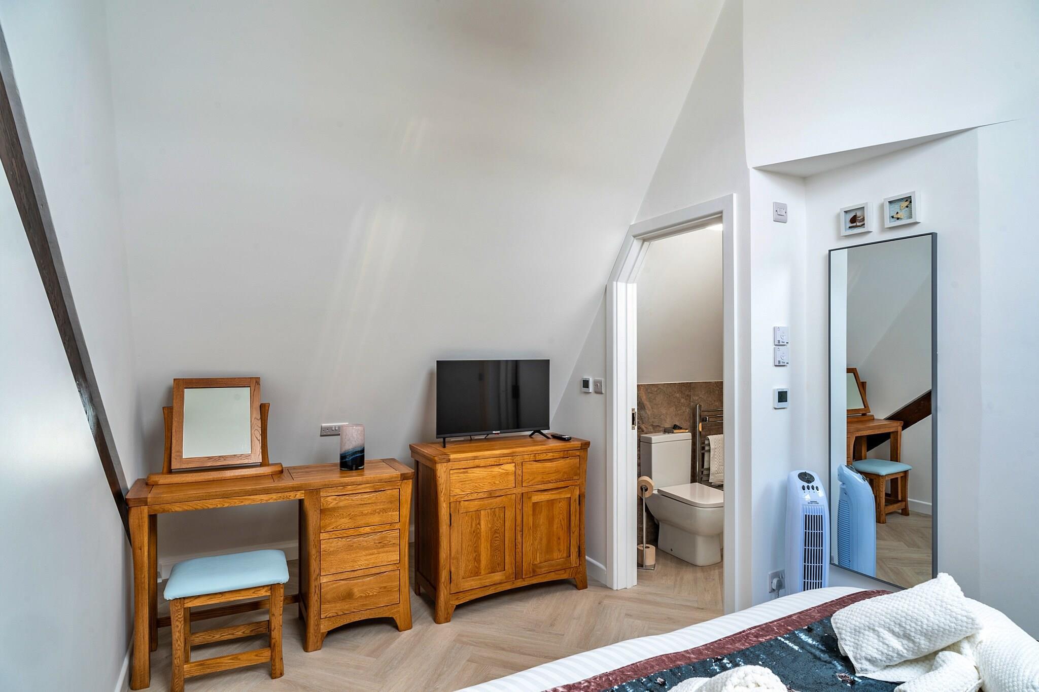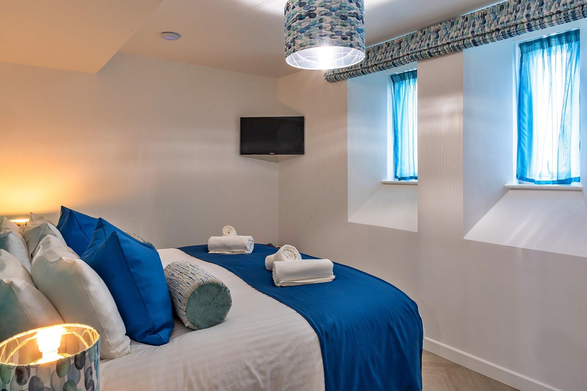 Willkommen in diesem atemberaubenden Umbau einer modernen Kapelle im Herzen von Newquay, wo moderner Luxus auf Küstencharme trifft. Nur 200 Meter vom goldenen Sandstrand von Towan Beach entfernt ist diese exquisite Oase eines von drei wunderschön gestalteten Ferienobjekten, die sowohl Genuss als auch Komfort für Familien, Paare und Gruppen bieten sollen, die einen unvergesslichen Kurzurlaub in Cornwall verbringen möchten. Wenn Sie diesen bemerkenswerten Rückzugsort betreten, werden Sie im Erdgeschoss zwei prächtige Super-Kingsize-Schlafzimmer mit Reißverschluss und Verbindungstür entdecken, die jeweils sorgfältig mit einem Smart-TV und einem eigenen Badezimmer ausgestattet sind, um Ihren Komfort und Ihre Privatsphäre zu gewährleisten. Steigen Sie die markante, glasgetäfelte Treppe hinauf, um im ersten Stock eine weitläufige, offene Lounge und Küche zu finden. Diese elegante, voll ausgestattete Küche ist ein kulinarischer Genuss und eignet sich perfekt für die Zubereitung von Familienmahlzeiten oder Snacks, die Sie im schönen Essbereich genießen können. Auf der obersten Etage erwartet Sie ein drittes Super-Kingsize-Schlafzimmer mit einem geräumigen Bad, einer bezaubernden Wand mit Eichenbalken, einem Smart-TV und einem stilvollen Schminktisch. Für zusätzliche Flexibilität können die Super-Kingsize-Betten auf Anfrage als Einzelbetten arrangiert werden, um den Bedürfnissen Ihrer Gruppe gerecht zu werden. Treten Sie hinaus auf Ihre private, umzäunte Terrasse, wo Sie bequeme Gartenmöbel und einen luxuriösen Whirlpool für sechs Personen finden, der sich perfekt zum Entspannen nach einem erlebnisreichen Tag eignet. Dieses kleine Stück Paradies ist haustierfreundlich und heißt Ihre pelzigen Begleiter herzlich willkommen, an dem Spaß teilzunehmen, und stellt sicher, dass jeder die Schönheit des Küstenlebens genießt. Ein vor Ort befindliches Ladegerät für Elektrofahrzeuge sorgt für jede Menge Komfort und erleichtert Ihnen die Erkundung der atemberaubenden Sehenswürdigkeiten in der Nähe. Das pulsierende Herz von Newquay ist voller Annehmlichkeiten, darunter köstliche Restaurants, lebhafte Bars und ein Kino, die alle nur einen gemütlichen Spaziergang entfernt sind. Fistral Beach, bekannt für seine Surfkultur, liegt weniger als 1,6 km von Ihrer Haustür entfernt, während Sie in Crantock und darüber hinaus malerischere Küstenwanderungen erwarten. Mit Strandtüchern und Bademänteln sind Sie bestens gerüstet, um sich dem Küstenlebensstil hinzugeben. Dieser moderne Rückzugsort ist ein Zufluchtsort des ruhigen Luxus, der für ein unvergessliches Abenteuer in Cornwall konzipiert ist.