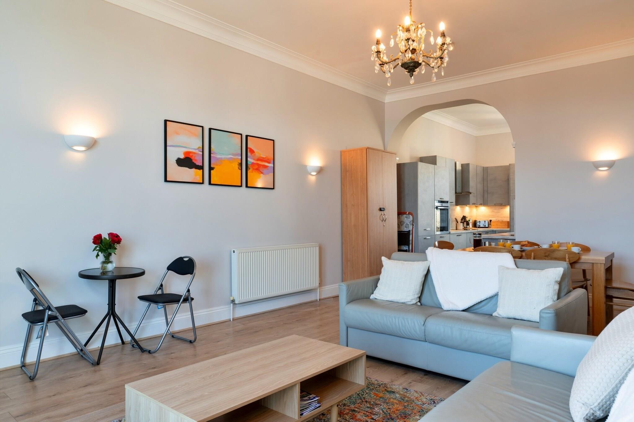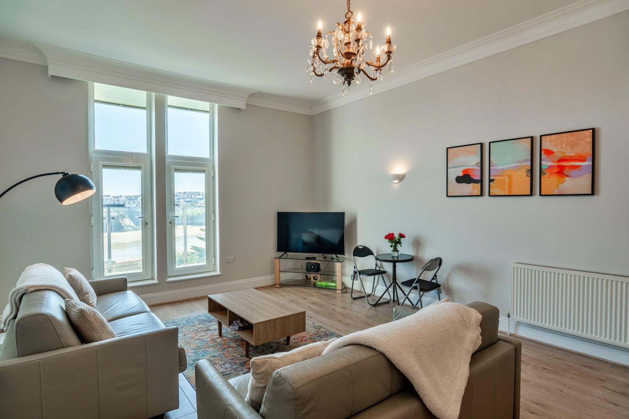 Entdecken Sie einen atemberaubenden Küstenurlaub in diesem atemberaubenden Apartment im ersten Stock mit herrlichem Blick über Towan Beach und die wogenden Meereswellen. Dieser moderne Rückzugsort eignet sich perfekt für Familien und Paare und ist auf Entspannung und Komfort ausgelegt. Der geräumige Wohnbereich verfügt über hohe Decken und große Balkontüren, die viel Tageslicht hereinlassen und die Schönheit der Küste Cornwalls nahtlos ins Haus bringen. Mit einem einladenden offenen Wohn- und Essbereich ist es ein großartiger Ort zum Entspannen, während die gut ausgestattete Küche alles bietet, was Sie für einen Selbstversorger-Aufenthalt benötigen. Das Apartment bietet Platz für bis zu vier Erwachsene und verfügt über zwei elegant eingerichtete Schlafzimmer. Das Hauptschlafzimmer mit einem Kingsize-Bett bietet einen atemberaubenden Blick auf den Strand und verfügt über ein stilvolles eigenes Badezimmer. Das zweite Schlafzimmer verfügt über luxuriöse Einzelbetten und einen atemberaubenden Meerblick, ideal, um die Sonnenaufgänge am frühen Morgen zu genießen. Ein gemütlicher Balkon lädt Sie ein, den faszinierenden Blick auf den Hafen zu genießen – ideal, um Ihren Morgenkaffee oder einen Drink bei Sonnenuntergang zu genießen. Dieser Rückzugsort liegt günstig für Strandtage und malerische Küstenwanderungen und liegt in der Nähe des pulsierenden Stadtzentrums, wo Sie unabhängige Boutiquen, Surfshops und lokale Cafés finden. Feinschmecker werden die Vielfalt der Restaurants zu schätzen wissen, von frischen Meeresfrüchten bis hin zu Strandbars. Bitte beachten Sie, dass der Zugang über einen privaten Parkplatz abseits der Straße für ein Auto über eine Treppe erfolgt, da sich das Apartment im ersten Stock befindet. Dieser Küstenurlaub ist der perfekte Ausgangspunkt für Ihr nächstes Abenteuer und verbindet den Charme des Meeres mit modernen Attraktionen.