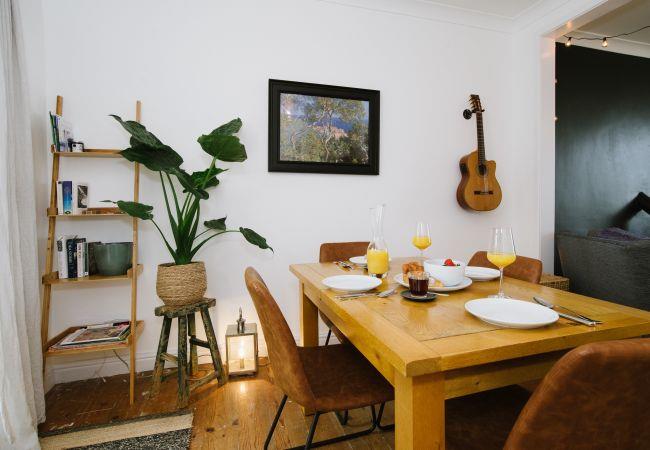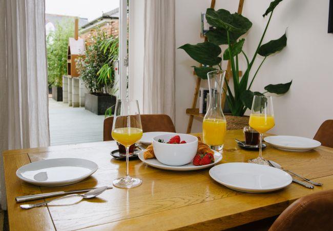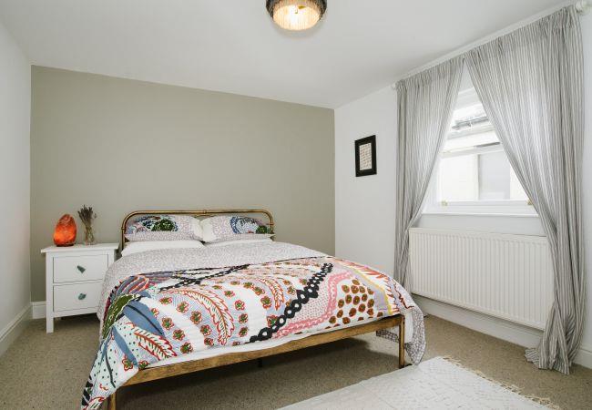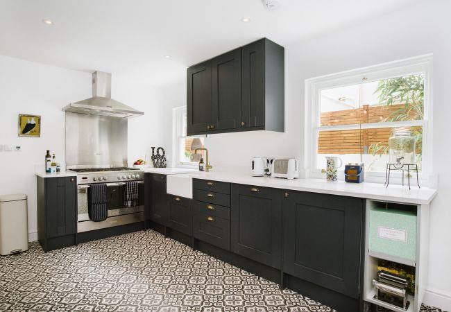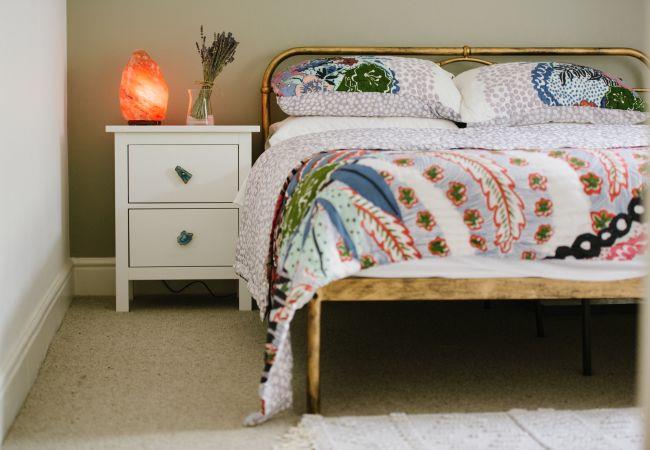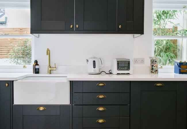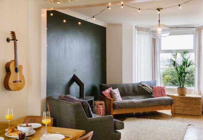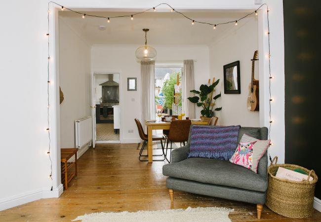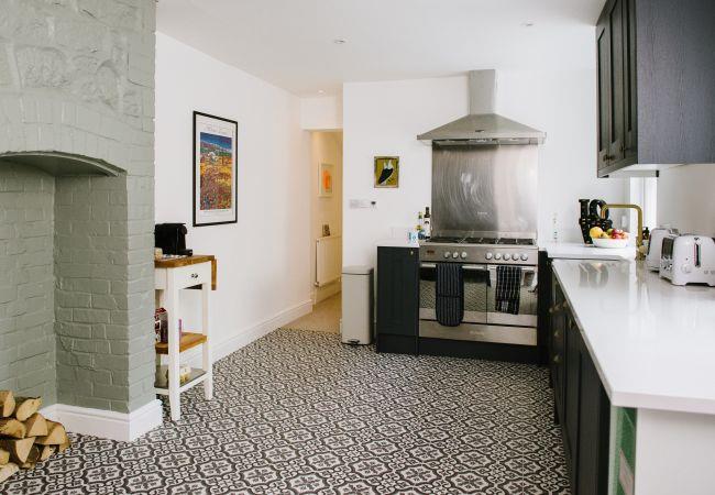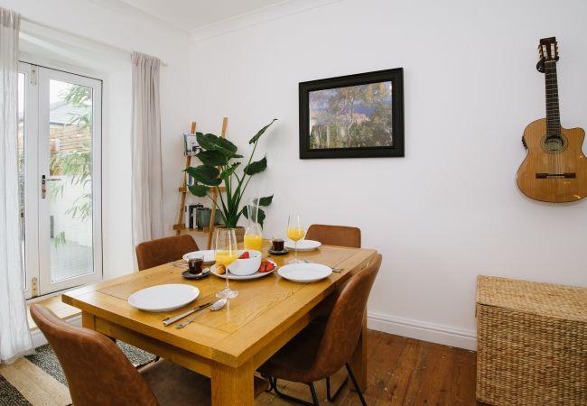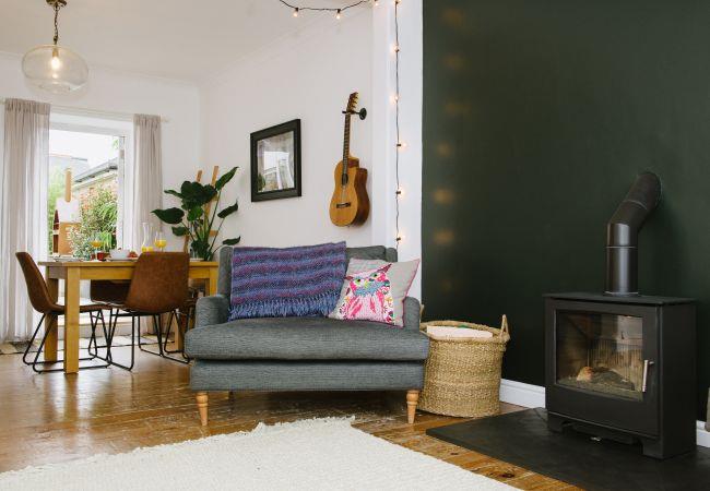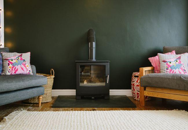 Inside, the house is fresh and chic with a generous open plan living and dining area making the ideal social or family space in which to relax after your day of adventures. The living area has a bay window with sea views, and a large sofa and armchair are arranged around the wood-burner, a lovely feature in the room and perfect for cosying up on cooler evenings. There is also a television with access to all the streaming platforms, so you can log on and pick up your favourite shows easily. The dining area has a contemporary wooden table and chairs comfortably seating four, and French doors out to the rear decking and garden.