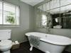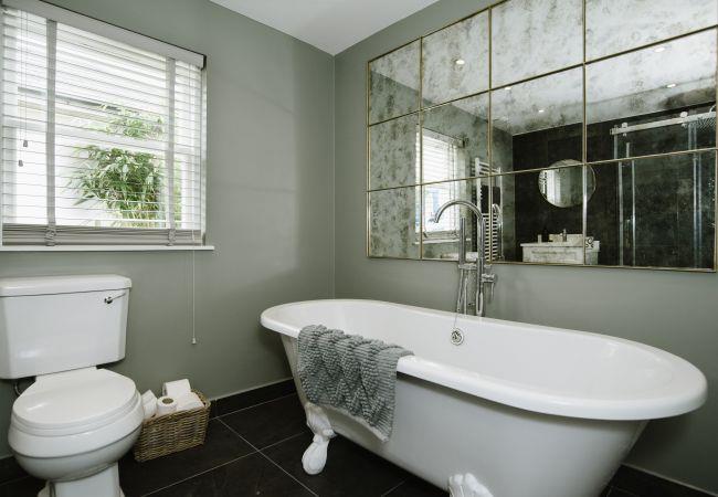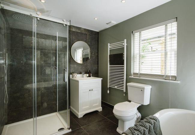 The bathroom is sleek and decadent, with a grey tiled floor, full size luxury roll-top bath and separate double-size shower enclosure with a rainfall shower head. There is also a heated towel rail, close-coupled WC and basin with vanity unit underneath.