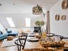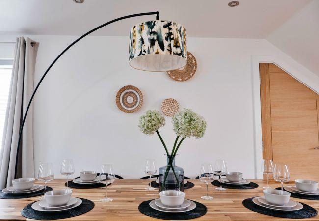 There is a large corner sofa to sink into, and a 50" smart TV giving access to all the streaming platforms, so you can log on and pick up your favourite shows easily. The dining area has table and chairs to comfortably seat 8, characterised by a chic over-table feature light, giving a decadent feel to family dining.