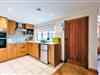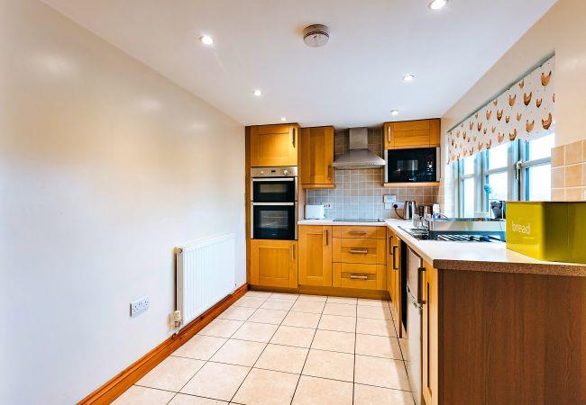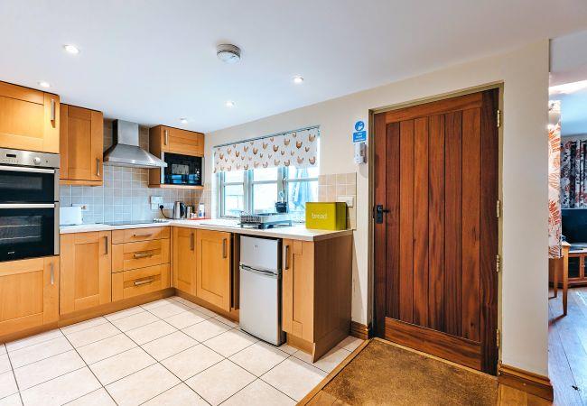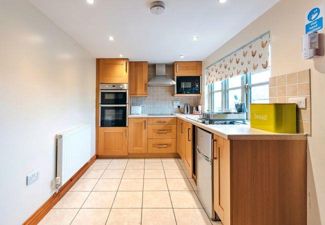 Die hübsche und voll ausgestatteter Küche Unterkunft mit 100 m², mit Blick auf den Garten.