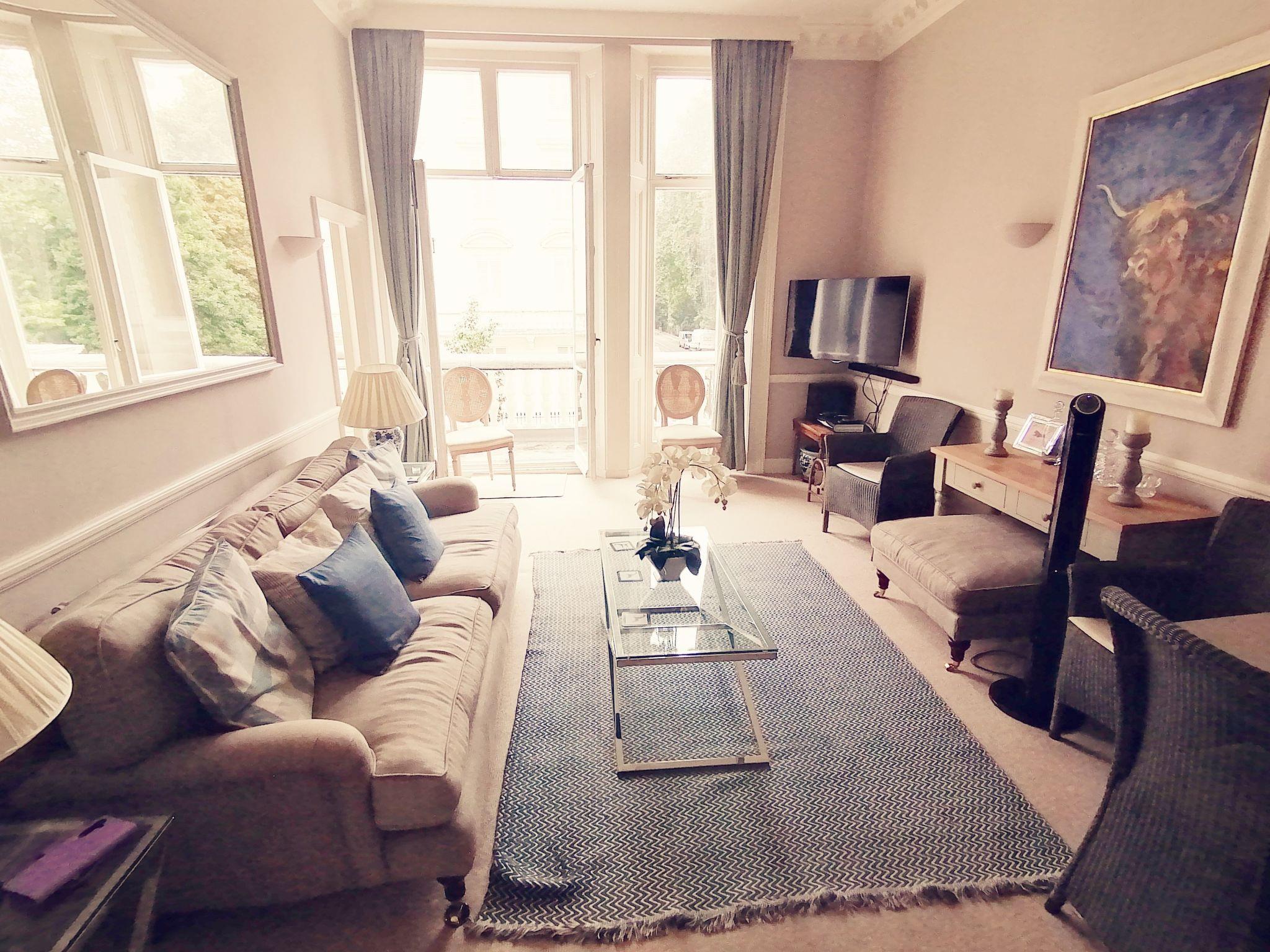 Auf dem Balkon können Sie frische Luft schnappen und einen einzigartigen Blick auf die Stadt genießen. Die Wohnung blickt auf unsere preisgekrönten privaten Gärten. Dieser private Außenbereich bietet einen ruhigen Ort, um nach einem anstrengenden Tag mit Besichtigungen oder Meetings zu entspannen, und verfügt über einen Spielbereich für Kinder.