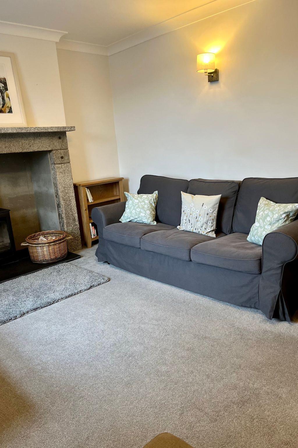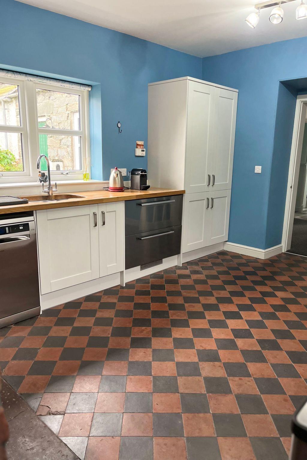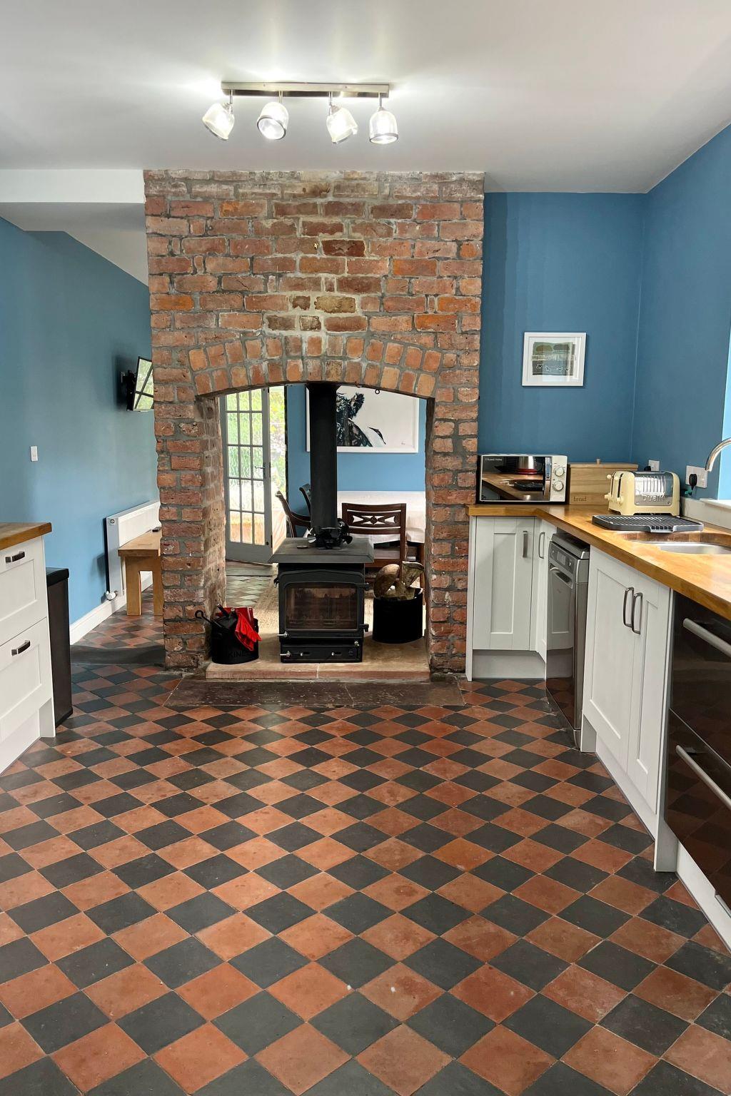 Das Cottage hat viele seiner ursprünglichen Merkmale bewahrt, wobei die alten Kamine und der Küchenboden hervorstechen.