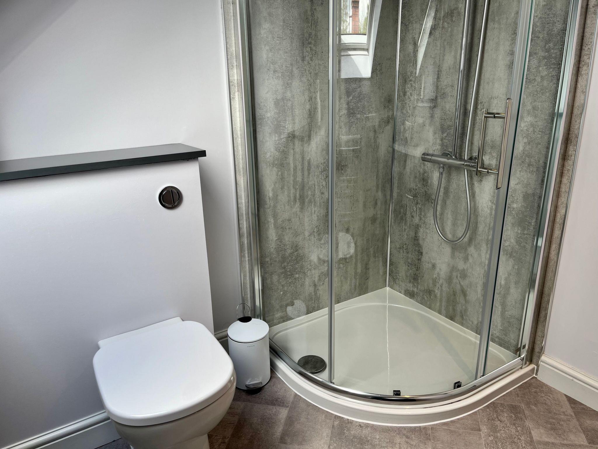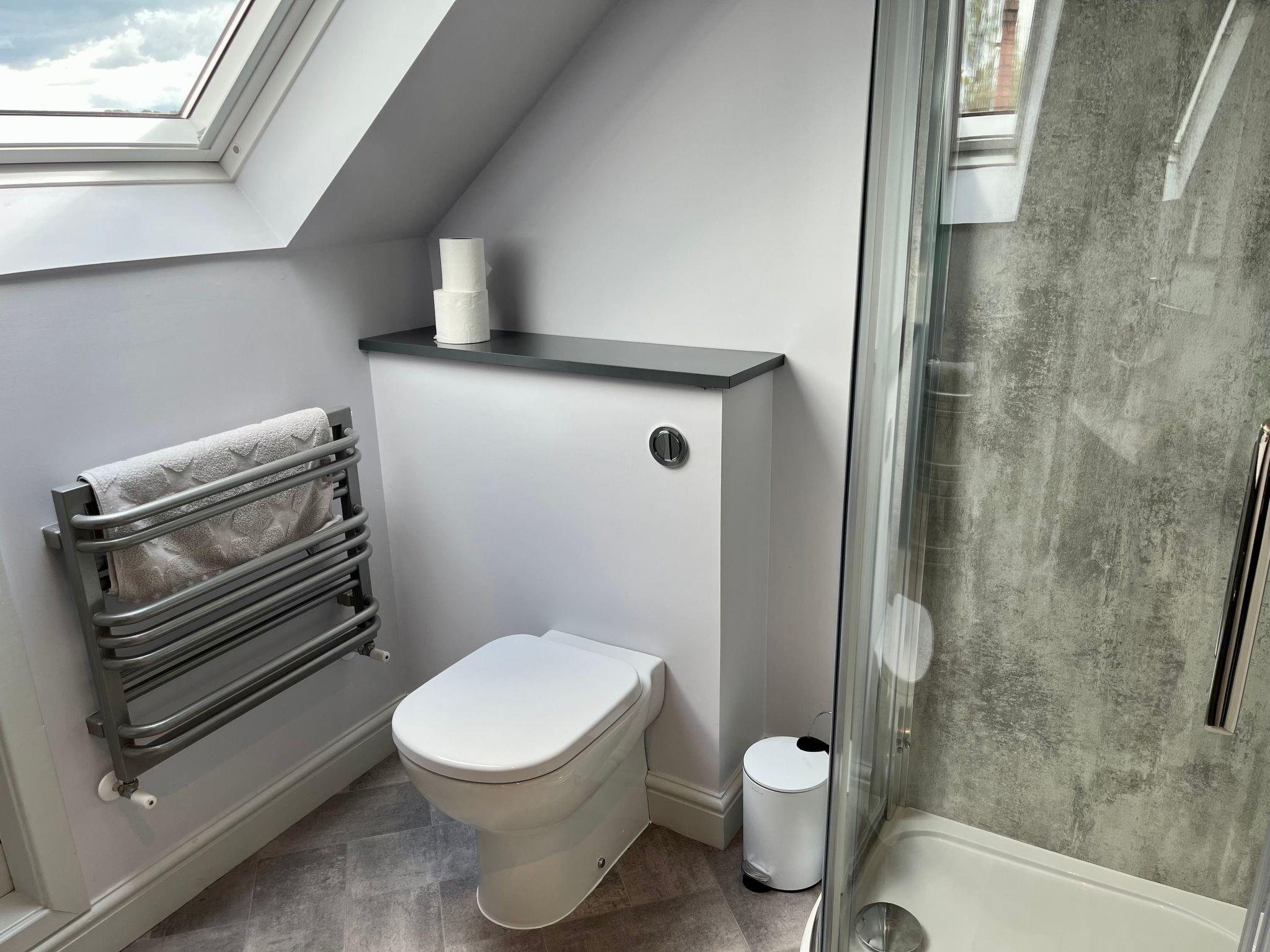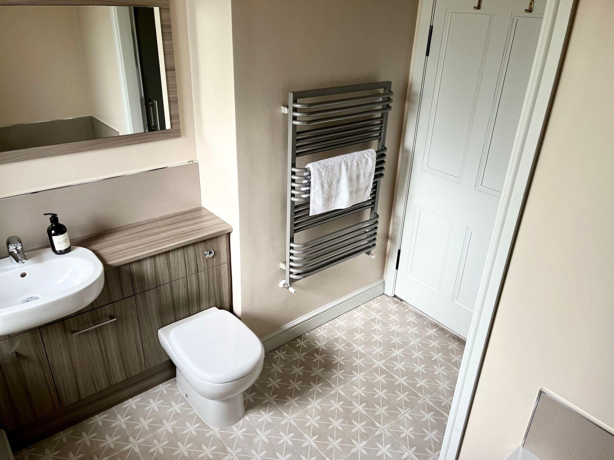 Badezimmer mit WC, Handwaschbecken und Dusche