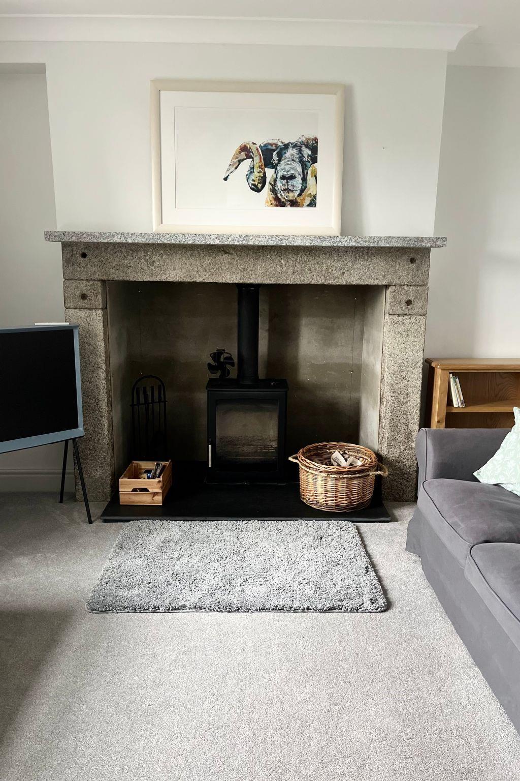Wohnzimmer mit Holzbrenner und Smart-TV