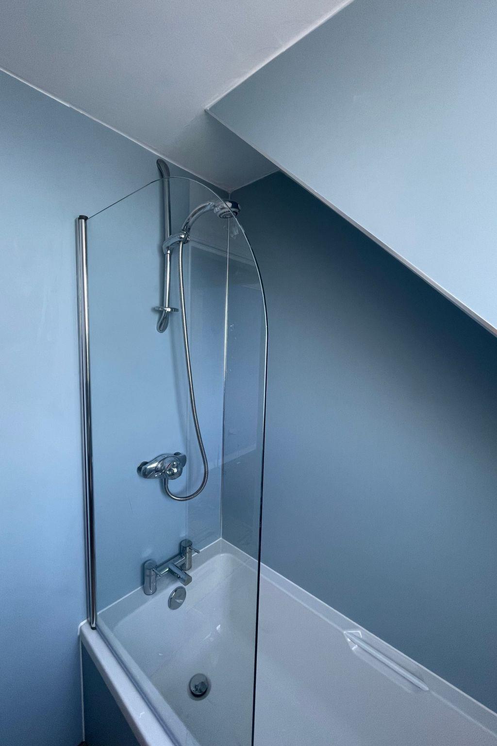 Badezimmer mit WC und Badewanne mit Duschvorrichtung