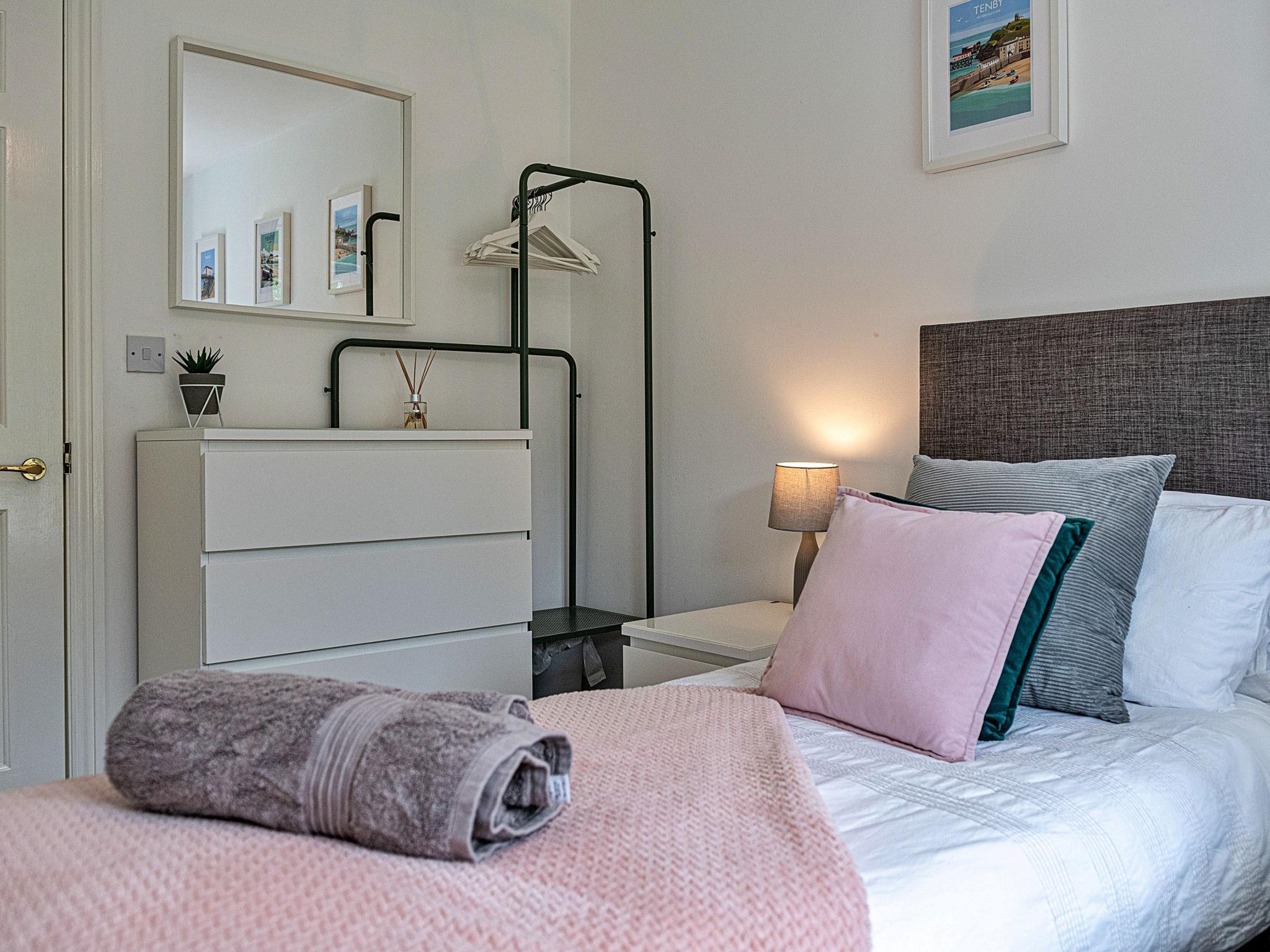 Tenby: Appartementhaus. Zur Mitbenutzung: Schwimmbad beheizt (saisonale Verfügbarkeit: 01.Jan. - 31.Dez.). Zur Alleinbenutzung: Garten. Supermarkt 700 m, Bahnstation 600 m, Sandstrand 800 m. Golfplatz 1 km.