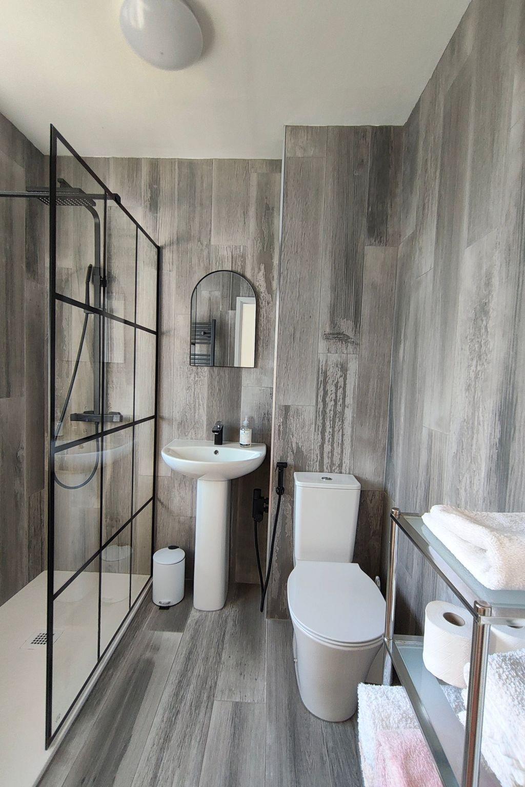 Es gibt ein komplett renoviertes Hauptbadezimmer mit einer luxuriösen begehbaren Regendusche, hochwertigen Armaturen und einer hygienischen Handdusche. Außerdem gibt es ein separates Gäste-WC mit Waschbecken, Toilette und einer zweiten Dusche neben dem dritten Schlafzimmer.