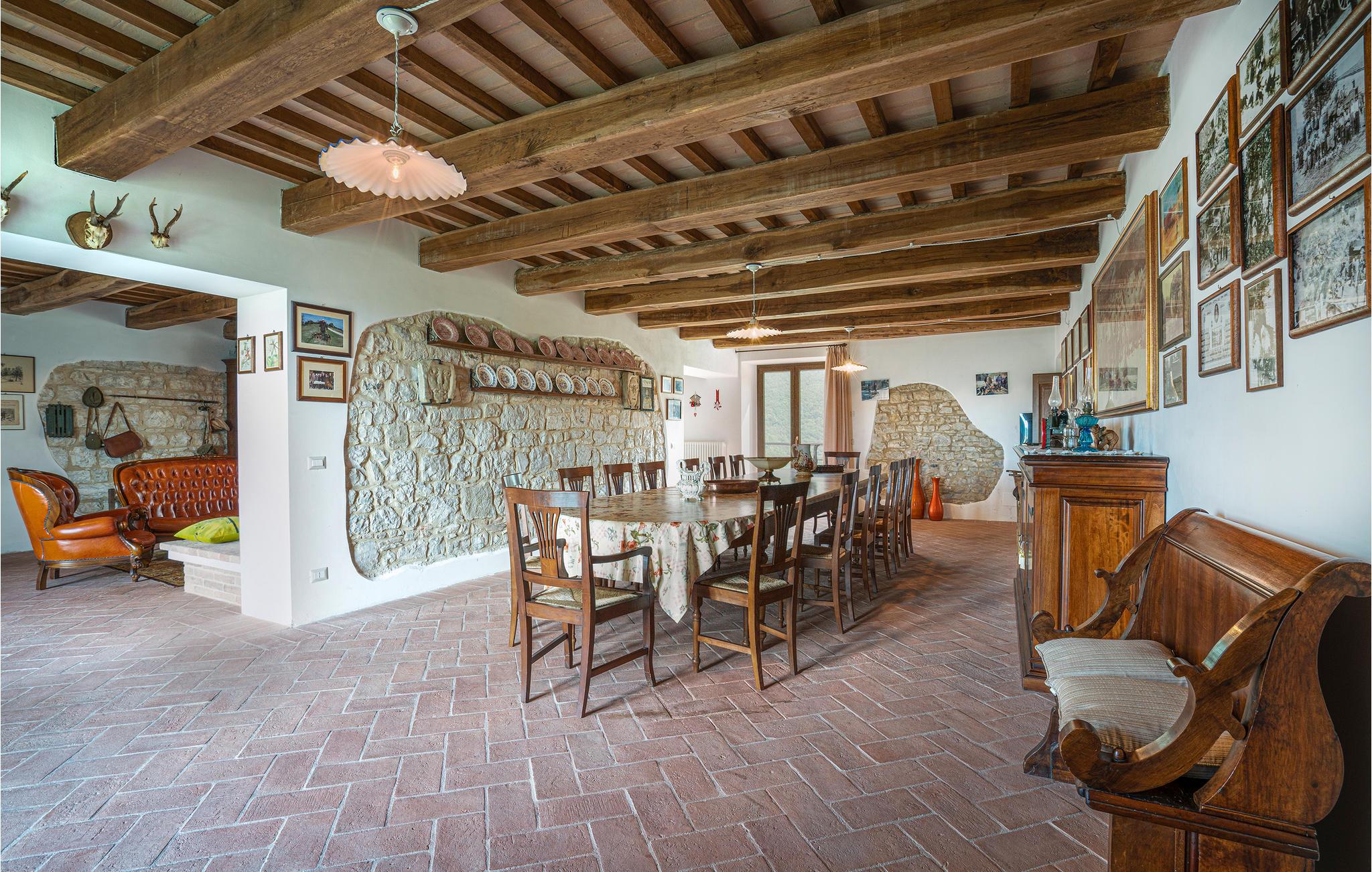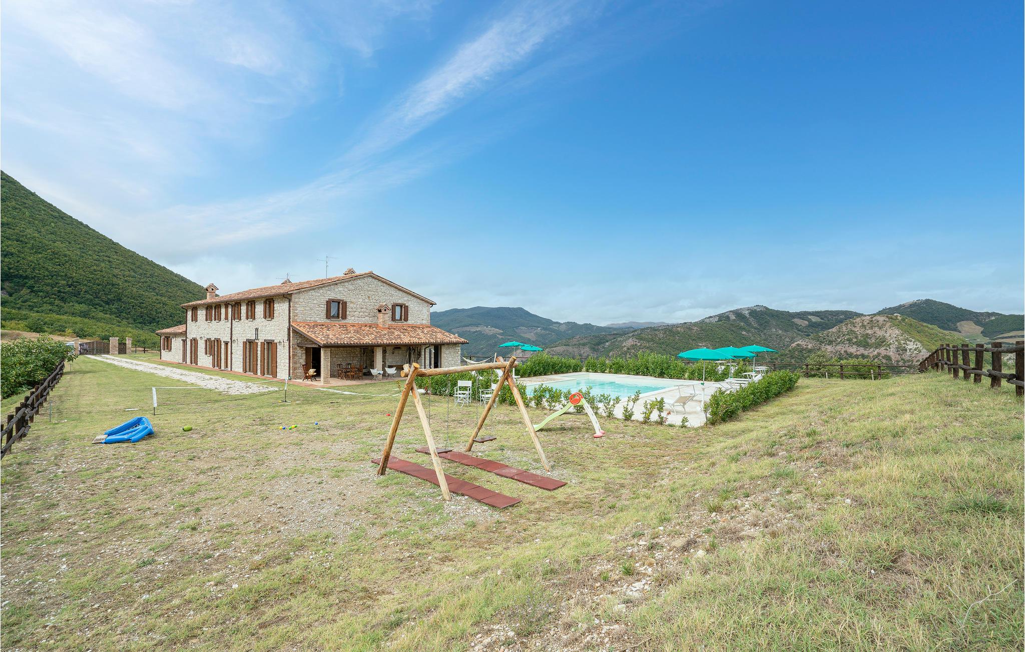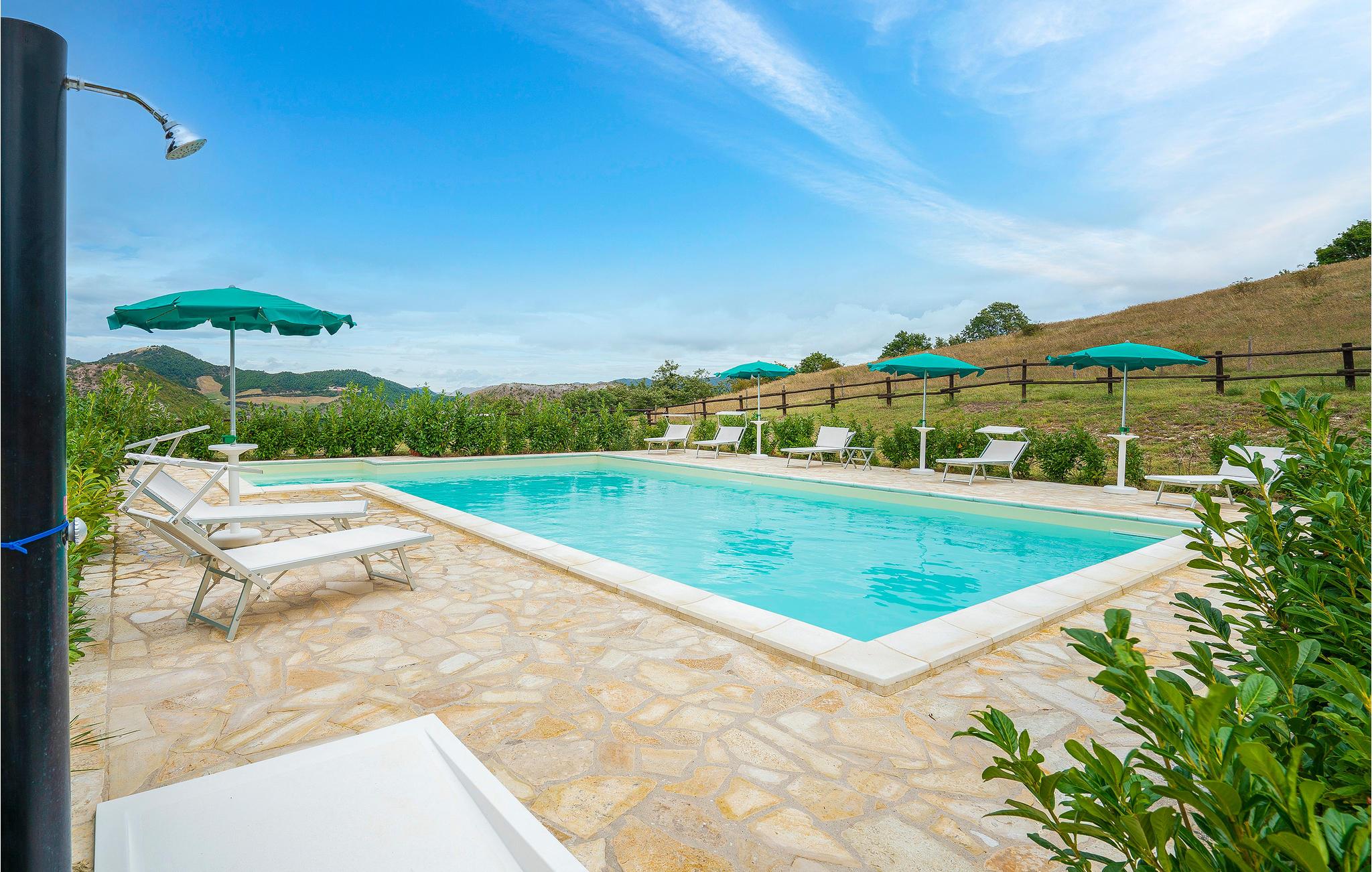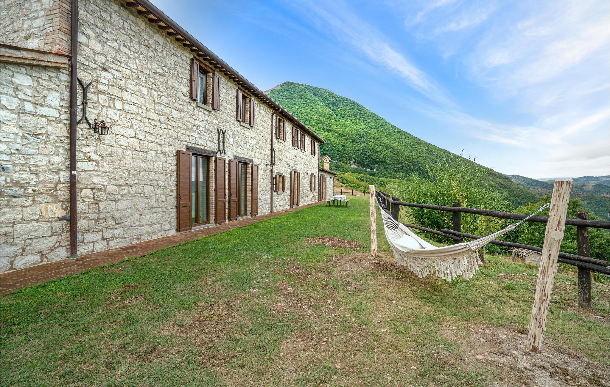 Zwischen Piobbico und Apecchio (je 6 km) liegt dieses komfortable Landhaus auf einem Berg in 800 m Höhe. Die Einzellage ist ideal für Gruppen, die ungestört Ferien in der Natur verbringen möchten. Das ehemalige Bauernhaus wurde stilvoll restauriert und eingerichtet. In den beiden einstigen Ställen im Ergeschoss stehen Ihnen heute zwei große Wohnräume mit langer Tafel, offenem Kamin und Billardtisch zur Verfügung: Ideal auch für Gruppenaktivitäten wie Musizieren, Tanzen, Yoga. Die Schlafzimmer liegen im 1. Stock. Vorm Haus gib es eine überdachte Terrasse mit Barbecue und Pizzaofen. Das weitläufige Grundstück ist vollständig umzäunt. Hier gibt es genug Platz zum Parken, für alle möglichen Ballspiele und hier liegt natürlich auch der Poolbereich, mit Liegestühlen. Von überall haben Sie einen einzigartigen Panoramablick auf den gegenüber liegenden Monte Nerone (1525m) . Wanderwege laden von hier zum Trekken und Biken und führen Sie in die beeindruckende Landschaft, gezeichnet von weiten Wäldern, schroffen Hängen und kühlen Wildbächen. Besichtigen Sie Urbino und Città di Castello (je 35 km) und erobern Sie für sich die kleinen netten Städtchen der Umgebung, wo Sie überall die lokalen Spezialitäten probieren können, als da wären: Trüffelgerichte aller Art, ganz besondere Biersorten, Wildgerichte und leckeren Käse. Zur Abwechslung mal ein Tag an der Adria? Nach Pesaro und Fano sind es 65 km. Zufahrt über 1,6 km unasphaltierte Straße, für tief liegende Autos nicht geeignet.