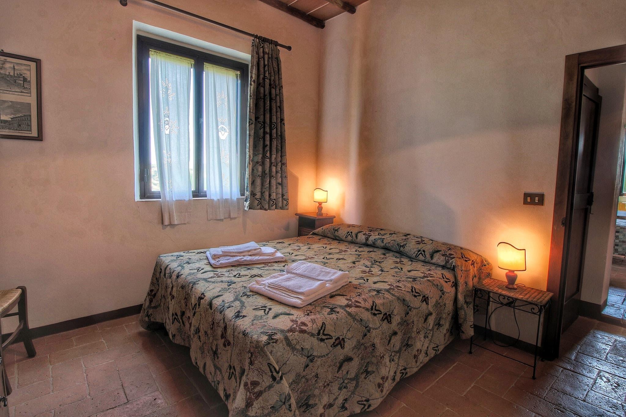 Inmitten der sanften Hügel von Arbia Asciano bietet dieses haustierfreundliche Bauernhaus einen ruhigen Rückzugsort für bis zu acht Gäste und verbindet rustikalen Charme mit modernem Komfort. Im ersten Stock befindet sich ein geräumiges Wohnzimmer mit Kamin, das eine gemütliche Atmosphäre für entspannte Abende schafft. Die gut ausgestattete Küche mit Herd, Dunstabzugshaube, Espressomaschine, Backofen, Mikrowelle und Kühl-Gefrierkombination ermöglicht müheloses Zubereiten von Mahlzeiten. Das Bauernhaus verfügt über vier wunderschön eingerichtete Schlafzimmer – zwei mit Doppelbetten und zwei mit je zwei Einzelbetten – für einen erholsamen Aufenthalt. Zwei Badezimmer mit Dusche, Waschbecken, Toilette, Bidet und Waschmaschine sorgen für zusätzlichen Komfort. Die durchgehende Heizung sorgt für ganzjährigen Komfort und macht dieses Anwesen ideal für alle Jahreszeiten. Gäste können das Leben im Freien mit einer privaten 9 m² großen Terrasse und einem großzügigen Gemeinschaftsgarten mit bequemen Möbeln und einem Grillplatz für Mahlzeiten im Freien genießen. Der große Swimmingpool (14 x 7 m), geöffnet von Juni bis September, lädt zu einem erfrischenden Rückzugsort unter der Sonne der Toskana ein. Für alle, die die Gegend erkunden möchten, bietet das Bauernhaus eine ideale Lage, nur 13 km von Siena entfernt. Charmante Dörfer und die malerische Landschaft sind leicht zu erreichen. Naturliebhaber können Wanderwege erkunden, während Kulturbegeisterte historische Stätten in den nahegelegenen Städten besuchen können. Das gastronomische Angebot ist vielfältig. Nur 4 km entfernt befinden sich Restaurants mit authentischer toskanischer Küche. Genießen Sie traditionelle Gerichte aus frischen regionalen Zutaten. Öffentliche Verkehrsmittel bieten eine bequeme Anbindung an die umliegenden Sehenswürdigkeiten. Ob Sie im Garten entspannen, lokale Spezialitäten genießen oder die malerische Landschaft der Toskana entdecken – dieses Bauernhaus bietet die perfekte Mischung aus Komfort und Abenteuer für einen unvergesslichen Aufenthalt.