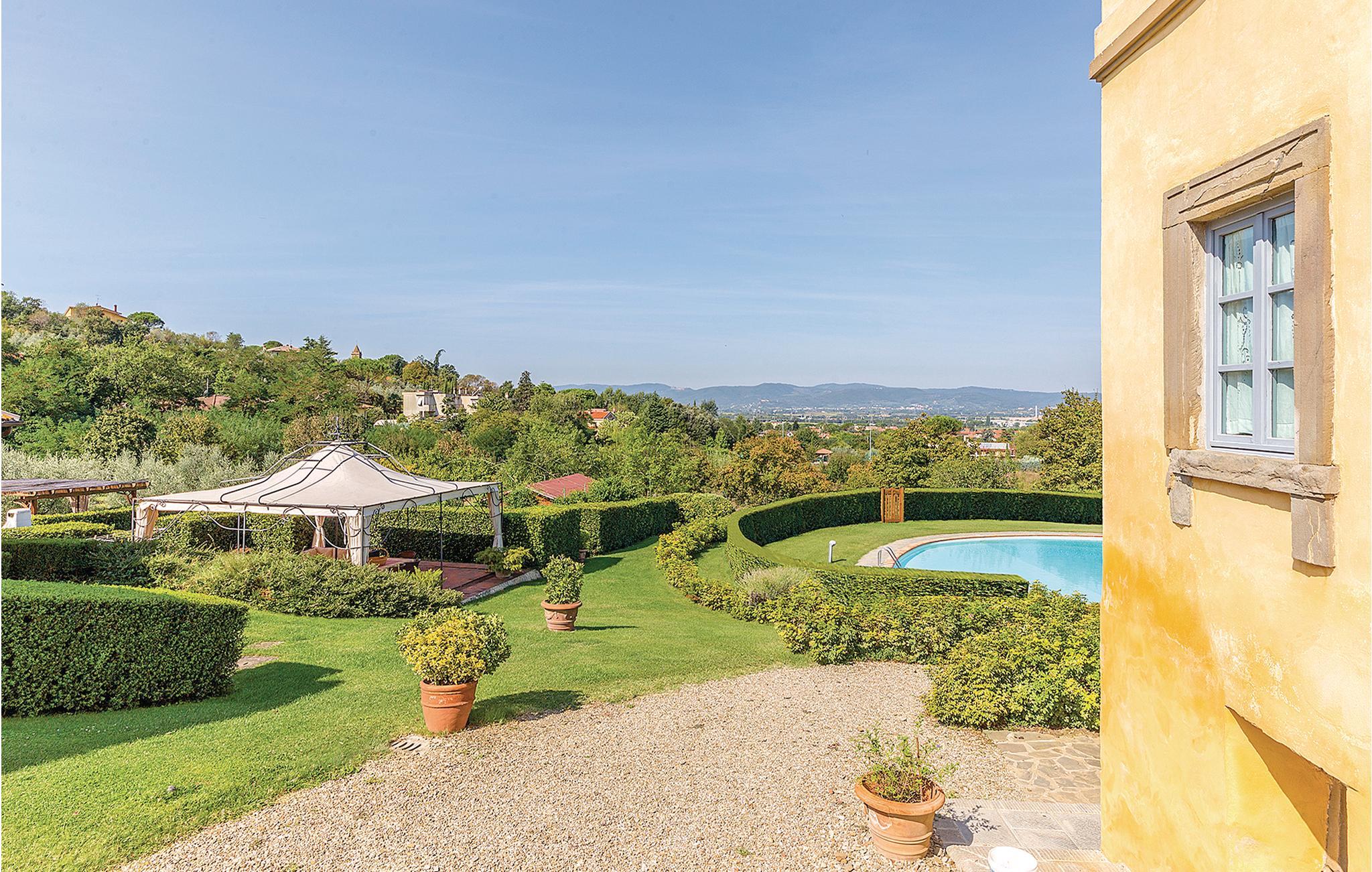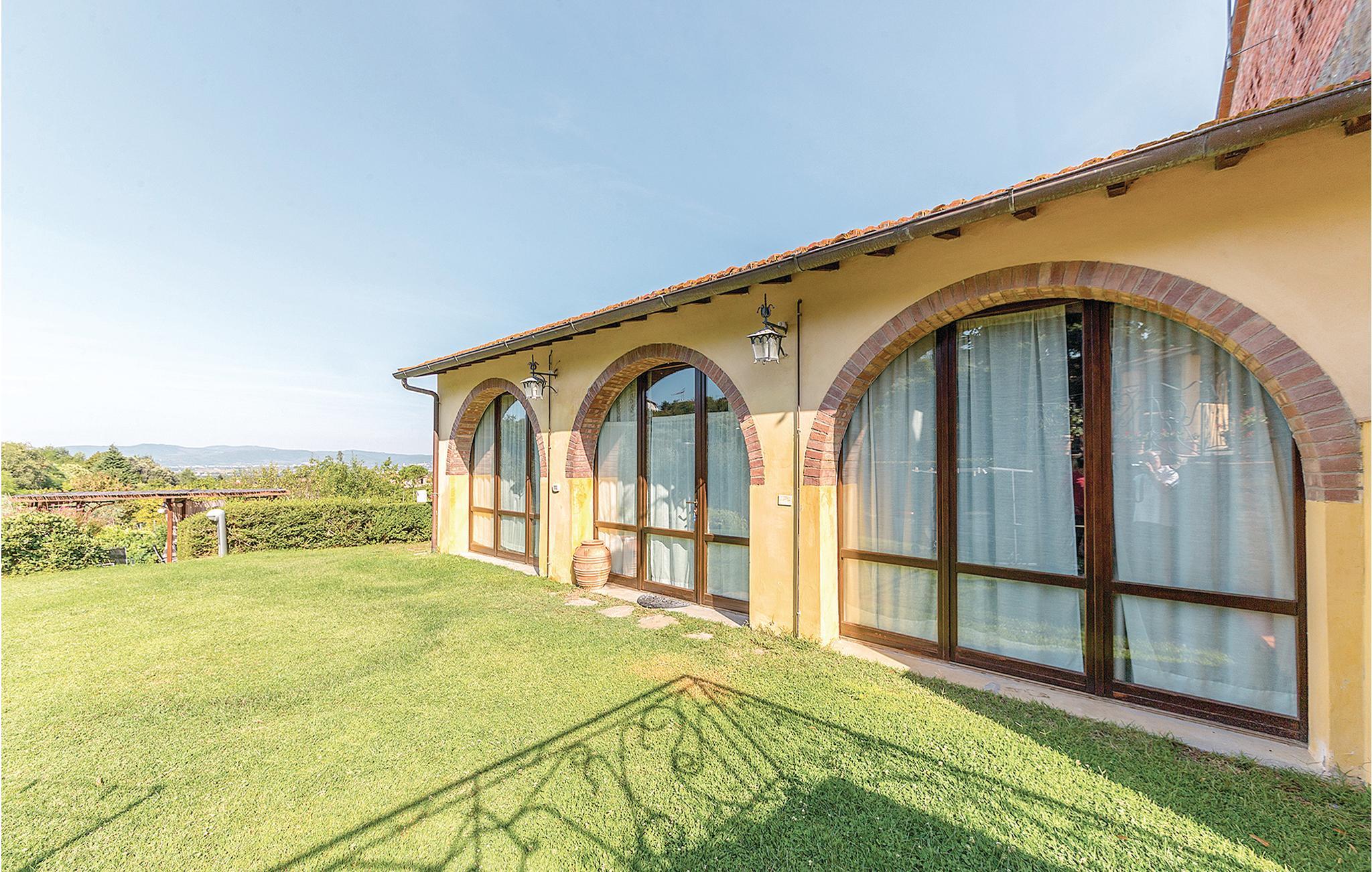 Etwa 7 km von Arezzo: Zwei originelle Ferienwohnungen (S. auch ITA116) mit großem Pool und weitem Blick über das Chiana-Tal. Die beiden geschmackvoll eingerichteten Ferienwohnungen sind im bäuerlichen Nebengebäude einer ehrwürdigen toskanischen Villa entstanden. Jede Wohnung hat auf dem großen parkähnlichen Grundstück einen eigenen Gartenbereich mit Sitzplatz und Barbecue. Besonders der große, rund geschwungene Pool ist ein Traum! Von den Sonnenterrassen genießen Sie einen weiten Blick über das Tal. Von hier aus erreichen Sie im Nu die alten Etruskerstädte Arezzo und Cortona (18 km) mit ihren berühmten Museen und Kirchen in der malerischen Altstadt, die zum Flanieren und zum Aperitivo auf der Piazza einlädt. Für einen Tagesausflug nach Florenz (70 km) und Rom (200 km) empfehlen sich auch die günstigen Bahnverbindungen von Arezzo aus. Den Lago Trasimeno mit seinen Sandstränden und romantischen Inselchen erreichen Sie in weniger als einer halben Stunde (30 km).