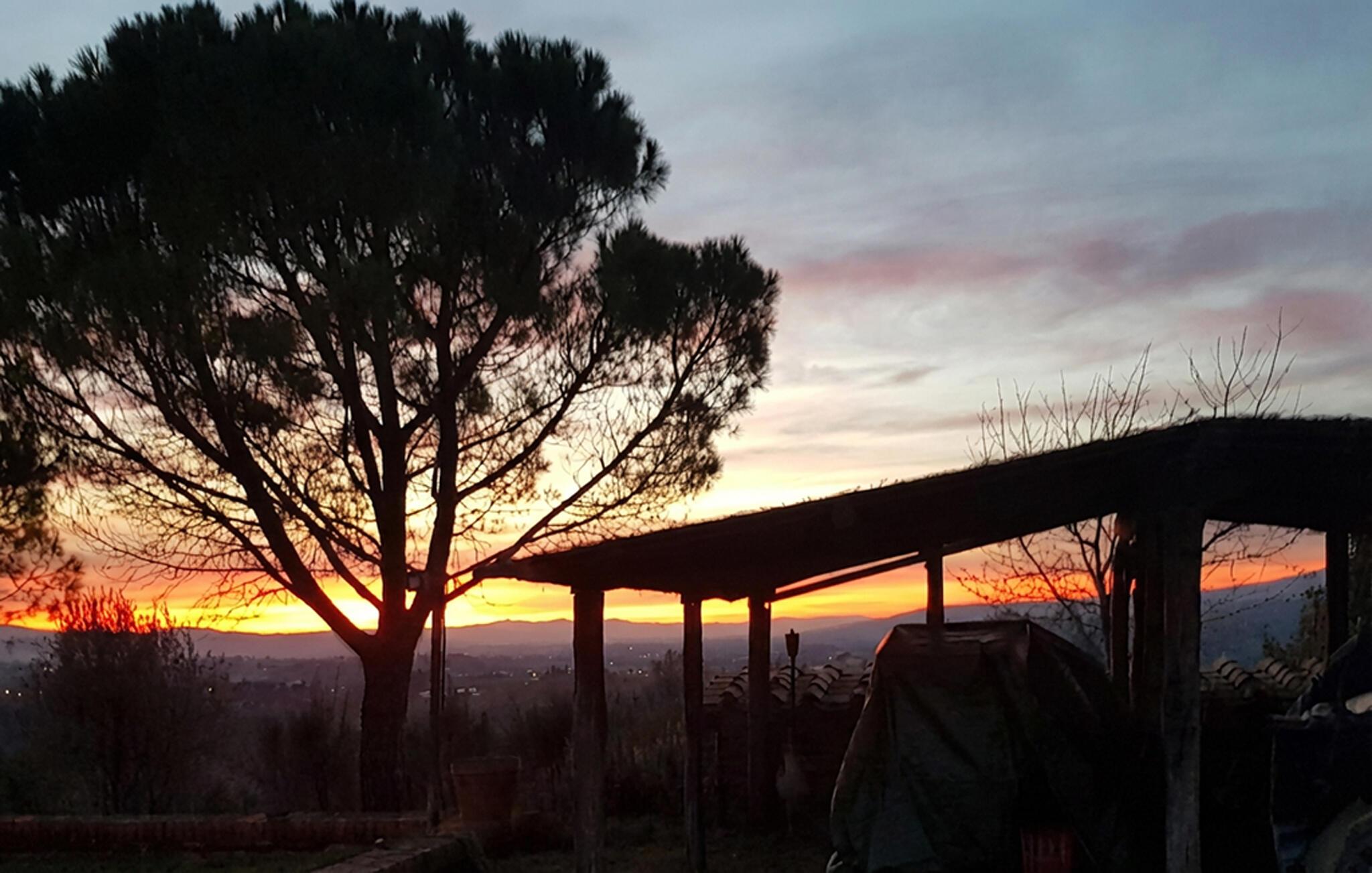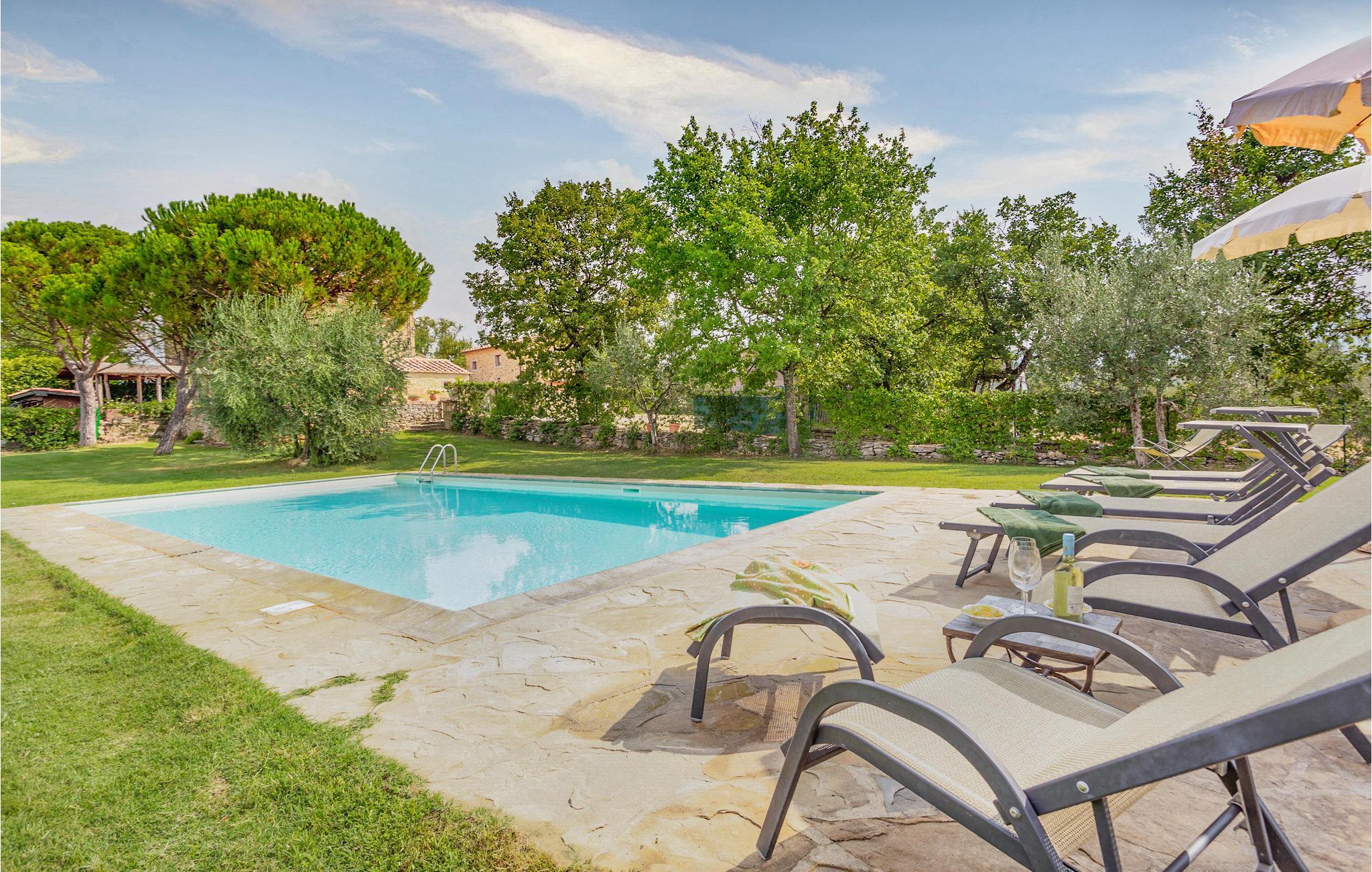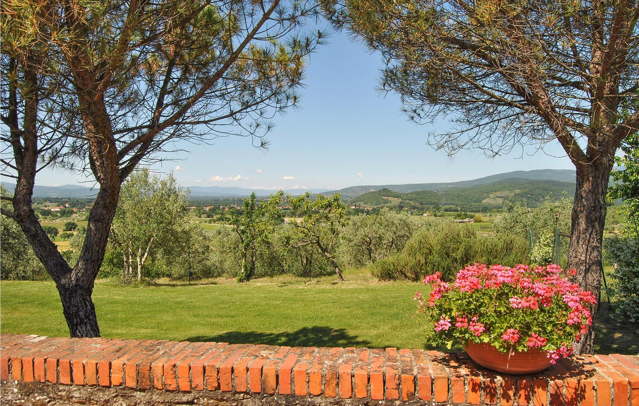 Das große Grundstück ist vollständig umzäunt - Garten, Spiel- und Poolbereich stehen Ihnen exklusiv zur Verfügung! Den Mittelpunkt der Wohnung bildet der große Wohnbereich mit offener Küche, durch Rundbögen unterteilt. Drei Schlafzimmer mit Ausgang zum Garten (eines davon ein Durchgangszimmer) und zwei Bäder schließen sich an. Auf dem Grundstück finden Sie überdachte Sitzplätze, ein Barbecue, ein Volleyballfeld, Tischfußball und Tischtennis stehen zur Verfügung. Der Poolbereich mit Terrassen und Liegestühlen ist ebenfalls umzäunt. Von überall genießen Sie einen weiten Blick über die Olivenhaine in die malerische Landschaft, bis nach Arezzo.