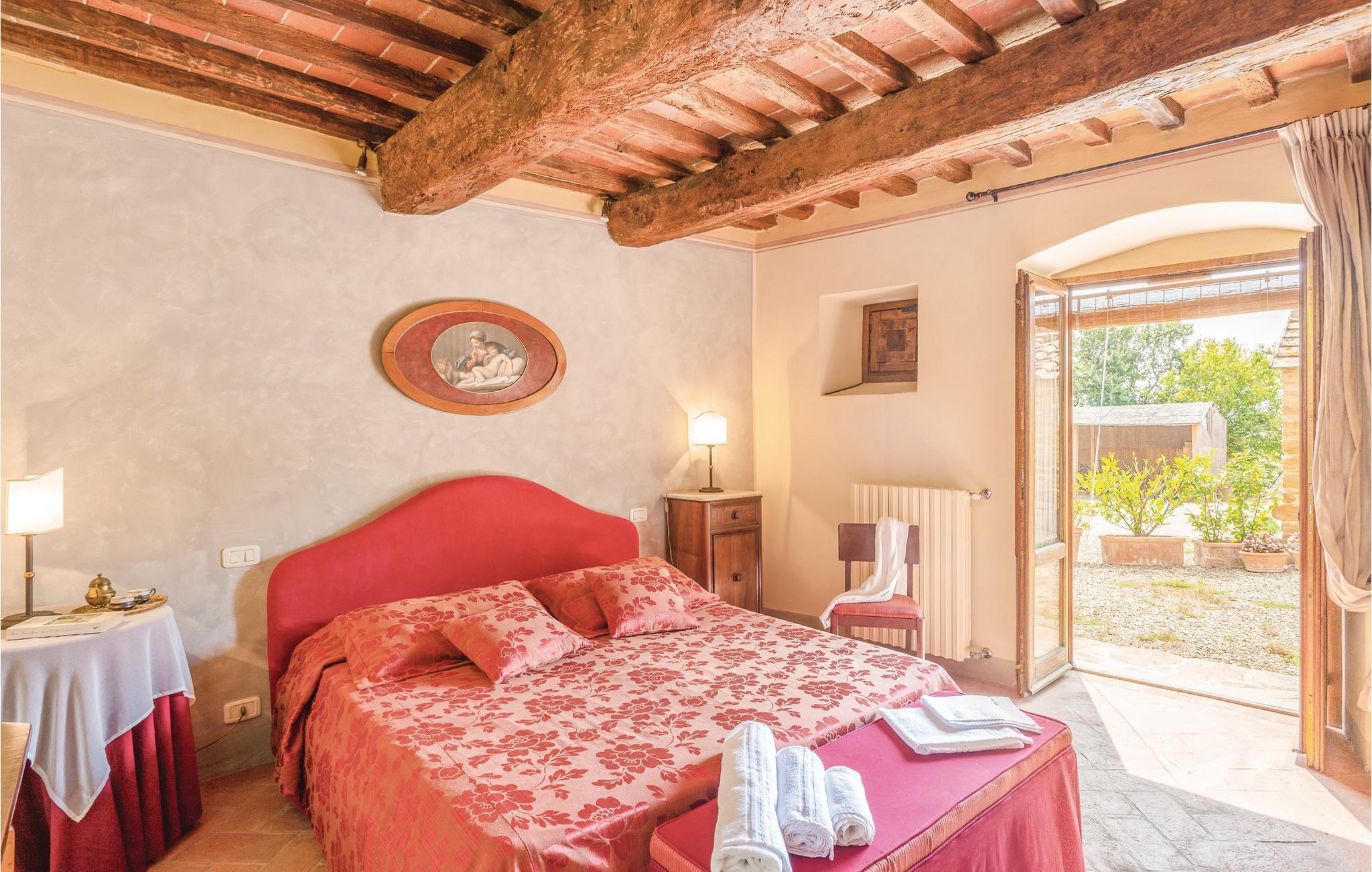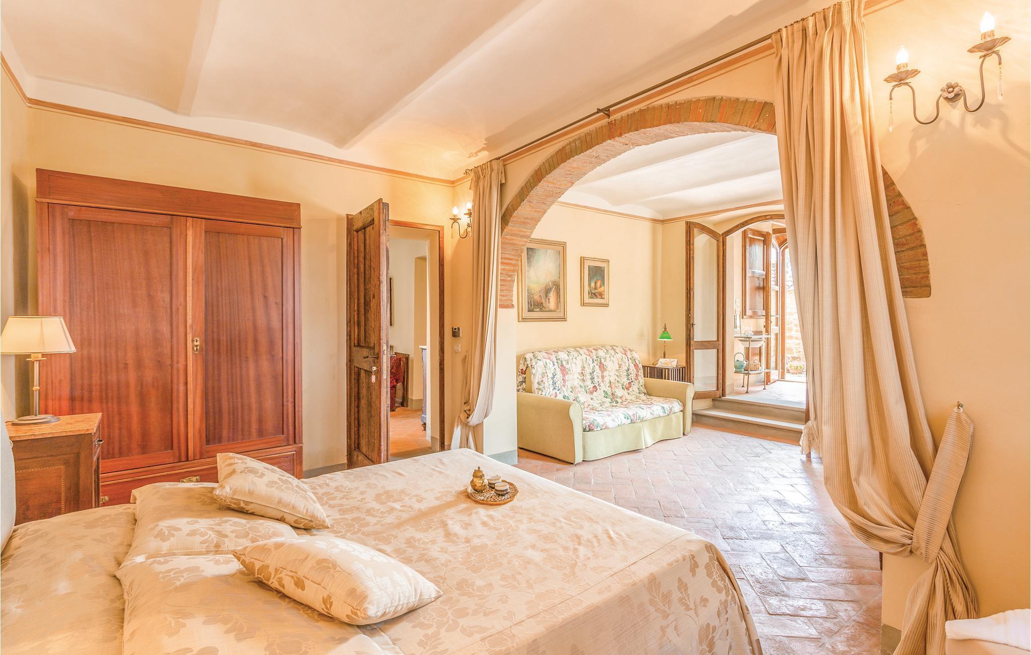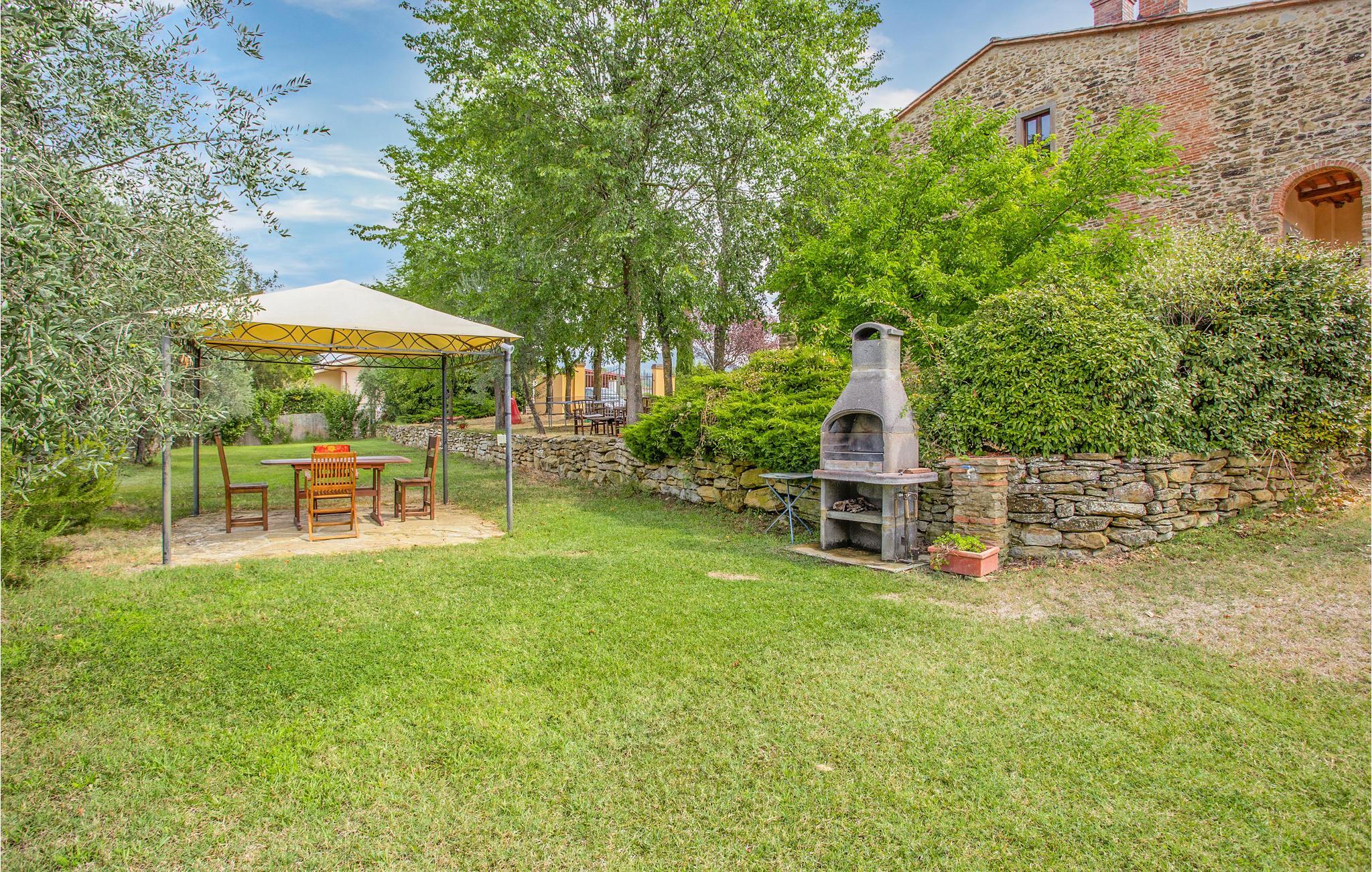 Das große Grundstück ist vollständig umzäunt - Garten, Spiel- und Poolbereich stehen Ihnen exklusiv zur Verfügung! Den Mittelpunkt der Wohnung bildet der große Wohnbereich mit offener Küche, durch Rundbögen unterteilt. Drei Schlafzimmer mit Ausgang zum Garten (eines davon ein Durchgangszimmer) und zwei Bäder schließen sich an. Auf dem Grundstück finden Sie überdachte Sitzplätze, ein Barbecue, ein Volleyballfeld, Tischfußball und Tischtennis stehen zur Verfügung. Der Poolbereich mit Terrassen und Liegestühlen ist ebenfalls umzäunt. Von überall genießen Sie einen weiten Blick über die Olivenhaine in die malerische Landschaft, bis nach Arezzo.