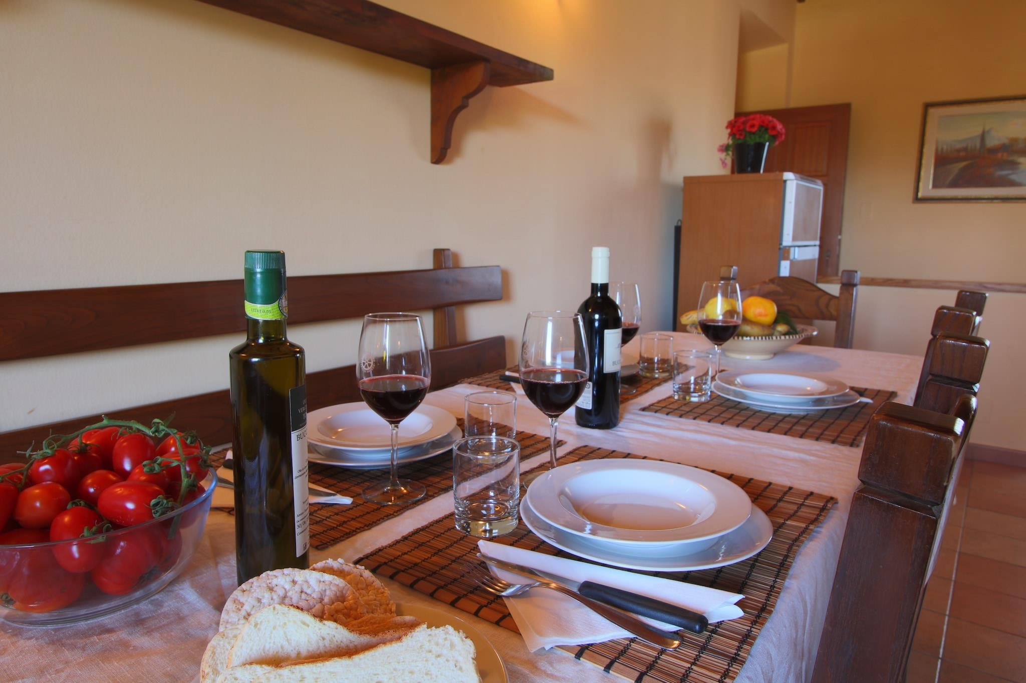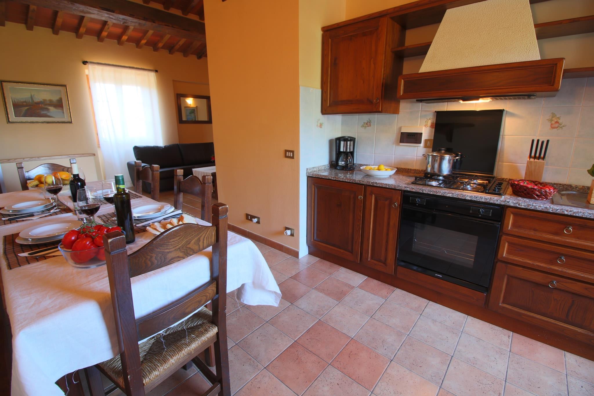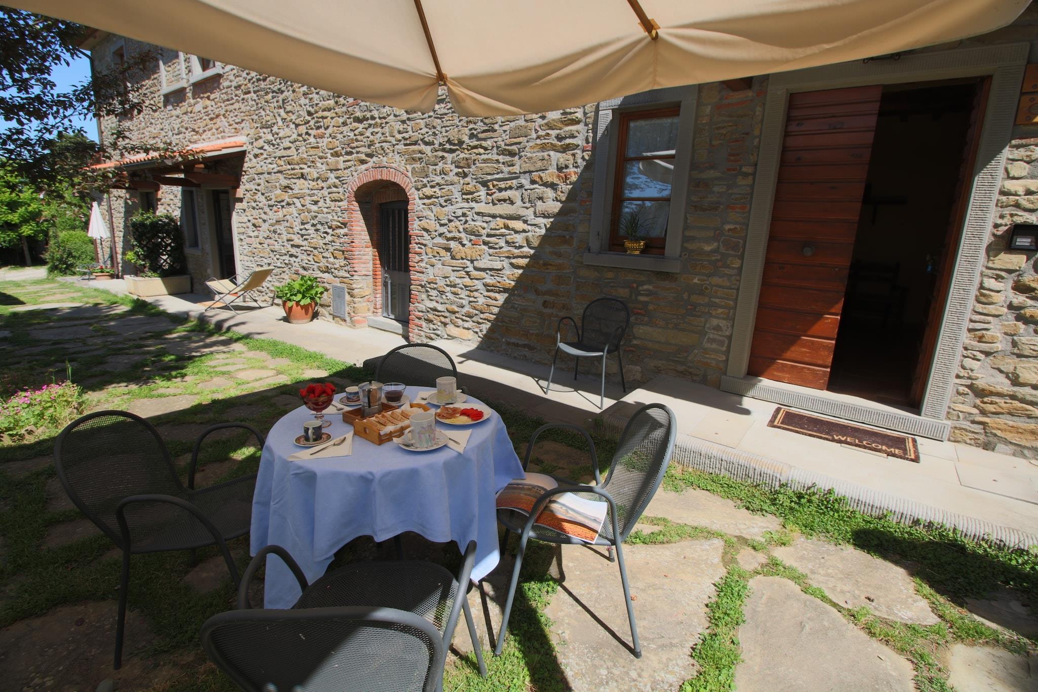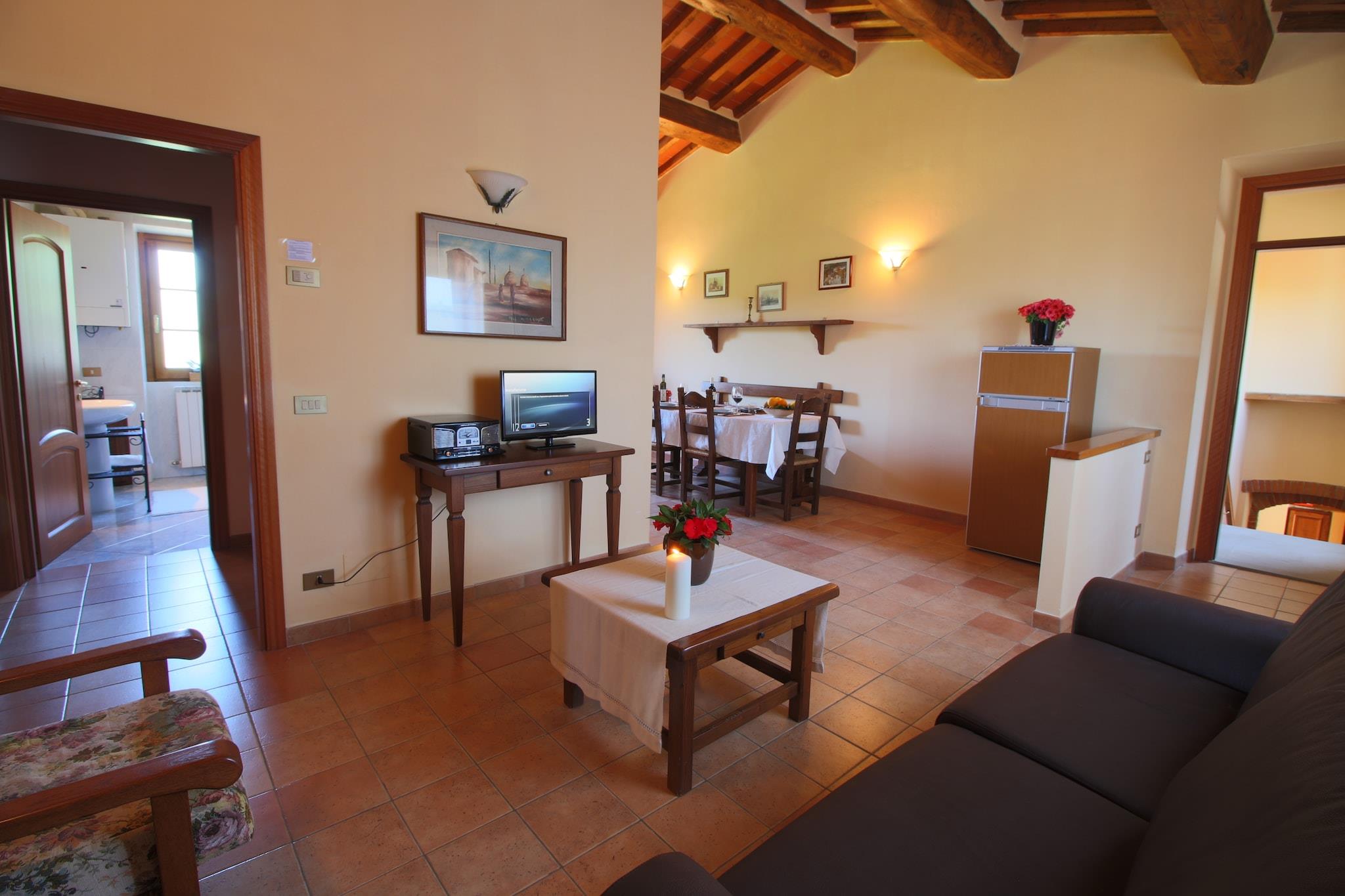 Dieses Bauernhaus in Campriano verfügt über 2 Schlafzimmer und bietet bequem Platz für 5 Personen. Es ist ideal für Familien mit Kindern, die in einer hügeligen Region mit herrlicher Aussicht übernachten möchten. Ein Gemeinschaftspool und eine Zentralheizung laden zum Entspannen ein. Sie befinden sich in der Nähe der mittelalterlichen Städte Arezzo und Anghiari, die Sie erkunden und ihre Geschichte kennenlernen können. Der Ort ist für seine preisgekrönten Weine bekannt. Zahlreiche Weinproben bieten die Möglichkeit, Sangiovese-, Merlot-, Malvasia- und Sauvignon-Blanc-Trauben zu bewundern. 50 Hektar Weinberge liegen hier. Genießen Sie einen Spaziergang im nahegelegenen Wald (500 m). Restaurants erreichen Sie nach 2 km und einen Supermarkt nach 4 km. Das Bauernhaus strahlt eine gemütliche und typisch toskanische Atmosphäre aus. Die moderne Küche verfügt über einen Backofen zum Backen von Köstlichkeiten und einen Kamin für wohlige Wärme. Die gesamte Anlage ist mit Zentralheizung ausgestattet. Kinder können sich im Garten mit Spielgeräten vergnügen. Abends können Sie auch grillen. Öffentliche Verkehrsmittel sind 4 km entfernt.