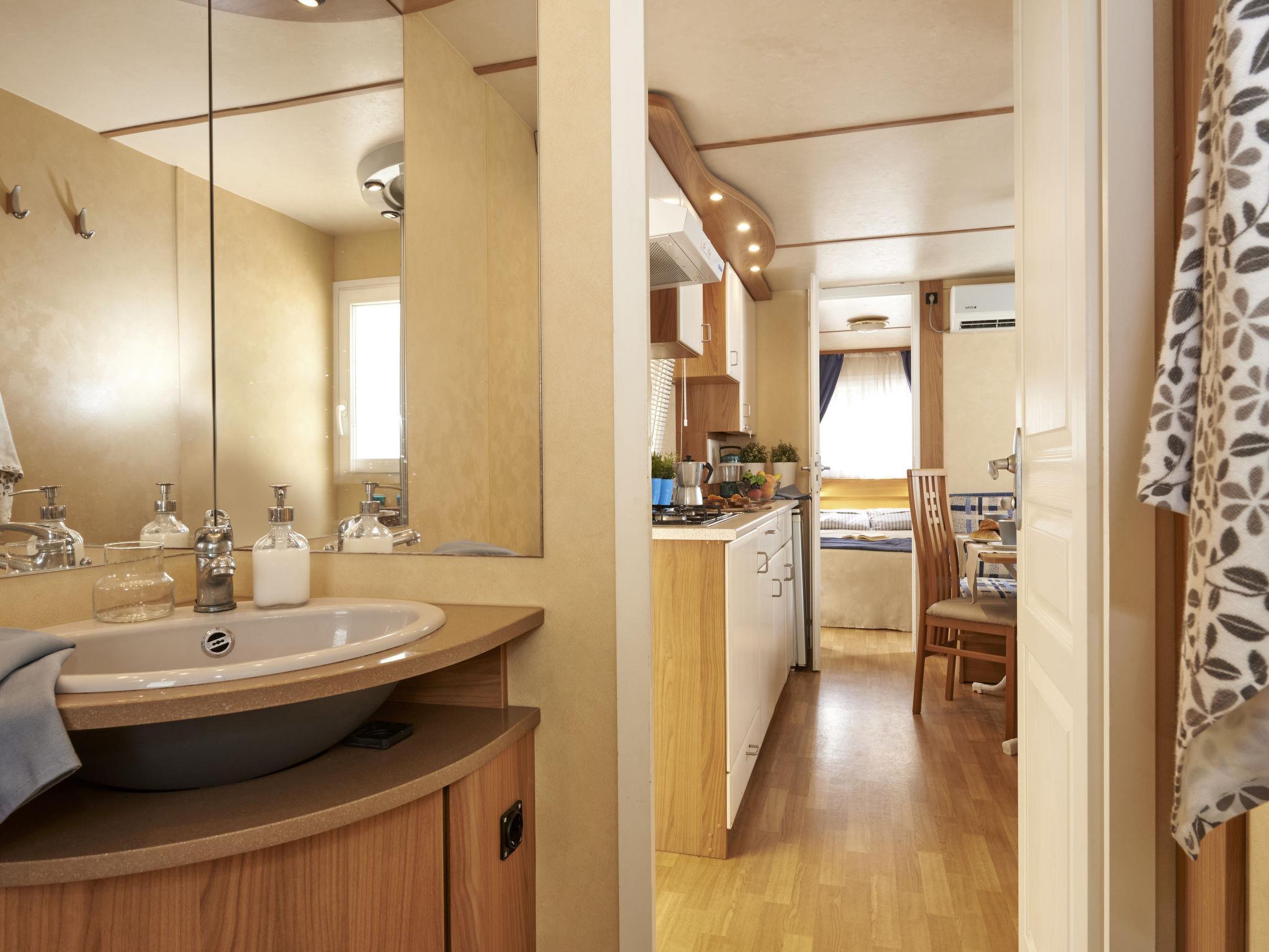 "Deluxe", 3-Zimmer-Mobilheim 25 m2. Objekt geeignet für 4 Erwachsene + 2 Kinder. Zweckmässig eingerichtet: Wohn-/Schlafzimmer mit 1 Doppeldiwanbett (140 cm), Esstisch, Küchenblock, Sat-TV und Klimaanlage. Ausgang zur Terrasse. 1 Zimmer mit 1 franz. Bett (140 cm), sep. WC. 1 Zimmer mit 2 Betten (70 cm). Offene Küche (4 Flammen). Dusche/WC. Klimaanlage (extra). Keine Heizmöglichkeit. Terrasse überdacht. Terrassenmöbel, Liegestühle (1). Parkplatz (1 Auto). Bitte beachten: Nichtraucher-Unterkunft. IT061088B3LUIBMCPY