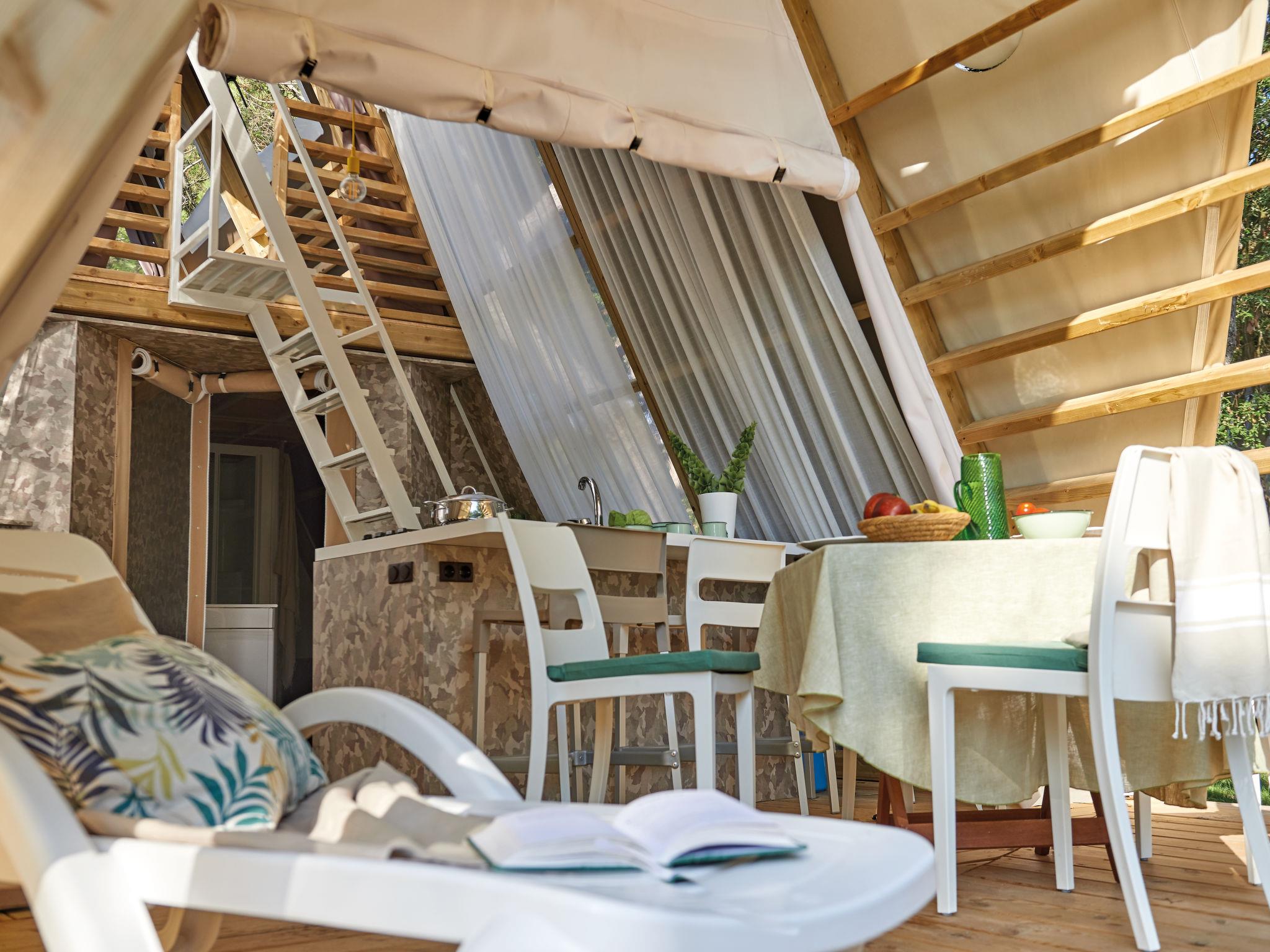 "Luxury Tent", 3-Zimmer-Chalet 36 m2 auf 2 Stockwerken, im erhöhten Erdgeschoss. Objekt geeignet für 4 Erwachsene + 1 Kind. Komfortabel eingerichtet: abgeschrägter, offener Eingang mit 1 Diwanbett und Küchenblock. Abgeschrägt 1 Zimmer mit 1 franz. Bett (140 cm). Offene Küche (4 Flammen). Dusche/WC. Obergeschoss: (steile Treppe) abgeschrägte, offene kleine Galerie mit 2 Betten (70 cm). Klimaanlage (extra). Keine Heizmöglichkeit. Holzdielenboden. Terrasse teilweise überdacht. Terrassenmöbel, Liegestühle (1). Parkplatz (1 Auto). Bitte beachten: Nichtraucher-Unterkunft. IT061088B3LUIBMCPY