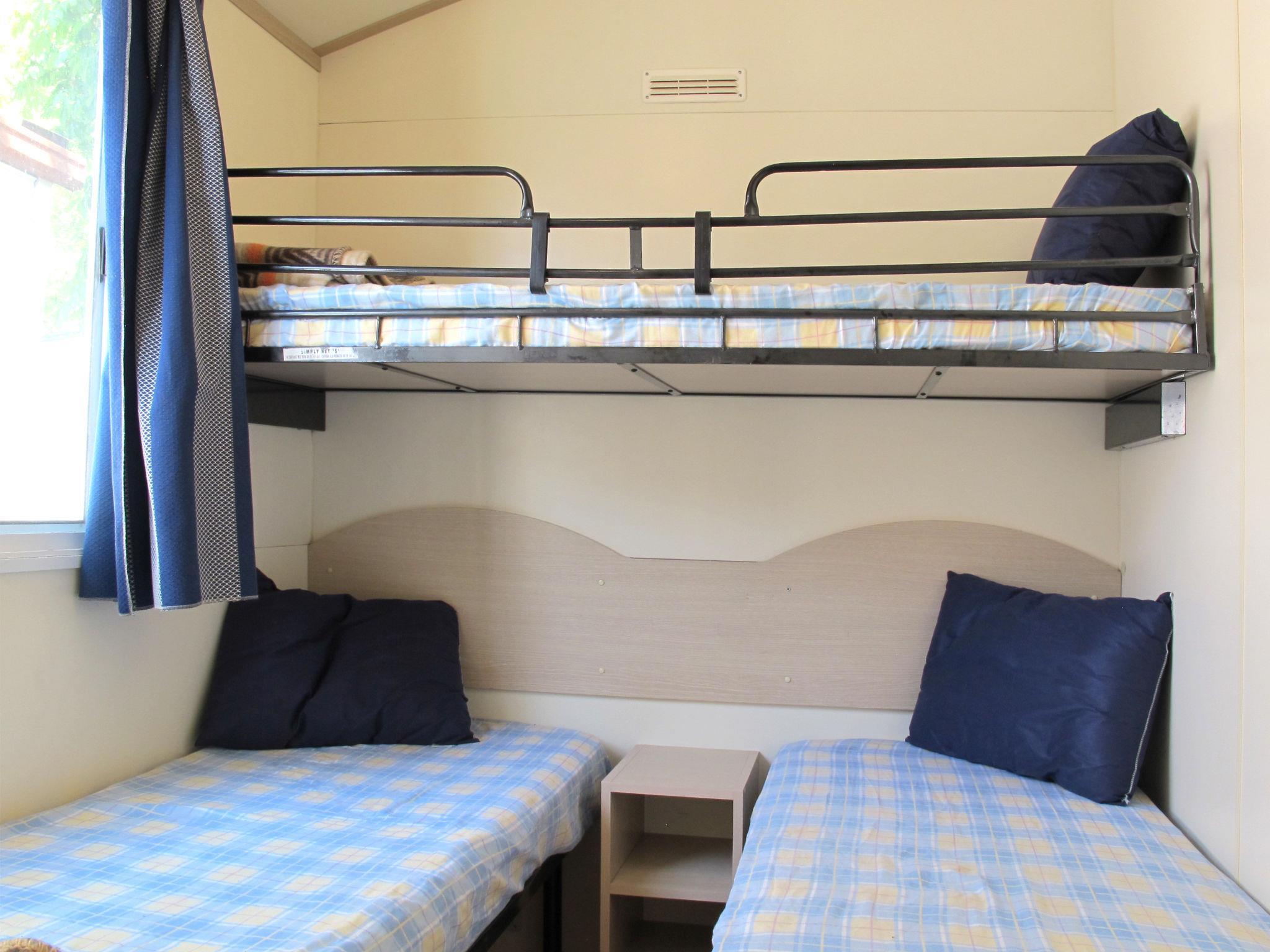 "Happy Easy", 3-Zimmer-Mobilheim 25 m2. Objekt geeignet für 4 Erwachsene + 1 Kind. Zweckmässig eingerichtet: Wohn-/Schlafzimmer mit 1 Schlafmöglichkeit, Esstisch, E-Heizung und Klimaanlage. 1 Zimmer mit 1 franz. Bett (140 cm, Länge 190 cm). 1 Zimmer mit 2 Betten (70 cm, Länge 190 cm), 1 x 1 Etagenbetten (65 cm, Länge 179 cm). Offene Küche (4 Kochplatten). Dusche/WC. Klimaanlage (extra). Terrasse teilweise überdacht. Terrassenmöbel, Elektrogrill (mobil), Liegestühle (2). Zur Verfügung: Fliegengitter. Parkplatz (1 Auto). Bitte beachten: Nichtraucher-Unterkunft. IT023006B1R3TLSM4E