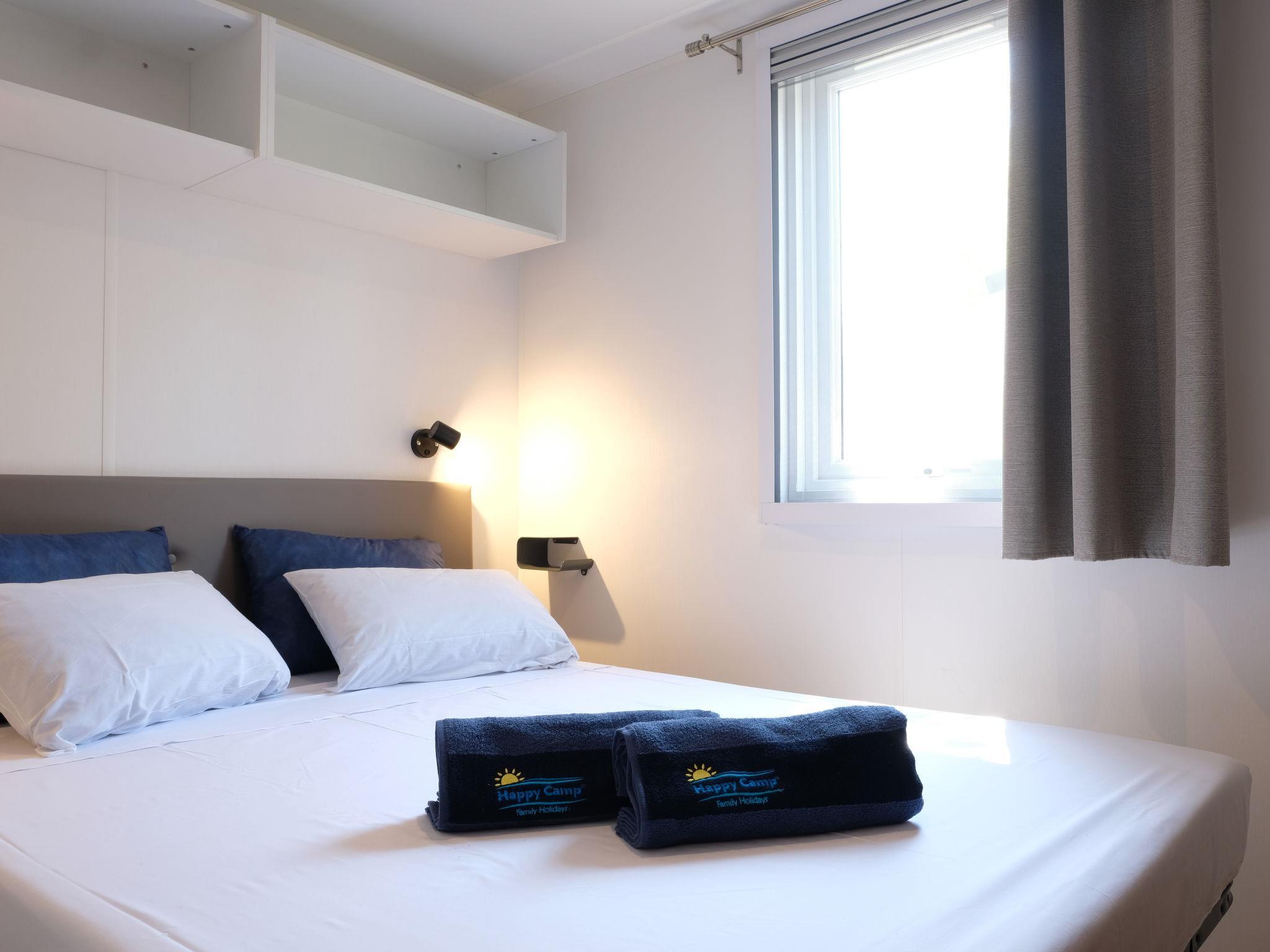 "Happy Premium Suite", 4-Zimmer-Mobilheim 30 m2. Komfortabel eingerichtet: Wohn-/Schlafzimmer mit Esstisch, E-Heizung und Klimaanlage. 1 Zimmer mit 1 franz. Bett (140 cm, Länge 190 cm). 2 Zimmer, jedes Zimmer mit 2 Betten (70 cm, Länge 190 cm). Offene Küche (4 Kochplatten, Mikrowelle, Tiefkühler, elektrische Kaffeemaschine). Dusche/WC. Klimaanlage (extra). Terrasse teilweise überdacht. Terrassenmöbel, Elektrogrill (mobil), Liegestühle (2). Zur Verfügung: Fliegengitter. Parkplatz (1 Auto). Bitte beachten: Nichtraucher-Unterkunft. IT023006B143AX8QZE