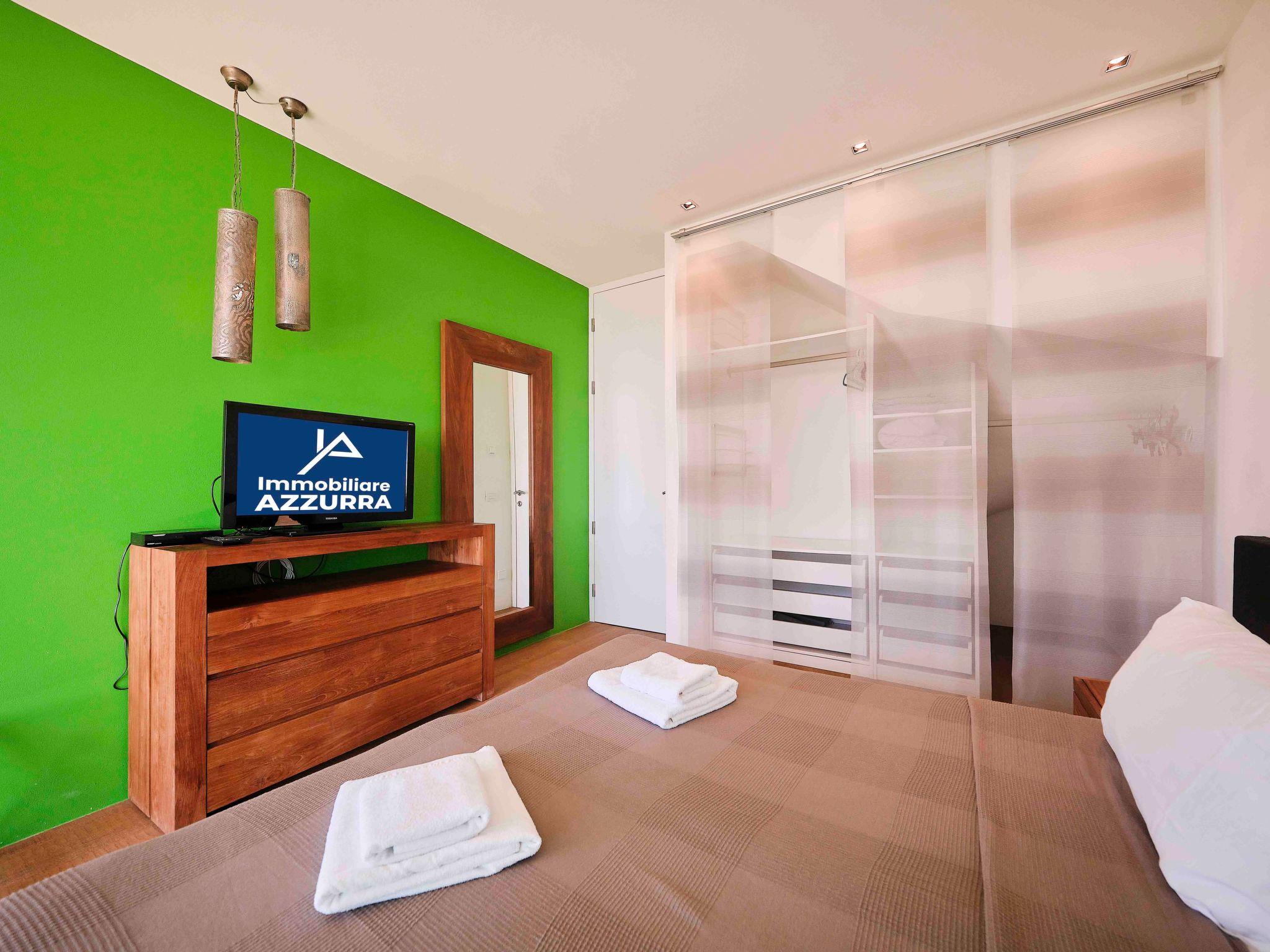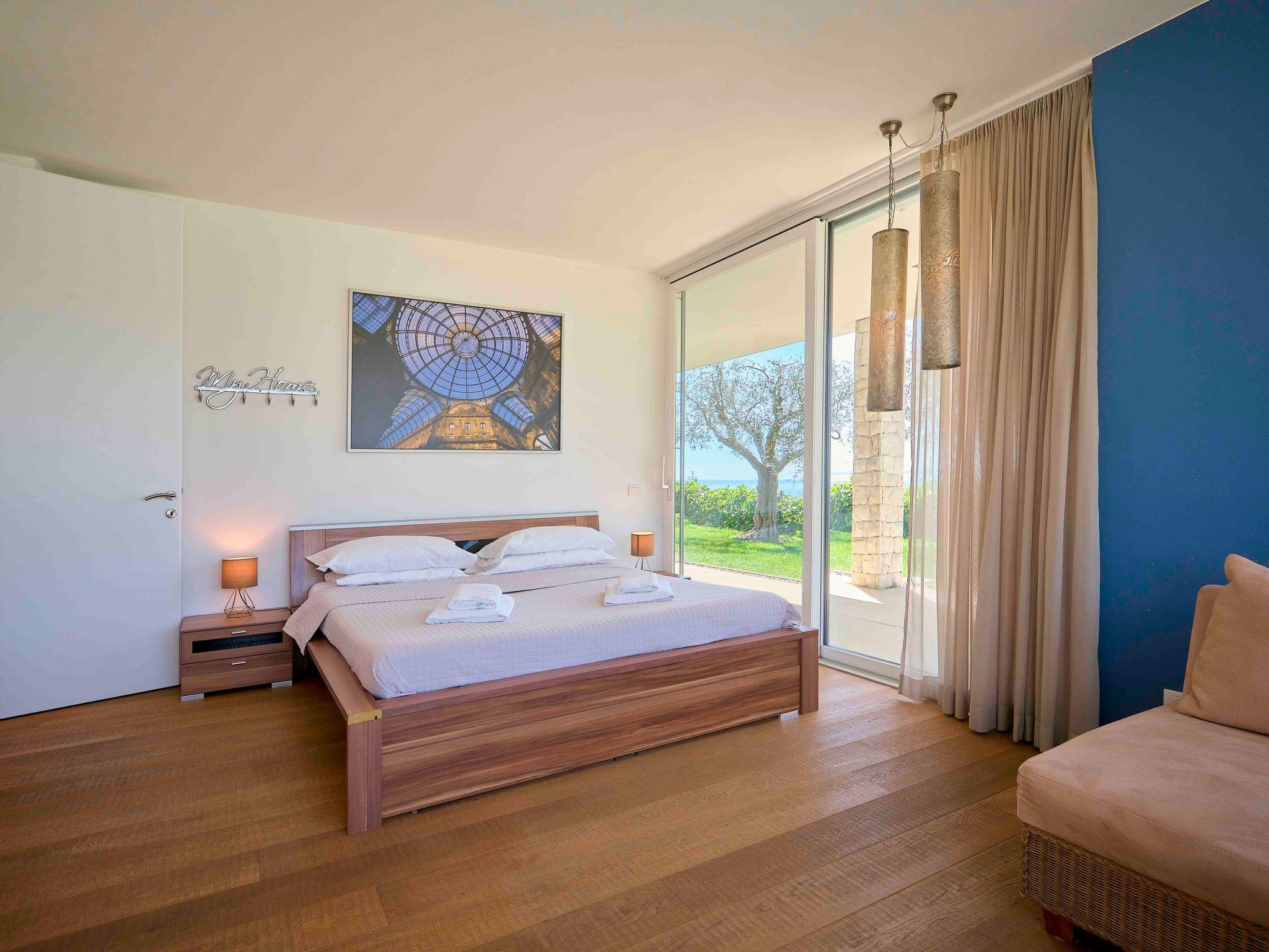 Die Villa ist vertikal in 2 Wohnungen aufgeteilt. Wir vermieten das Haus mit Blick auf das Schwimmbad (3,5 x 10 Meter), das maximal 8 Personen beherbergen kann. Der Eingang befindet sich im Obergeschoss und besteht aus einem Wohnzimmer mit Sofa (umwandelbar in ein Schlafsofa 160 x 200 cm), Essbereich mit Kochnische und einem Badezimmer. Im Erdgeschoss, das über eine bequeme Treppe zu erreichen ist, befinden sich 3 Schlafzimmer, von denen zwei mit einem Doppelbett 180 x 200 cm ausgestattet sind, während das dritte Schlafzimmer 2 Einzelbetten und 2 weitere Klappbetten darunter hat. Auf der gleichen Etage befinden sich auch 2 große Badezimmer, beide mit Dusche. Die Küche ist brandneu und mit Geschirrspüler, Induktionskochfeld, Backofen, Kühlschrank und Gefrierschrank ausgestattet. Das Anwesen ist mit Klimaanlage, Sat-TV, Wi-Fi, elektrische Rollläden, elektrische Markisen auf der Terrasse und Grill ausgestattet.
