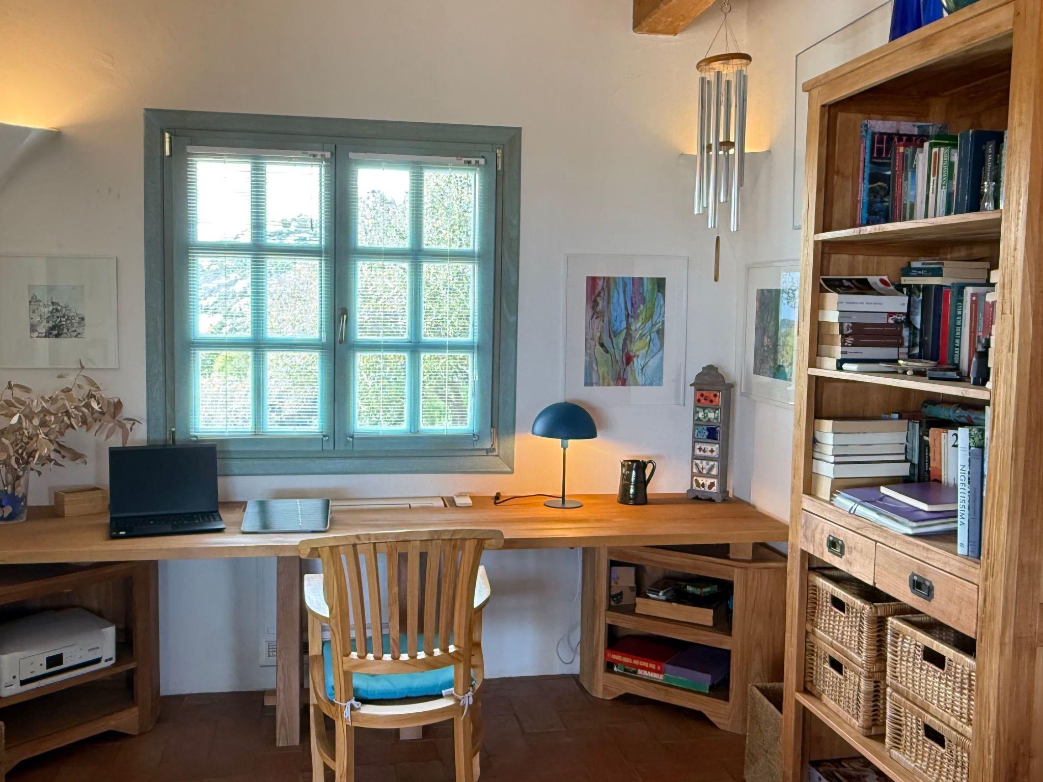 Ein integriertes Homeoffice mit kostenlosem schnellem Internet erlaubt ungestörtes Arbeiten. Vom offenen Wohnbereich mit Kamin hat man einen großartigen Blick weit über Land und Meer. Über dem Wohnbereich führt eine kleine Treppe zur Empore für den ungestörten Rückzug mit Couch und Lesesessel. Der Essbereich in unmittelbarer Nähe zur geräumigen, offenen Küche hat einen Zugang zu Terrasse und Pool. Im hinteren Teil befinden sich noch zwei Schlafzimmer und zwei Bäder. Wäschewechsel alle 14 Tage.