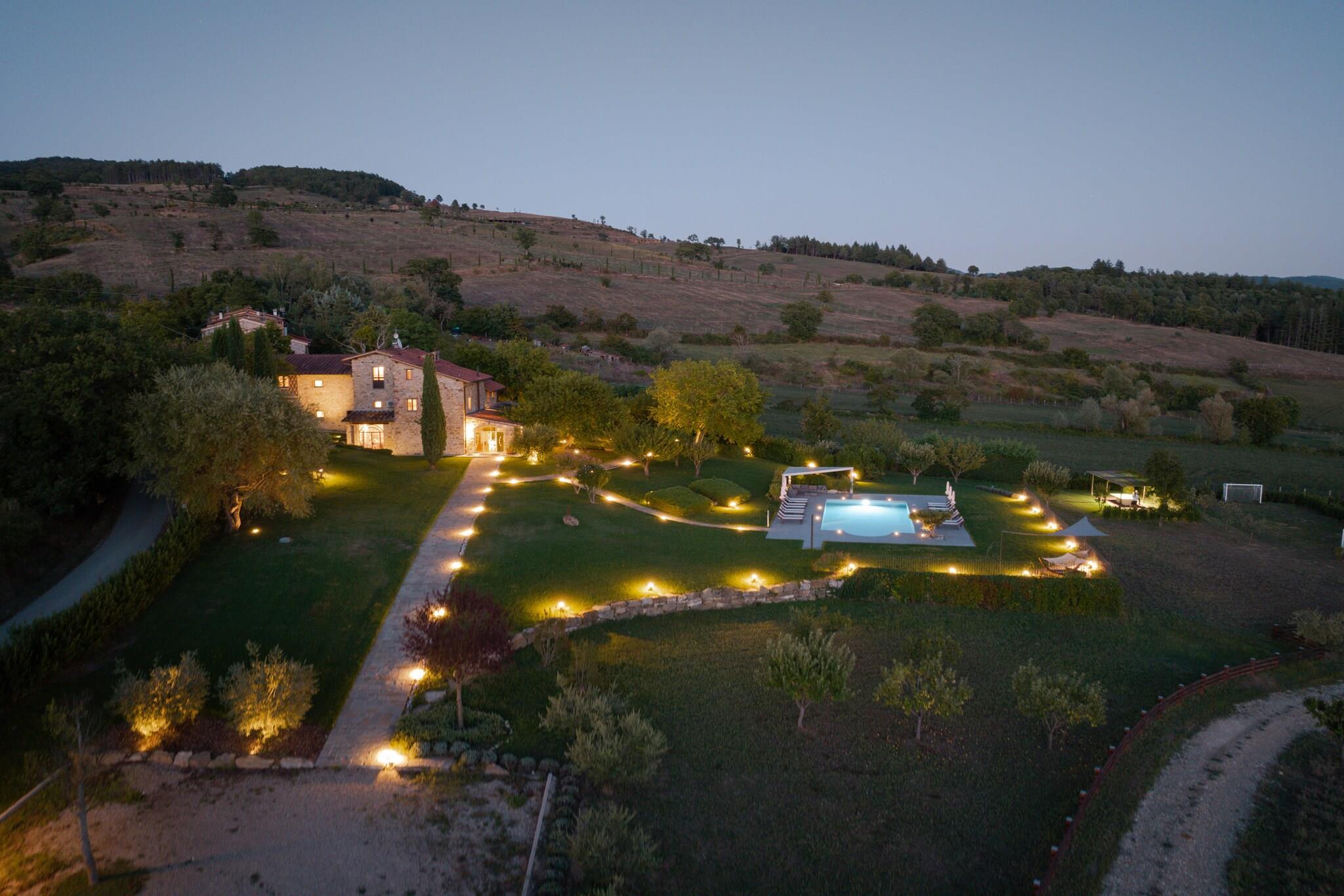 The interior is fully furnished and is characterized by a bright open-space that connects the living room to the kitchen with the garden view. On the ground floor you will find a room framed and embellished by a majestic fireplace flanked by three comfortable sofas, a satellite TV, a studio designed for those who love reading, a bathroom and a kitchen suitable for all your needs. It is divided into three floors connected by rustic stone stairs and consists of 12 modern and spacious double bedrooms with 12 private bathrooms. The whole house is provided with Wi-Fi. The Tuscan structure being surrounded by clean and fresh air does not need air conditioning and you can keep the windows open, equipped with mosquito nets in every room. The interior design wisely combines antique and modern furniture. In all rooms you will find massive solid wood beams and the terracotta attic and floors together with plenty of processed chestnut wood, emphasize the rustic character of this villa. The holiday home is provided with 12 double bedrooms with panoramic view of the area and 12 private bathrooms equipped with bed linen and shower. The rooms are located on the first, second and third floors and are connected by stone stairs. On the first floor there are two large suites and one suite with a double sofa bed, suitable for children who would like to sleep next to their parents. This room has a glass door through which you have access to an exclusive courtyard, ideal for an aperitif for two. On the second floor there are four double bedrooms and on the third floor there are three double bedrooms too, all with a private bathroom. On the top floor there is a double bedroom and an additional twin bedroom, which opens onto a second bedroom with a double bed suitable for two children. All of them have a private bathroom. The rooms are furnished in a modern rustic style that reflects the luxury of the structure and the simplicity of Tuscany. Each room has the name of a town, recalling the Casentino history. We have carefully and precisely chosen the best quality products for you. The living room has a bright and cozy entrance with a view of the entire property and the valley. It is equipped with armchairs and sofas that have been handcrafted by a historic local company. In the living room you will find many beautifully designed lamps, the master fireplace and a 4K satellite TV where you can watch documentaries, movies and cartoons. Subscriptions to Netflix and Amazon Prime are included too. The kitchen is located on the ground floor where it forms an open-space with the living room. Next to it you will find a guest bathroom and a secondary entrance leading to the garden. Bright and welcoming are the features that strike at first glance. The uniquely designed kitchen is equipped with customized furniture. There is an electric oven, gas hob with five burners, large fridge with freezer, microwave, dishwasher and refrigerator cellar with red and white wines department. From the kitchen you get to an adjoining room where there is a pizza oven and there is plenty of space for food and drink supplies. The windows that flank the dining table show a breathtaking view of the garden and pool. The kitchen has been made to celebrate and enjoy your stay trying to cook or calling a real chef. If you would like to be spoiled by a local chef with a Tuscan/Italian menu to celebrate and enjoy a special evening, we can arrange it for you. On the outside, thanks to an enchanting garden of 25000 square meters made of cypresses, olive trees and oleanders, you will be immersed in the valley’s nature. The illuminated pool (16m x 5m x 1,5m) with panoramic view, gazebo, umbrellas and comfortable sun beds will make you live a unique experience. The sofas by the pool, the outdoor shower and the large hammock will offer you comfort and relaxation for the entire duration of the holiday. Two stunning solid oak wooden tables are located in the large roofed veranda and are perfect to have lunch, dinner, to celebrate and spend time in case of bad weather. Near the veranda is the masonry barbecue area, ideal for grills with family and friends. The view focuses on the imposing gelso tree (which gives name to the structure) in front of the villa. The scenic lighting throughout the garden and around the swimming pool creates a suggestive atmosphere. In the large covered veranda there are two magnificent solid oak tables. Ideal to sit comfortably while celebrating and eating all meals with the whole group. The view falls on the imposing tree directly in front, which gives name to the holiday structure: Il Gelso. Next to the veranda is the brick barbecue area, perfect for your barbecues. Enjoying the mild summer evenings here with friends or family members is definitely the highlight of every holiday day. The picturesque lighting throughout the garden and around the pool makes these evenings unforgettable. In the center of the well-kept garden is the swimming pool (16m x 5m x 1.5m) with internal lighting for the night and sun shower and beds. The location is idyllic, surrounded by nature with the sun shining all day long. In the relaxation area you will find comfortable sofas and the super relaxing hammock to rest at any time of the day. The poolside tables are ideal for sipping your favorite drink and enjoying it while watching your children play and admiring the view. For the little ones there is a table tennis table sheltered by a canopy in case of bad weather and next to it a soccer field to challenge the whole family. Services list: Hot water Gas for cooking Electricity (up to 200 KWh/ week) Heating Linen for beds, bathrooms and kitchen with weekly change Barbecue Wood for the barbecue Moka Kettle Washing machine Fridge with freezer Toaster Dishwasher Coffee machine Oven Microwave oven Wifi 4K satellite TV Netflix subscription Amazon Prime subscription Shower cabin Basin Toilet Bidet Sinks Hairdryer Cooling fan mosquito net Studio Pool Outdoor s