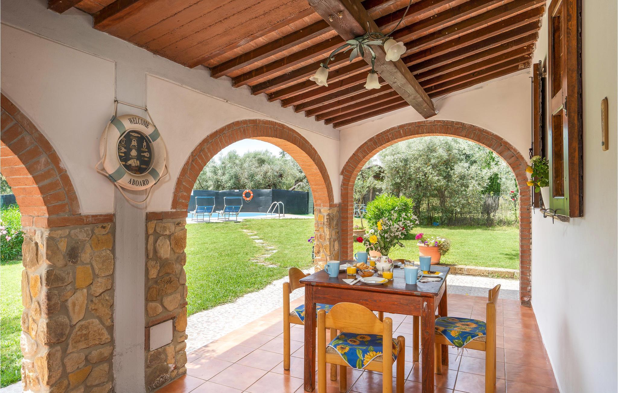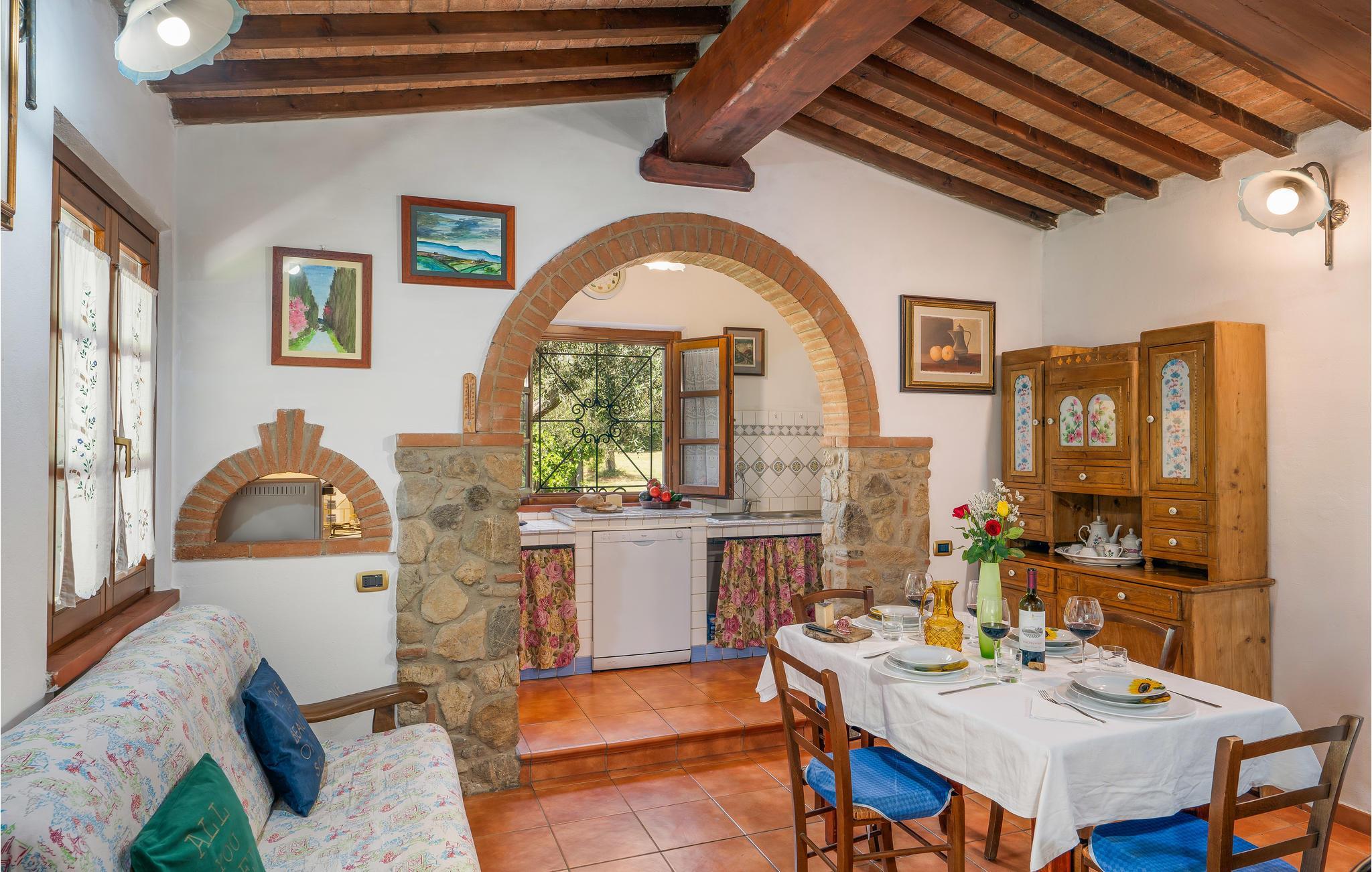 Das einladende Haus empfängt Sie in idyllischer Lage umgeben von der fantastischen Landschaft der Toskana. In den einladenden, authentisch möblierten Räumen im Stile eines alten Landsitzes entspannen Sie in wohnlichem Ambiente. Alte Holzdecken, geflieste Böden und geschwungene Fensterbögen verleihen dem Inneren des Hauses seinen Charme. Machen Sie es sich abends gemeinsam am langen Esstisch gemütlich.