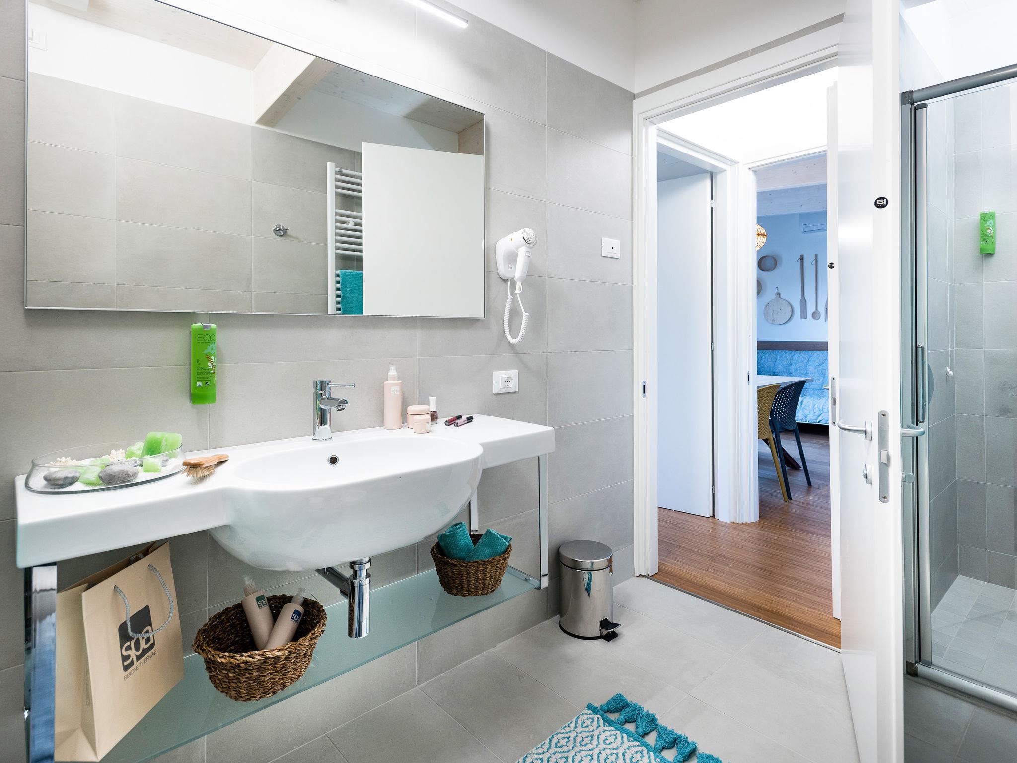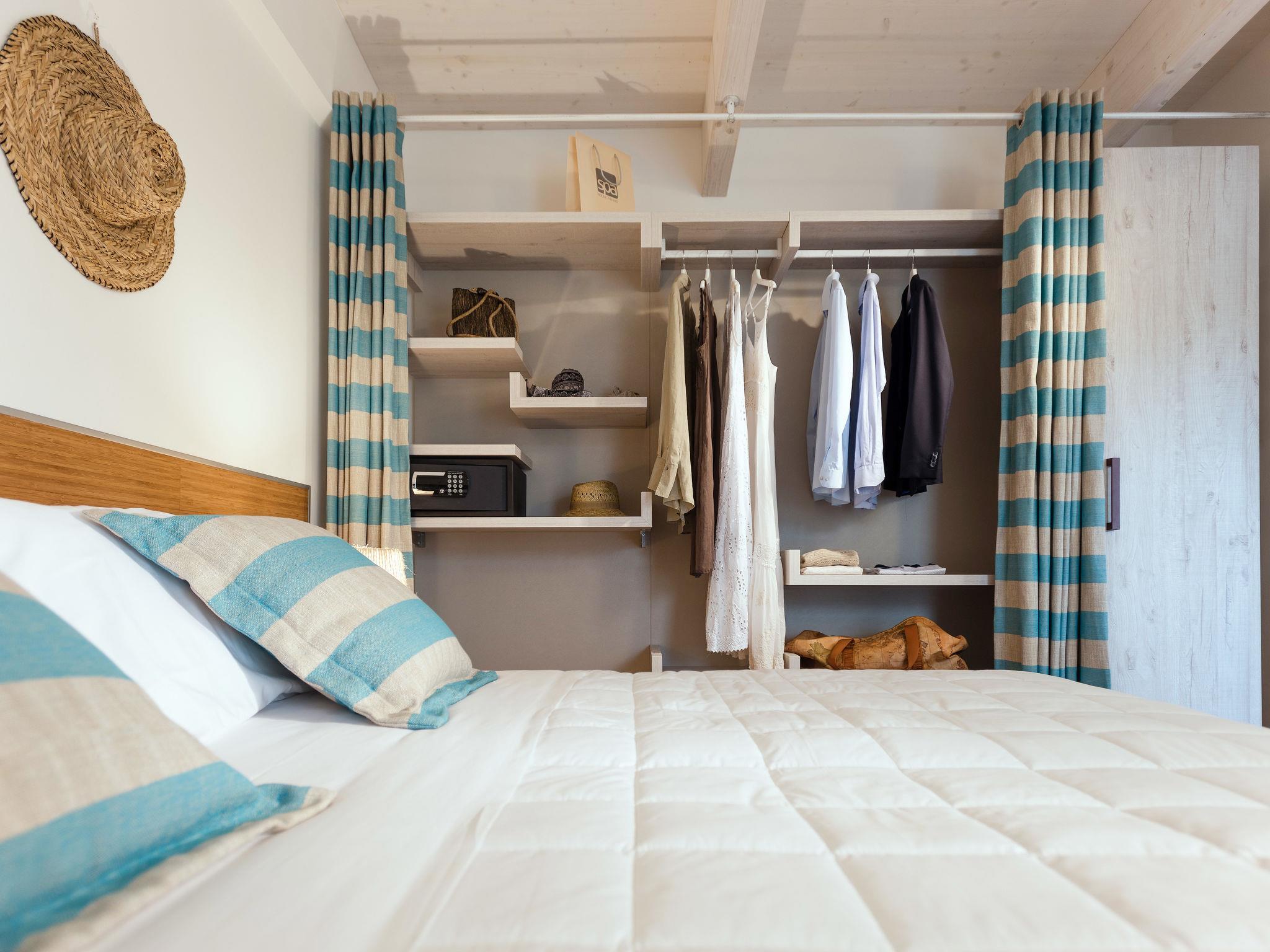 2-Zimmer-Wohnung 40 m2, im erhöhten Erdgeschoss. Schön und stilvoll eingerichtet: Wohn-/Schlafzimmer mit 1 Doppeldiwanbett, Esstisch, Küchenblock, Sat-TV, Klimaanlage und Warmluftheizung. Ausgang zur Terrasse. 1 Zimmer mit 1 Bett, 1 Doppelbett, Klimaanlage und Warmluftheizung. Ausgang zur Terrasse. Offene Küche (4 Induktionskochplatten, Mikrowelle, Tiefkühler, elektrische Kaffeemaschine). Dusche/Bidet/WC. Terrasse 18 m2, überdacht. Terrassenmöbel. Zur Verfügung: Safe, Kinderhochstuhl, Babybett. Internet (WLAN, gratis). Maximal 3 Haustiere/Hunde erlaubt. Es werden keine zusätzlichen Gebühren vor Ort fällig, ausgenommen der örtlichen Kurtaxe. Bettwäsche, Handtücher, Endreinigung und alle Energiekosten sind inkludiert. IT027034A1TVVZCQAQ