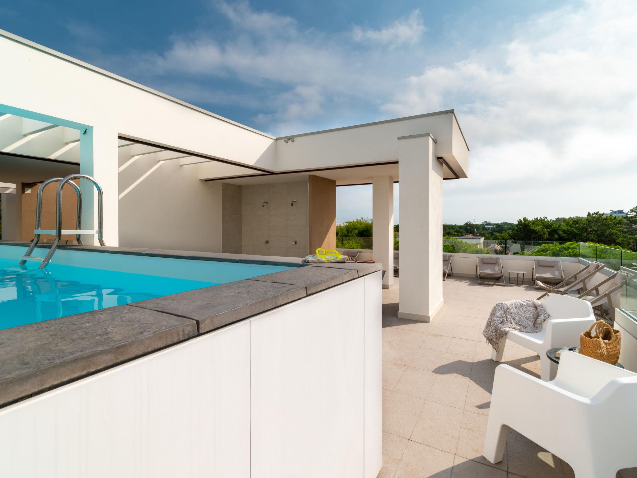 Komfortable Residenz "Iris Suite", auf 5 Stockwerken, Baujahr 2021. 16 Wohnungen in der Residenz. Im Ortsteil Bibione Spiaggia, 100 m vom Zentrum von Bibione, 13 km vom Zentrum von Lignano, 100 km vom Zentrum von Venezia, 450 m vom Meer, 450 m vom Strand. Zur Mitbenutzung: Grundstück (eingezäunt), Schwimmbad (6 x 6 m, saisonale Verfügbarkeit: 15.Mai. - 15.Sep.). In der Anlage: Fahrstuhl, Sonnenterrasse. Supermarkt 230 m, Bushaltestelle 450 m, Bahnstation "Latisana" 21 km. Nahe gelegene Sehenswürdigkeiten: Oasi Naturalistica Val Grande - Bibione. Das Foto ist nur ein Wohnungsbeispiel. Ca. 120 m² große Dachterrasse mit Pool, Sonnenliegen und Sitzecke zur gemeinsamen Nutzung.