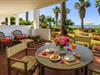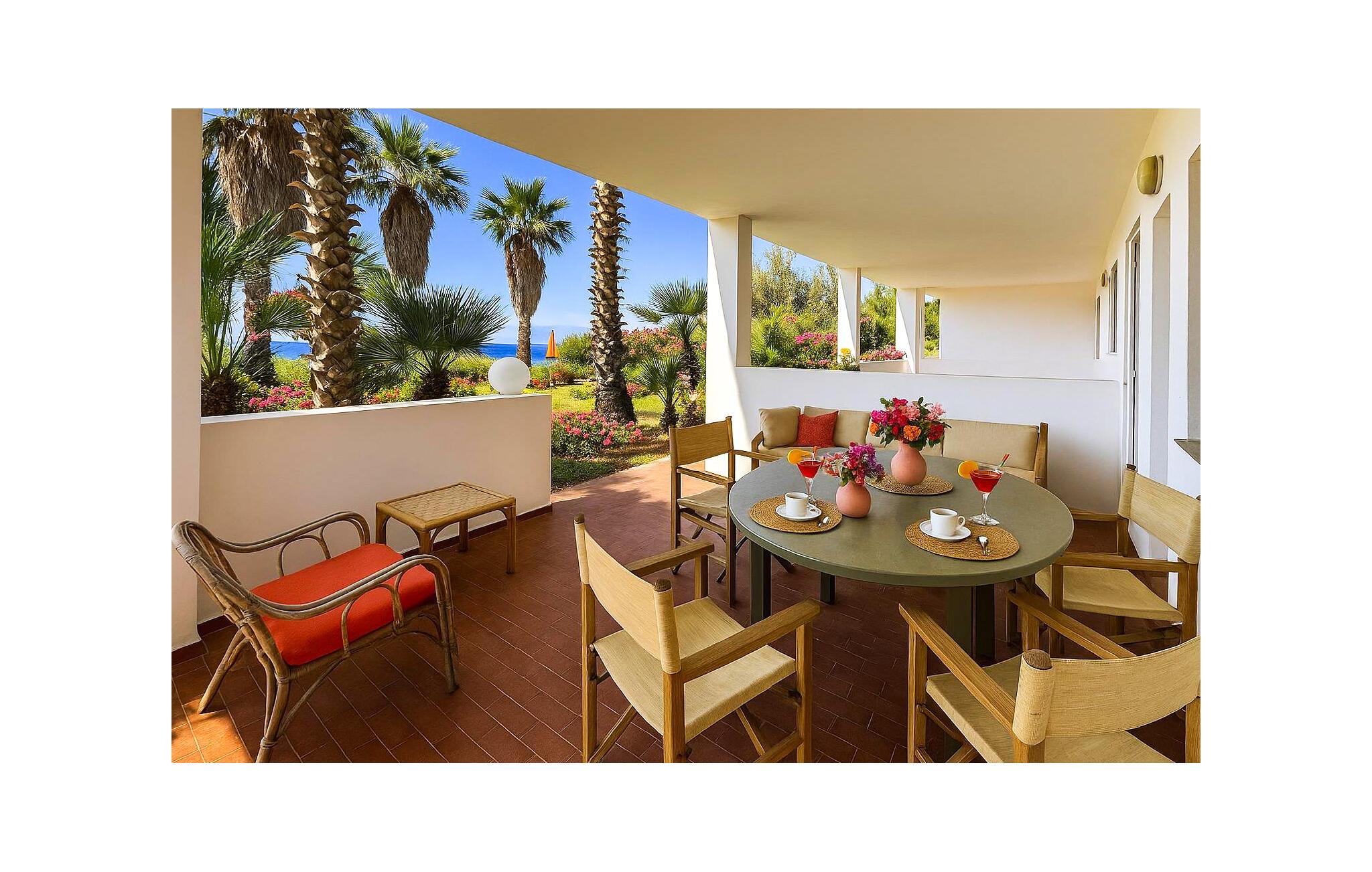 Die liebevoll gestaltete Terrasse ist der ideale Ort für ein Frühstück mit Blick auf Palmen, mediterrane Pflanzen und das Meer. An lauen Sommerabenden können Sie hier bei einem Glas Wein bis in die Nacht hineinplaudern.