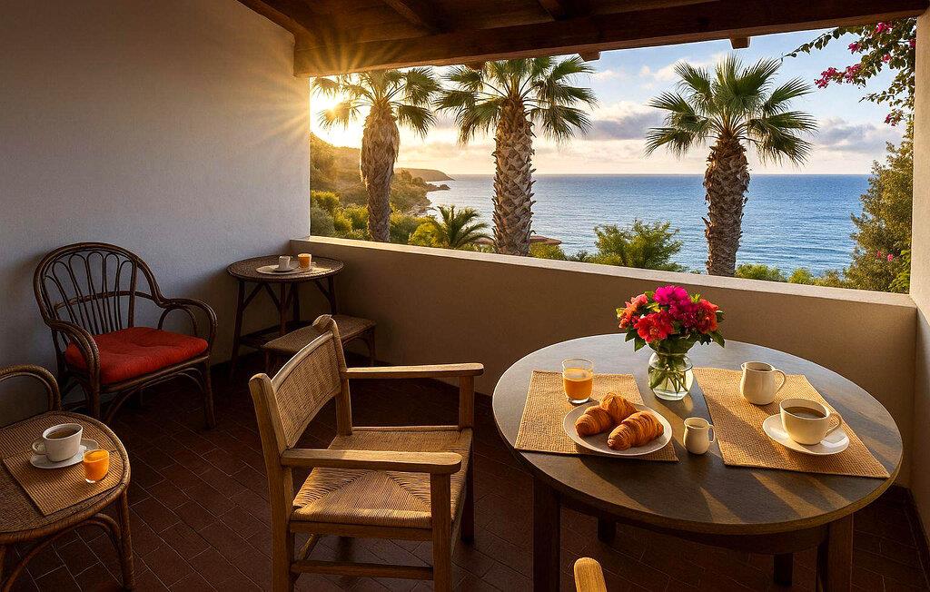 Ihr schöner Balkon ist der ideale Ort für ein Frühstück mit Blick auf Palmen und das Meer. An lauen Sommerabenden können Sie hier bei einem Glas Wein bis in die Nacht hineinplaudern und die mediterrane Atmosphäre auf sich wirken lassen.