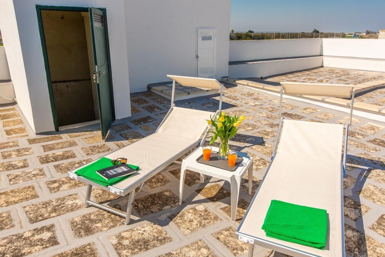 n.1 Balkon mit Tisch und Sesseln, n.1 privater Pavillon, n. 2 Liegestühle.