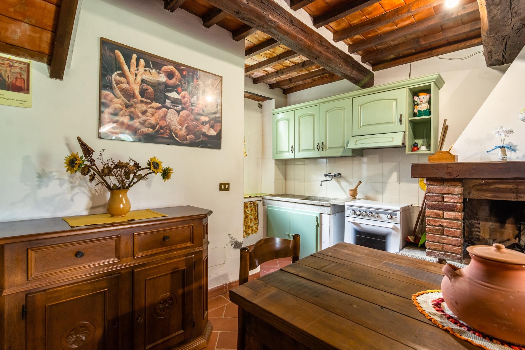 In der malerischen Landschaft von Bucine gelegen, ist dieses charmante Bauernhaus der ideale Rückzugsort für eine Familie oder eine Gruppe von vier Personen. Mit zwei gemütlichen Schlafzimmern und einer geräumigen Küche mit Schlafsofa und Kamin bietet das Haus ein warmes und einladendes Ambiente. Von der vorderen Terrasse aus genießen Sie den herrlichen Blick auf den Tennisplatz und den Pool – ideal für entspannte Abende. Das Bauernhaus ist mit modernem Komfort ausgestattet, darunter Fernseher, Espressomaschine, Kühl-Gefrierkombination und eine Gemeinschaftswaschmaschine. Den Gästen stehen ein gemeinsamer Pool (15 x 7 m), ein Tennisplatz, Tischtennisplatten, ein Bouleplatz und ein Spielbereich für Kinder zur Verfügung. Zwei Haustiere sind kostenlos willkommen, und die Heizung steht gegen eine geringe Gebühr zur Verfügung. Nur 2 km vom Stadtzentrum von Bucine und 3 km von den örtlichen Geschäften entfernt, ist die Lage ruhig und verkehrsgünstig. Ob Sie im Garten bei einem toskanischen Sonnenuntergang entspannen oder die umliegende Landschaft erkunden – dieses haustierfreundliche Haus mit WLAN bietet alles, was Sie für einen erholsamen Urlaub in der Toskana benötigen.