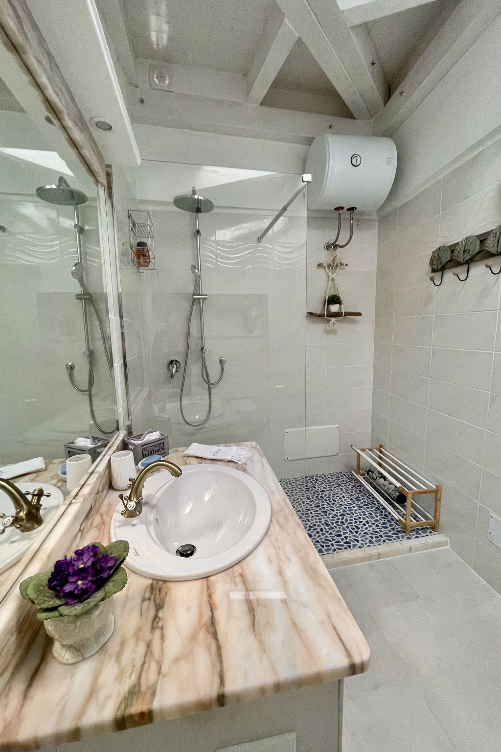 Das Innere des Studios ist gemütlich und gut eingerichtet und verfügt über einen Wohnbereich mit einem Sofa, das sich leicht in ein bequemes Ausziehbett mit einer 18 cm dicken Matratze verwandeln lässt. Außerdem gibt es einen Esstisch, einen Fernseher und eine voll ausgestattete Küchenzeile mit modernen Geräten: Herd, Elektroofen, Mikrowelle, Geschirrspüler, Waschmaschine, Toaster, Wasserkocher und Kaffeemaschine. Das moderne Badezimmer hat ein Oberlicht, Dusche, Bidet und Haartrockner.