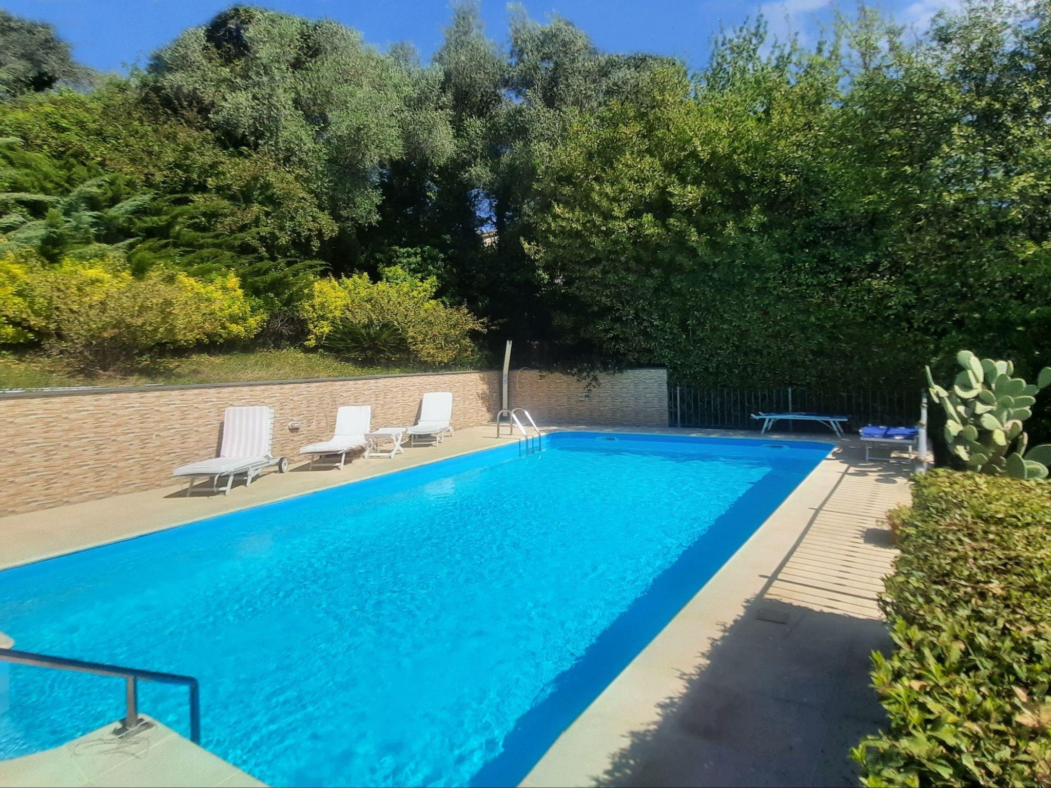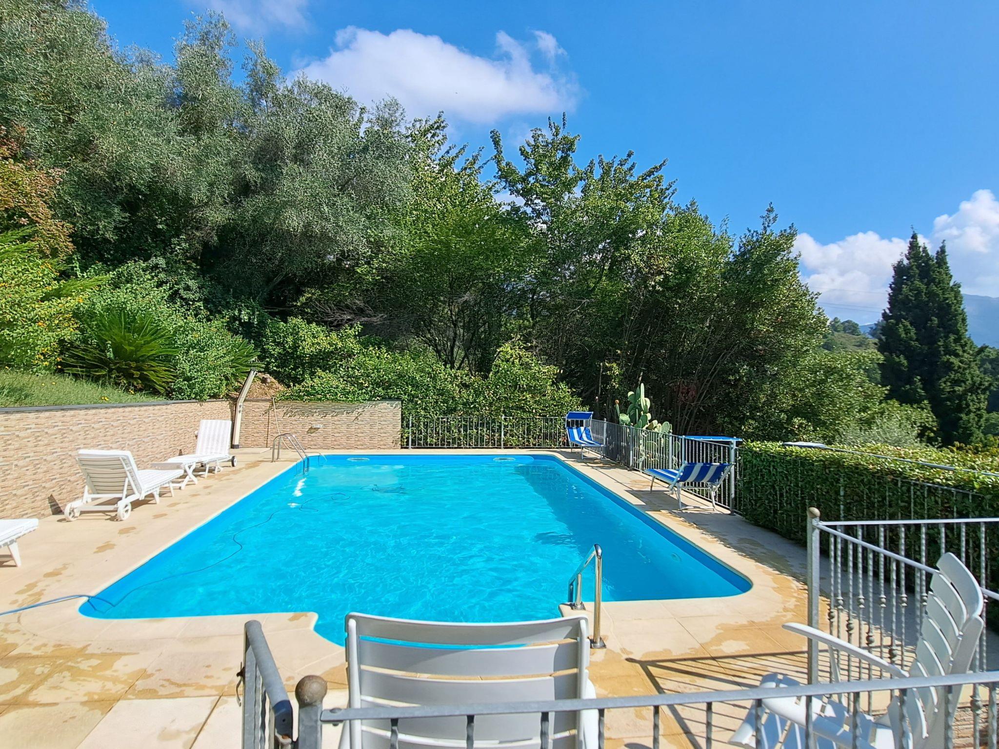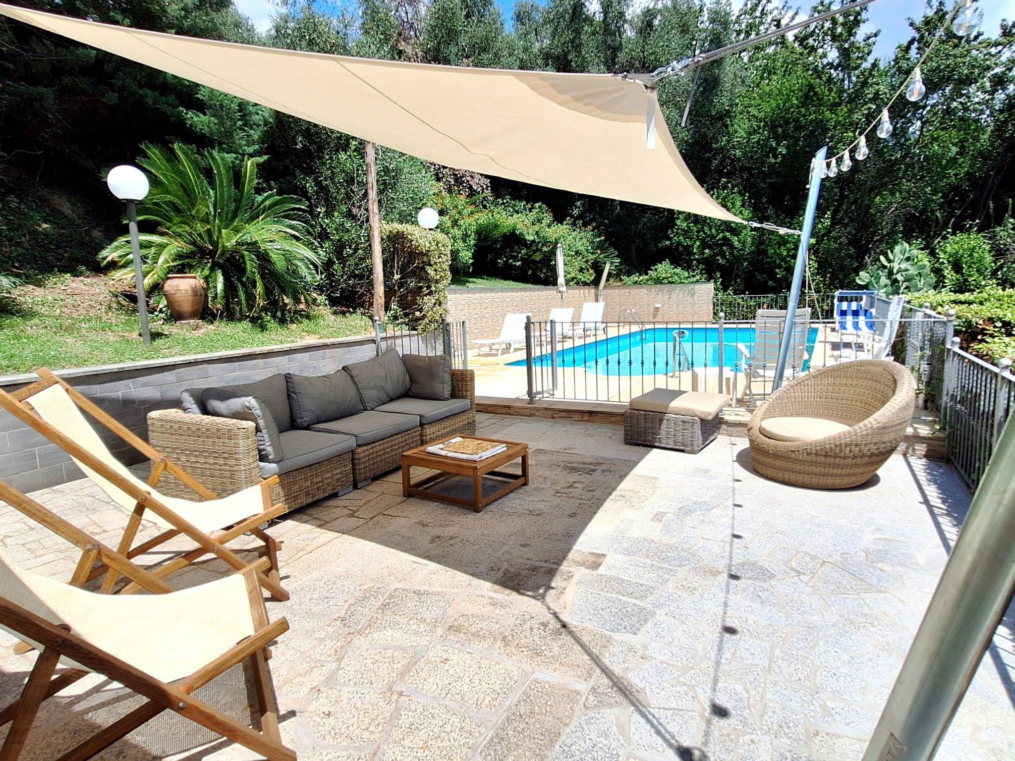 Der Außenbereich: Auf der Hauptebene befindet sich der große und brandneue 12 Meter lange Swimmingpool und die Panoramaterrasse, die mit komfortablen Außenmöbeln ausgestattet ist, beide aus dem Jahr 2011.