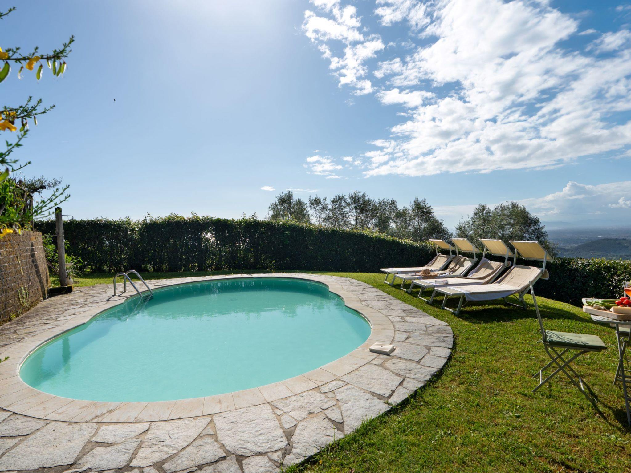 Freistehende Villa "Monica", 340 m.ü.M.. 6.2 km vom Zentrum von Camaiore, 20 km vom Zentrum von Forte dei Marmi, 30 km vom Zentrum von Lucca, erhöhte Lage auf einem Hügel, 12 km vom Meer. Zur Alleinbenutzung: Garten 200 m2 (eingezäunt), Schwimmbad (8 x 4 m, 120 - 150 cm tief, saisonale Verfügbarkeit: 01.Apr. - 31.Okt.). Aussendusche, Gartenmöbel, Grill, Poolpflege durch den Besitzer/Gärtner. Im Hause: Zentralheizung, Heizung vor Ort zu zahlen, Heizung nur verfügbar von 01.Nov. - 04.Apr.. Zufahrt bis zum Haus (150 m Naturweg). Öffentliche Parkplätze 300 m auf der Strasse. Einkaufsgeschäft 6.2 km, Lebensmittelgeschäft 1 km, Supermarkt 6.2 km, Restaurant 1 km, Bar 1 km, Bushaltestelle 50 m, Sandstrand "Lido di Camaiore" 12 km, Thermalbad "Montecatini Terme" 55 km. Nahe gelegene Sehenswürdigkeiten: Pietrasanta 16 km, Pisa 32 km, Collodi 49 km, Livorno 58 km.