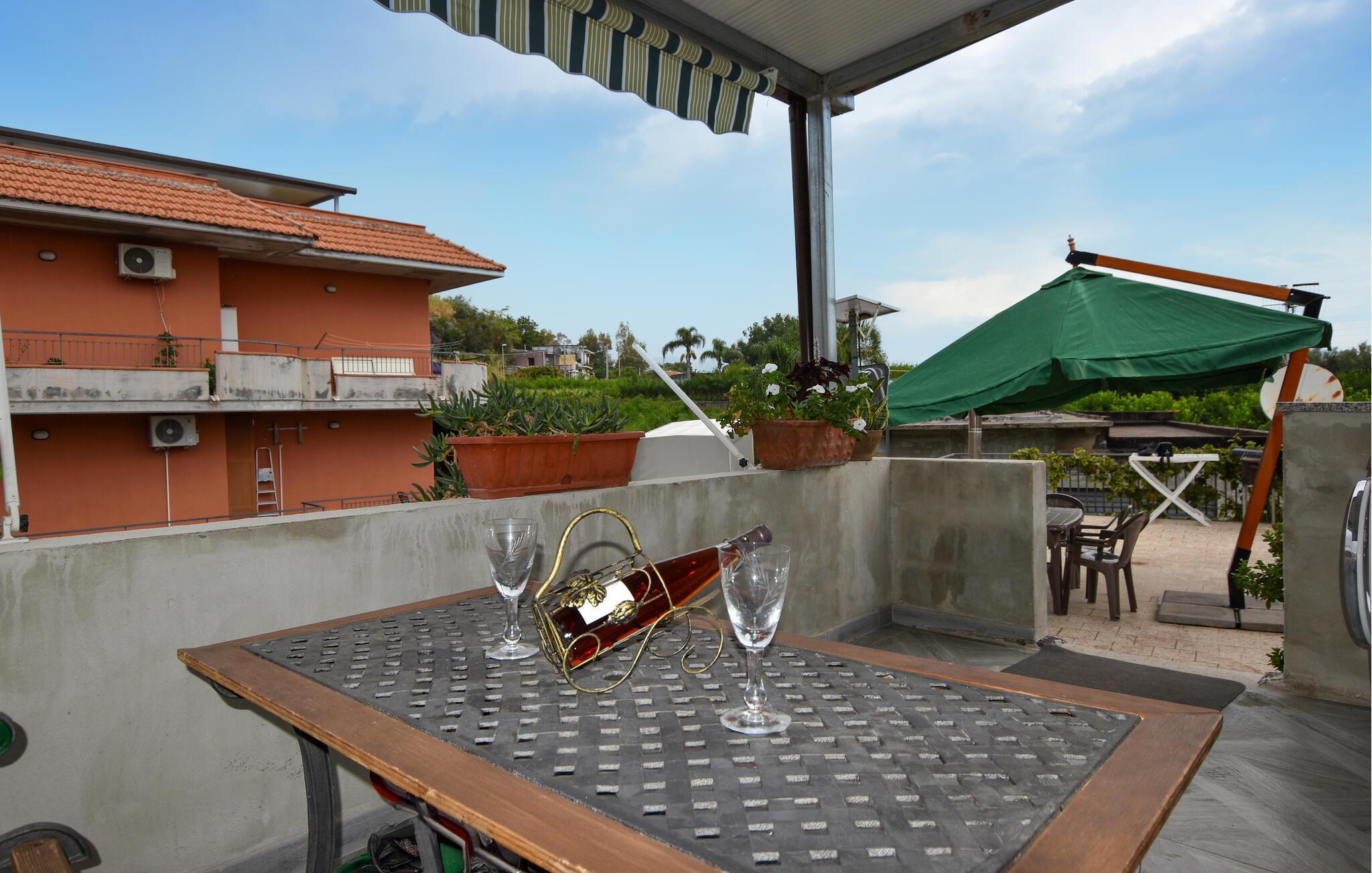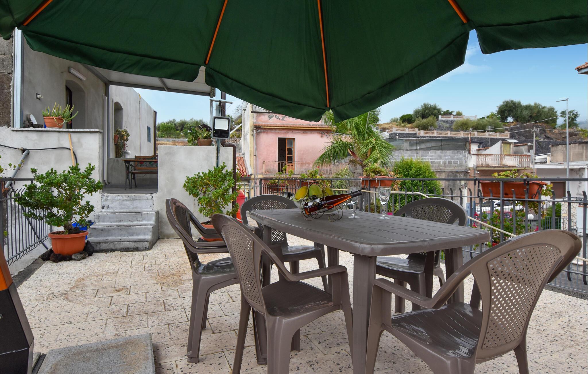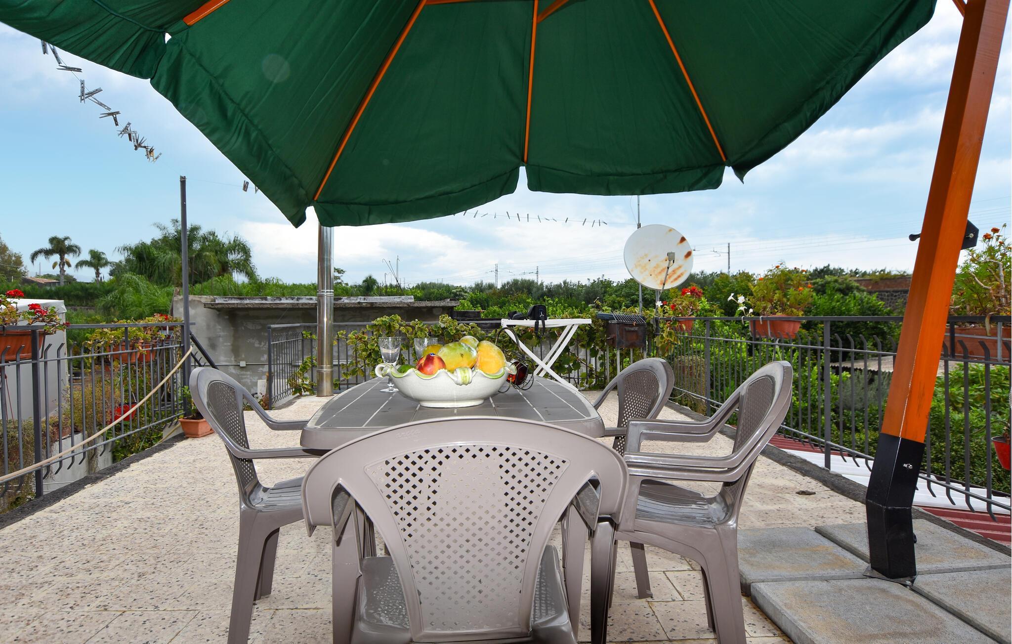 Genießen Sie auf Ihrer einladenden Terrasse das mediterrane Flair, umgeben von blühenden Pflanzen und einer herrlichen Aussicht auf die Nachbarschaft und den Ätna in der Ferne. Verbringen Sie entspannte Nachmittage bei einer Tasse Kaffee oder lassen Sie den Tag bei einem Glas Wein unter der Markise ausklingen.