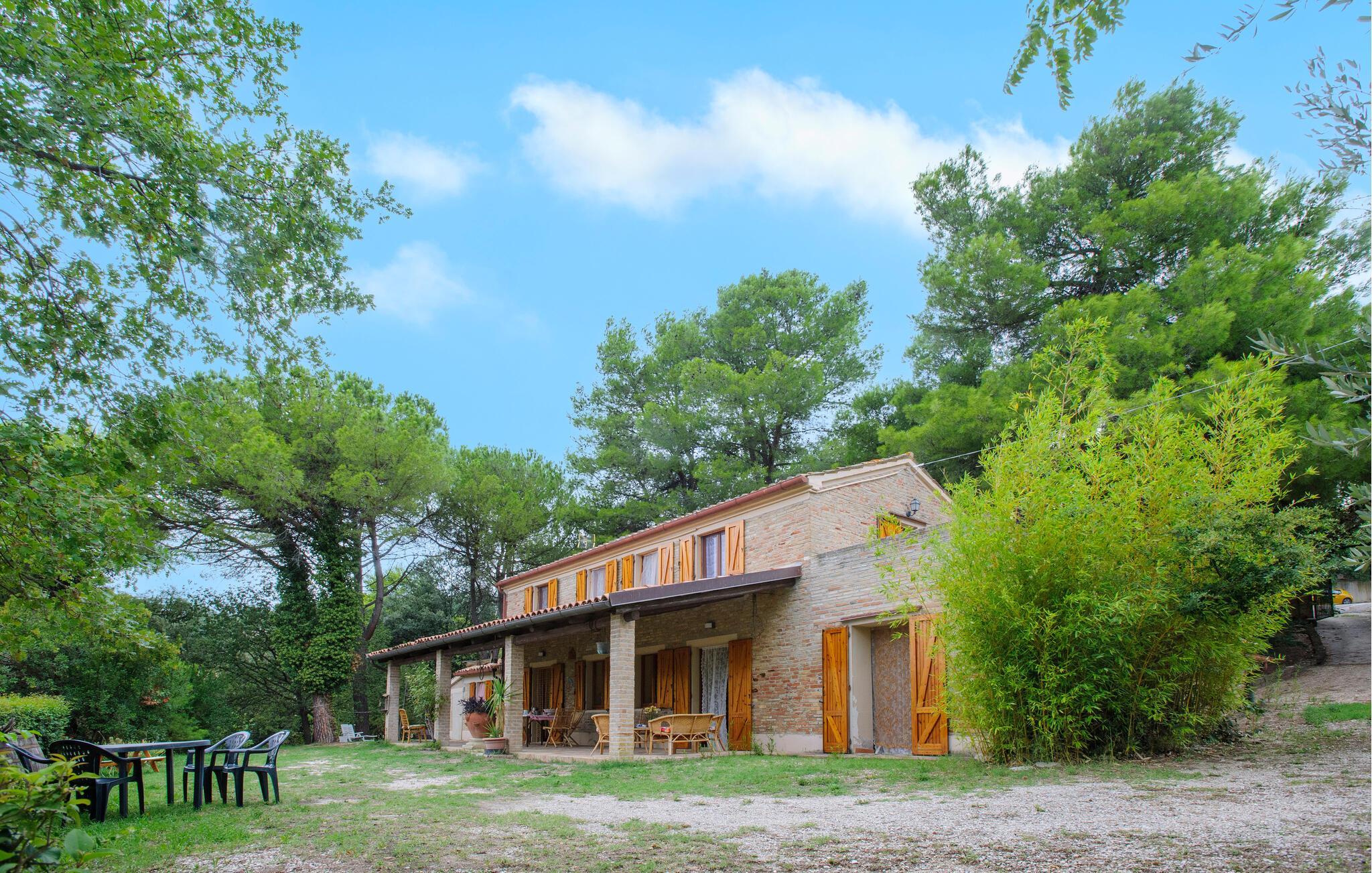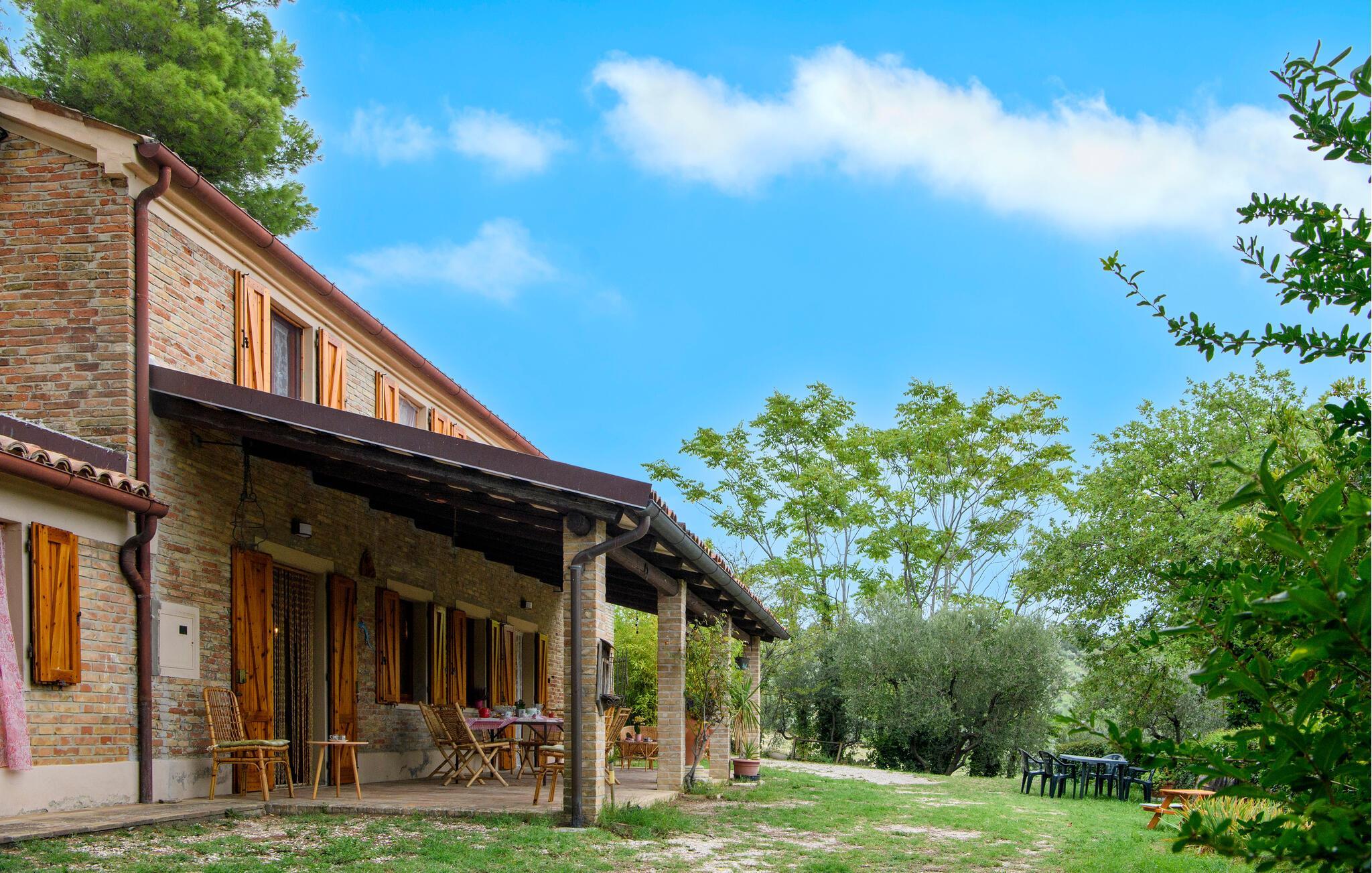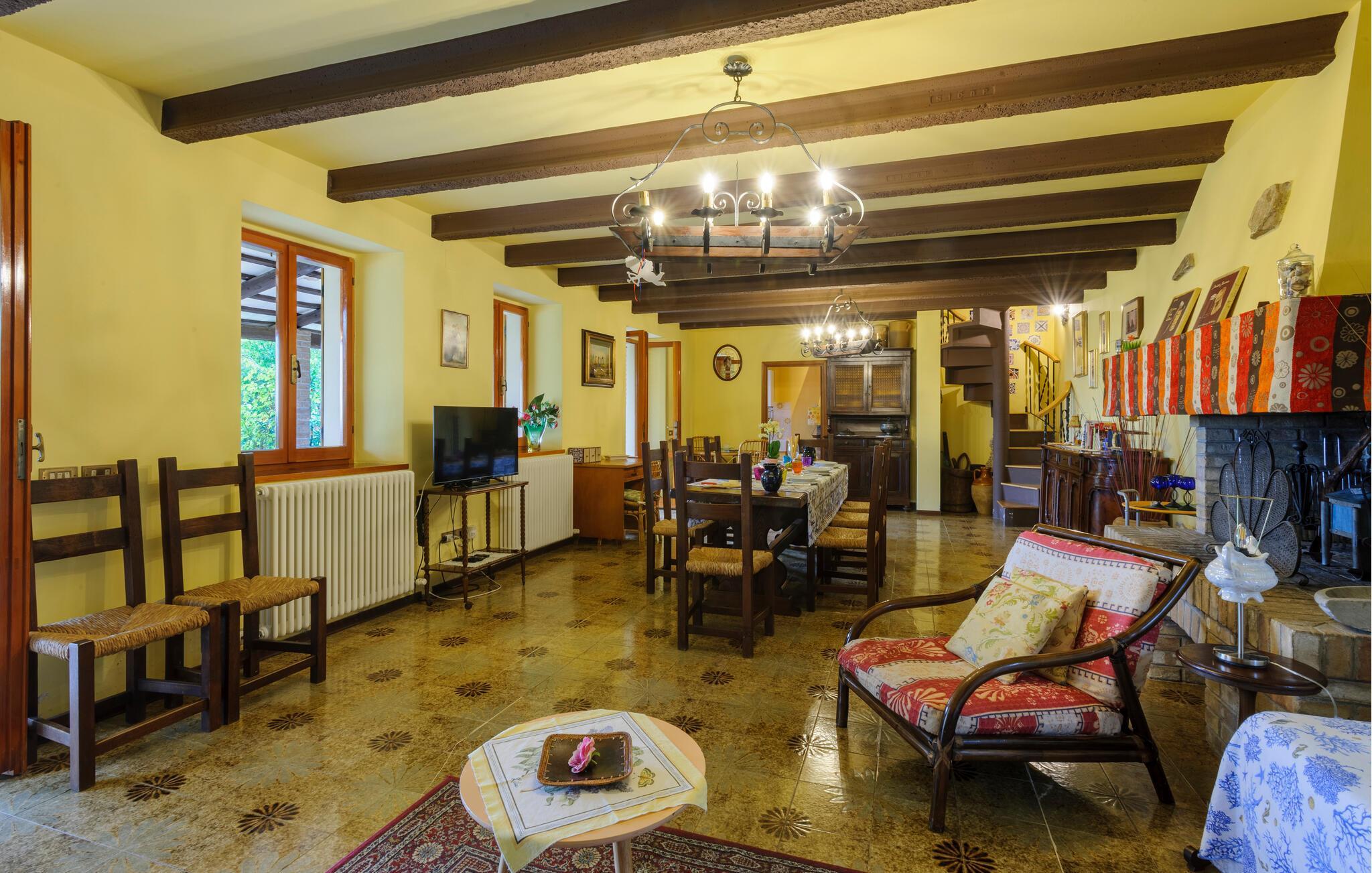 Willkommen in diesem großzügigen Landhaus in Cartoceto, wo rustikaler Charme auf modernes Wohlbefinden trifft. Die warmen Holzbalken und der offene Kamin schaffen eine einladende Atmosphäre, die sofort zum Entspannen einlädt. Genießen Sie die geräumigen Innenräume, die mit viel Liebe zum Detail eingerichtet sind.