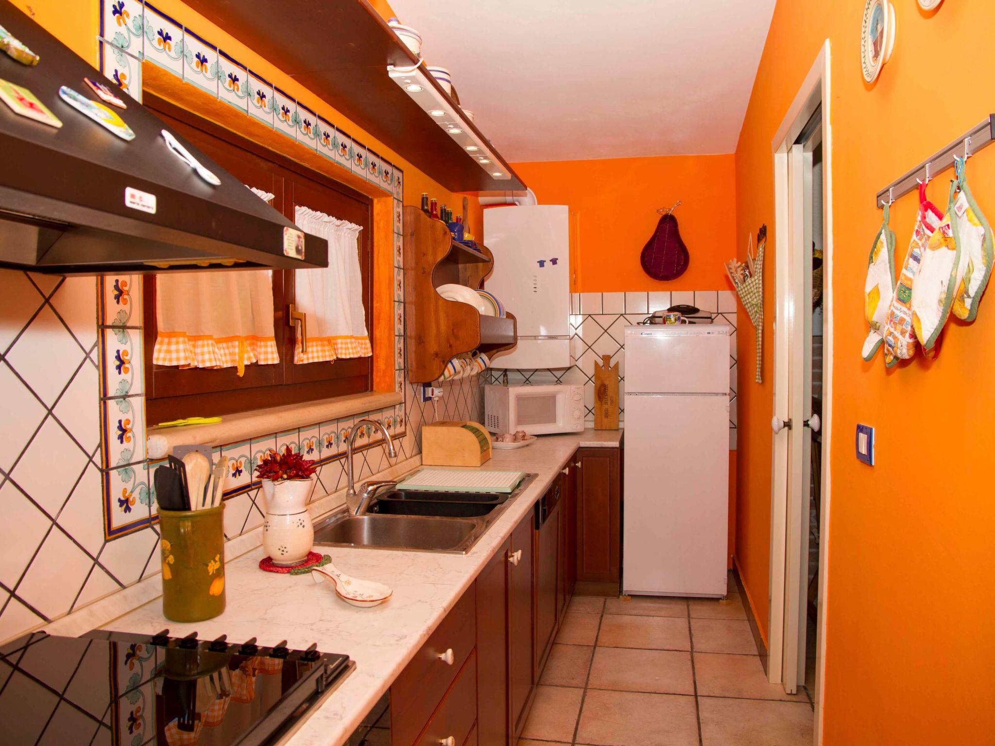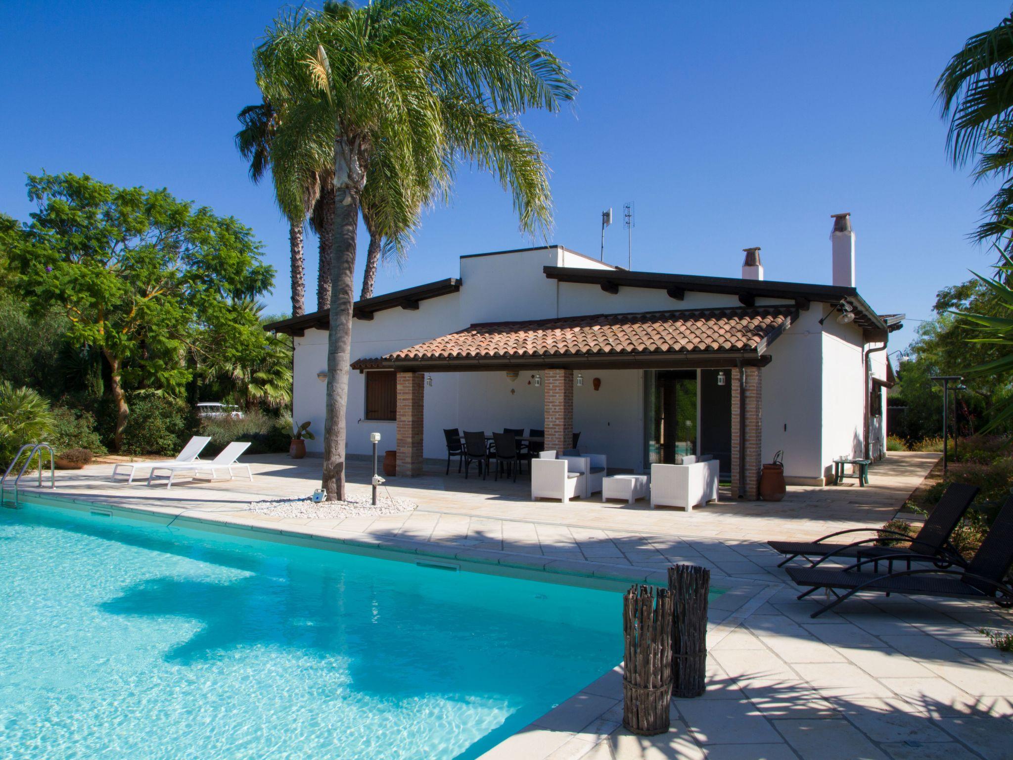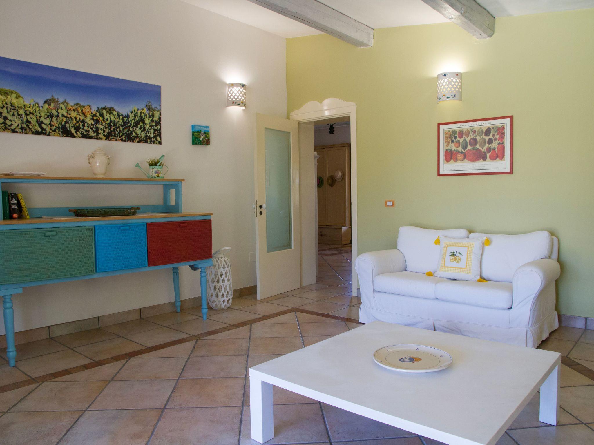Das Haus befindet sich im Erdgeschoss und hat eine Fläche von ca. 140 Quadratmetern und ist von einer mediterranen Einrichtung geprägt, in der die Farbe Weiß dominiert und die den Gästen ein Gefühl der völligen Entspannung und vor allem der Privatsphäre bietet. Großes Wohnzimmer mit Kamin, Esstisch mit Platz für bis zu 16 Personen, Entspannungsbereich mit Stereoanlage zum Musikhören, digitales terrestrisches Fernsehen, Bücherregal mit Lesetexten und einer Comicsammlung für die Kleinen. Die Küchenzeile ist mit einem Gasherd, einem Elektroofen, einem Geschirrspüler, einem Kühlschrank, einer Mikrowelle und anderen Küchenutensilien, Besteck und Pfannen ausgestattet. Das Hauptschlafzimmer mit einem Doppelbett hat ein eigenes Bad. Außerdem gibt es ein Schlafzimmer mit zwei Betten (die auf Wunsch zu einem Doppelbett gemacht werden können) und ein Schlafzimmer mit zwei Etagenbetten. Das zweite Badezimmer wird von den beiden letztgenannten Zimmern gemeinsam genutzt. Alle Fenster sind mit Moskitonetzen ausgestattet. Nur auf Anfrage (separate Kosten vor Ort zu erfragen) ist es möglich, den Koch für die Zubereitung von schmackhaften und delikaten Gerichten der salentinischen/mediterranen Küche zu buchen.