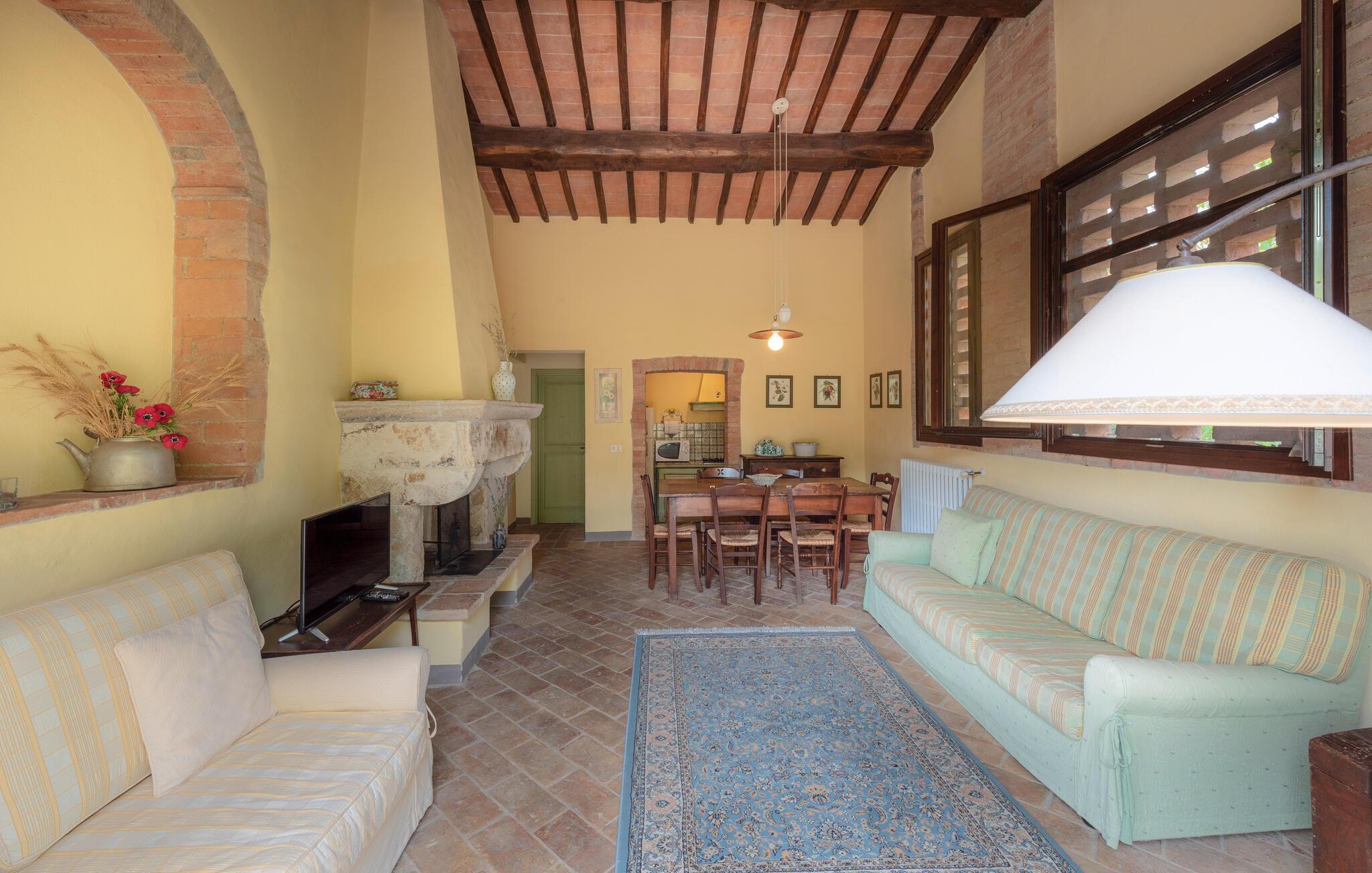 Ihre gemütliche Wohnung liegt in einem charaktervollen toskanischen Landhaus und besticht durch authentische Elemente. Eine freiliegende Holzbalkendecke und rustikale Möbel schaffen ein historisches Flair, in dem Sie sich schnell wie zuhause fühlen. Entspannen Sie sich bei Ihrer Lieblingsmusik, verbringen Sie einen vergnügten Spieleabend oder zaubern Sie köstliche Gerichte in der modernen Küche.
