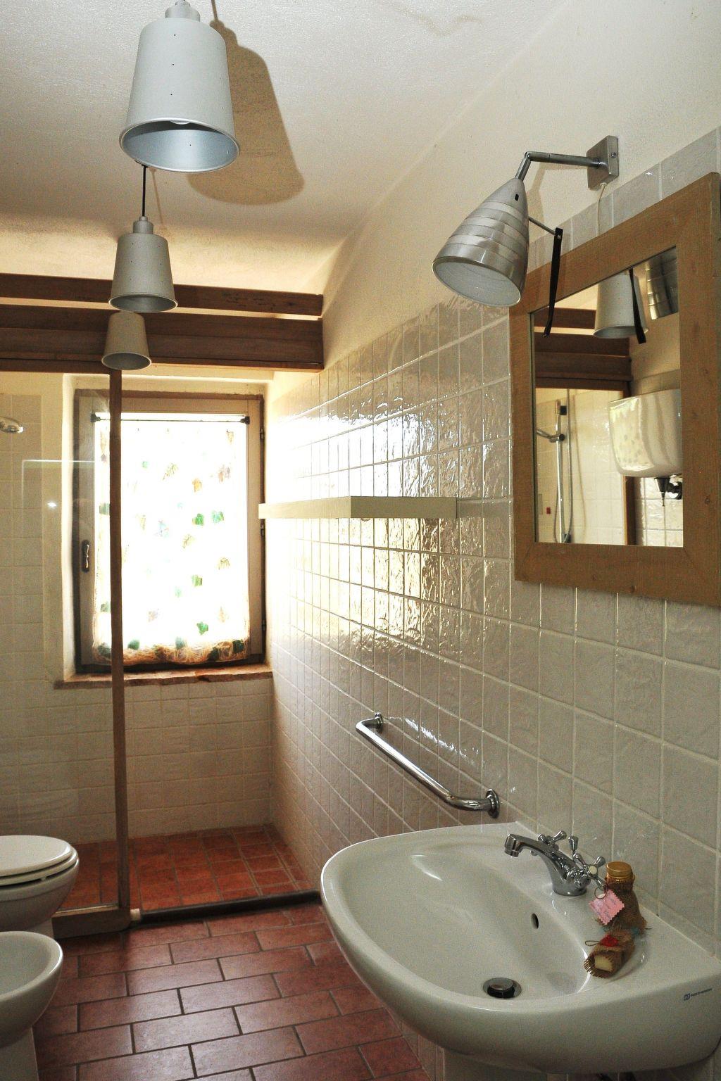 Die Ferienwohnung liegt auf der ersten Etage des zweiten Hauses. Sie setzt sich zusammen aus einem Schlafzimmer mit Doppelbett, einem Wohnzimmer mit Küchenbereich und einem Badezimmer mit Dusche und Bidet. Im Wohnzimmer bietet ein Bettsofa Platz zum Schlafen für zwei Personen. Der Küchenbereich mit Essecke ist ausgestattet mit Herd mit vier Kochstellen, Kaffeemaschine und italienischem Kaffeekocher, Toaster und Kühlschrank. Es gibt die Möglichkeit eine Wiege zuzustellen.