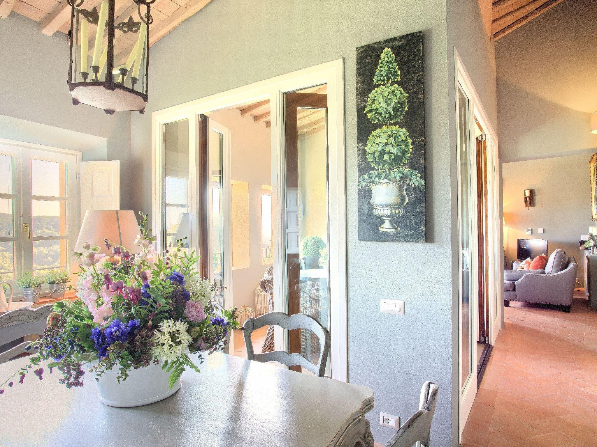 Die ca. 90 Quadratmeter große Wohnung wurde fachmännisch renoviert und befindet sich an der Hauptstraße des Borgo. Im ersten Stock befinden sich zwei Doppelschlafzimmer, zwei Bäder mit Regendusche und eine ausgestattete Waschküche. Im Obergeschoss befindet sich der Wohnbereich mit Küche, Esszimmer und Wohnzimmer, alle mit Blick auf drei Seiten der großen Loggia, die mit herrlichen Sesseln und Tisch ausgestattet ist, um den offenen Raum mit Blick auf die Hügel und den Pool zu genießen. Auf der Etage befindet sich ein drittes Badezimmer, ebenfalls mit Dusche. Die Wohnung ist mit Wi-Fi, Klimaanlage, Heizung, Moskitonetze, TV und eine voll ausgestattete Küche ausgestattet.