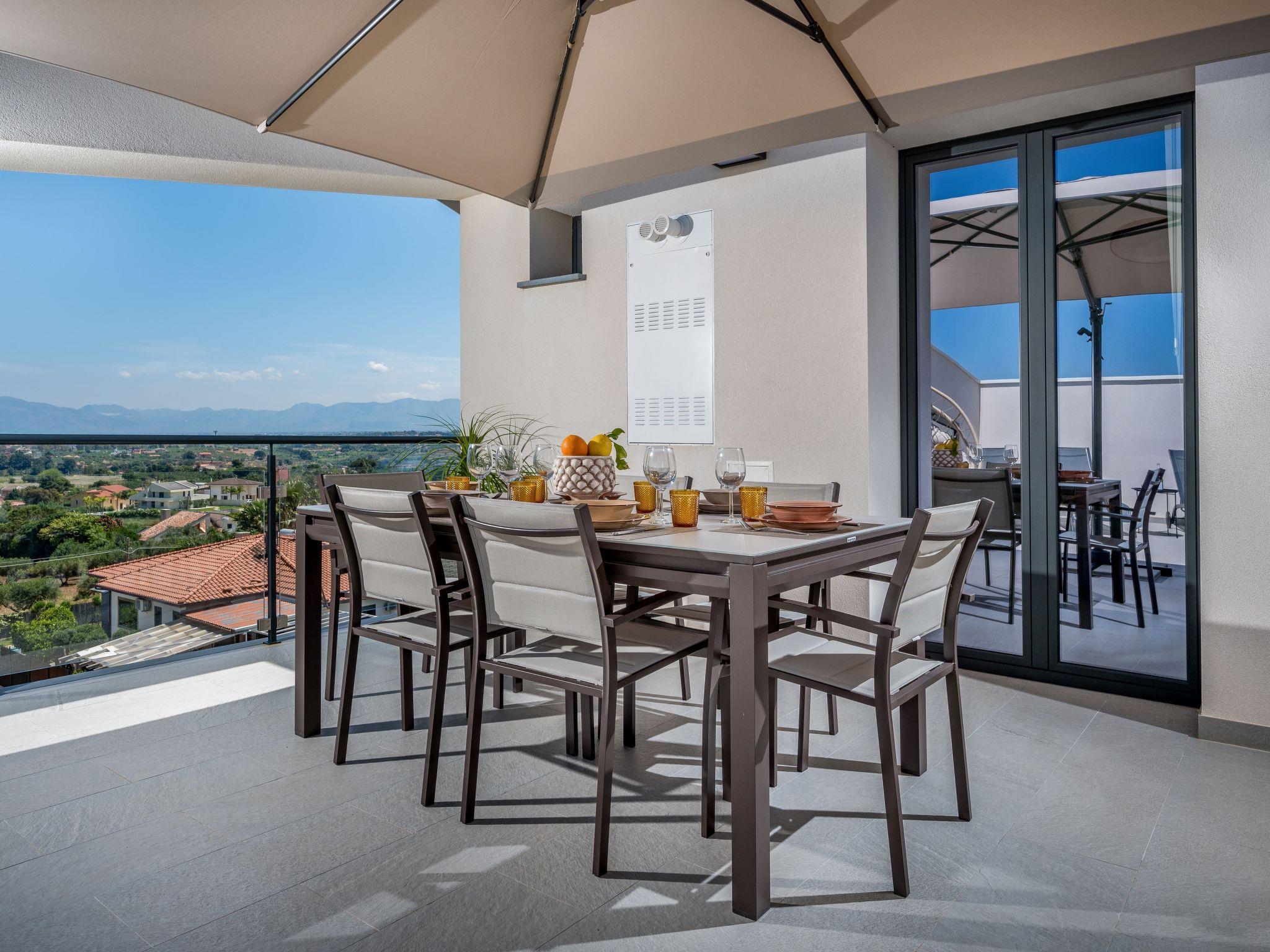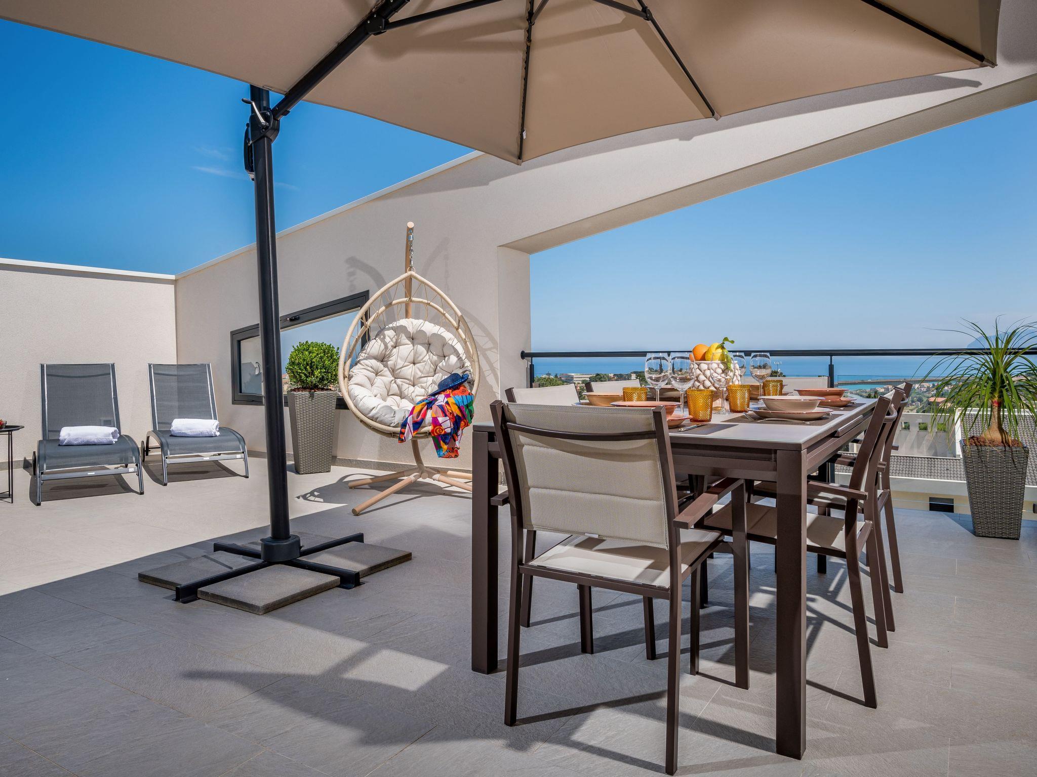 Einer der Höhepunkte der Wohnung ist die große Terrasse. Hier bietet ein herrlicher Panoramablick auf den Golf ein einzigartiges visuelles Erlebnis. Der Außenbereich ist mit bequemen Liegen, einem großen Sonnenschirm zum Schutz vor der Sonne, einem Tisch und einem Schaukelstuhl ausgestattet, die zu entspannten Momenten einladen, in denen man bei einem Getränk oder einem Buch die Aussicht genießen kann.