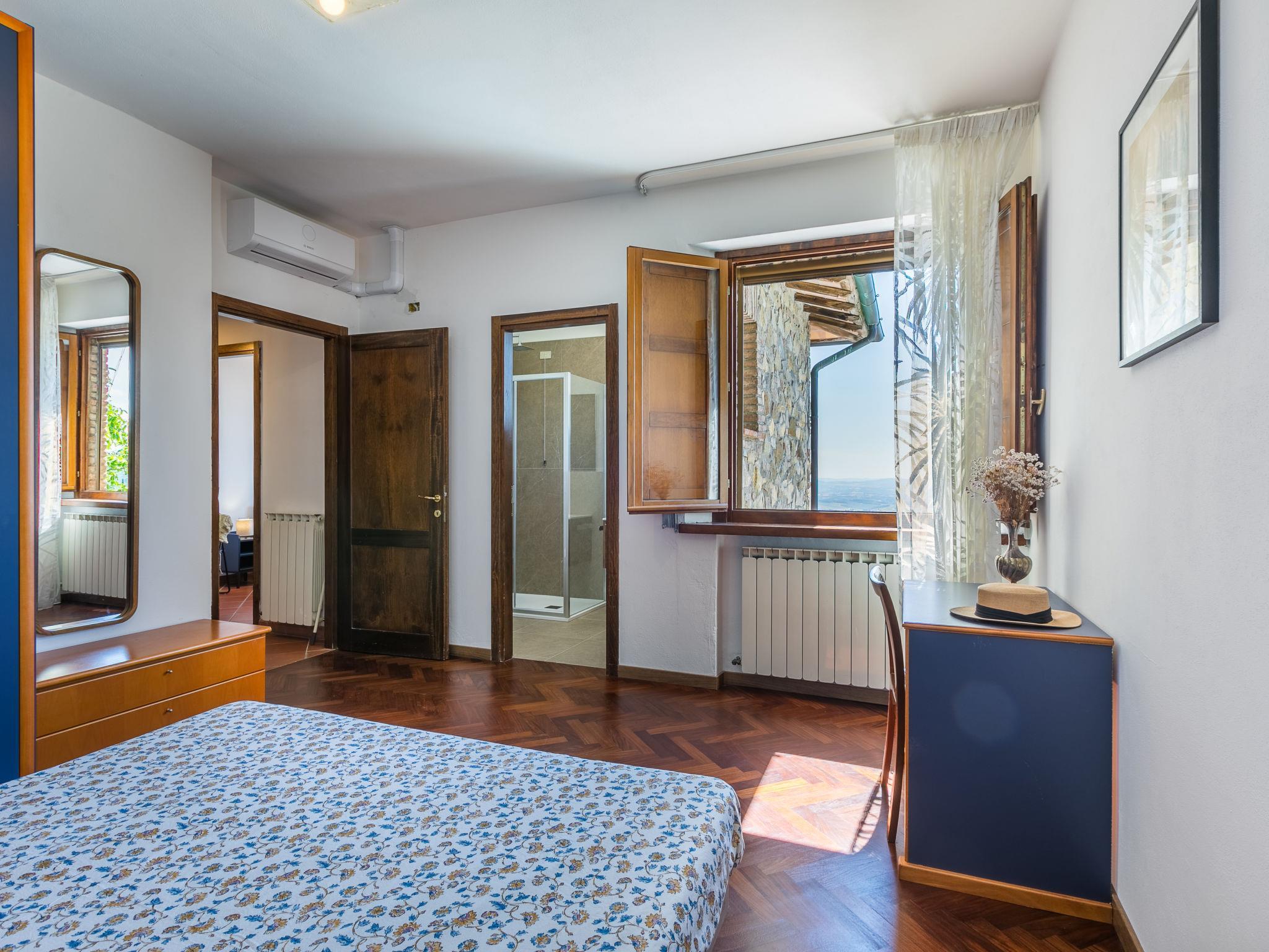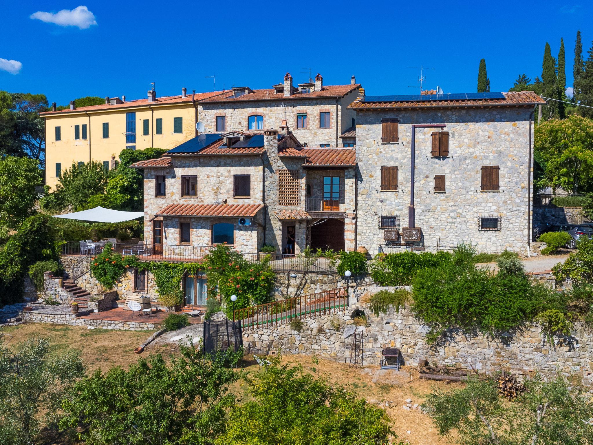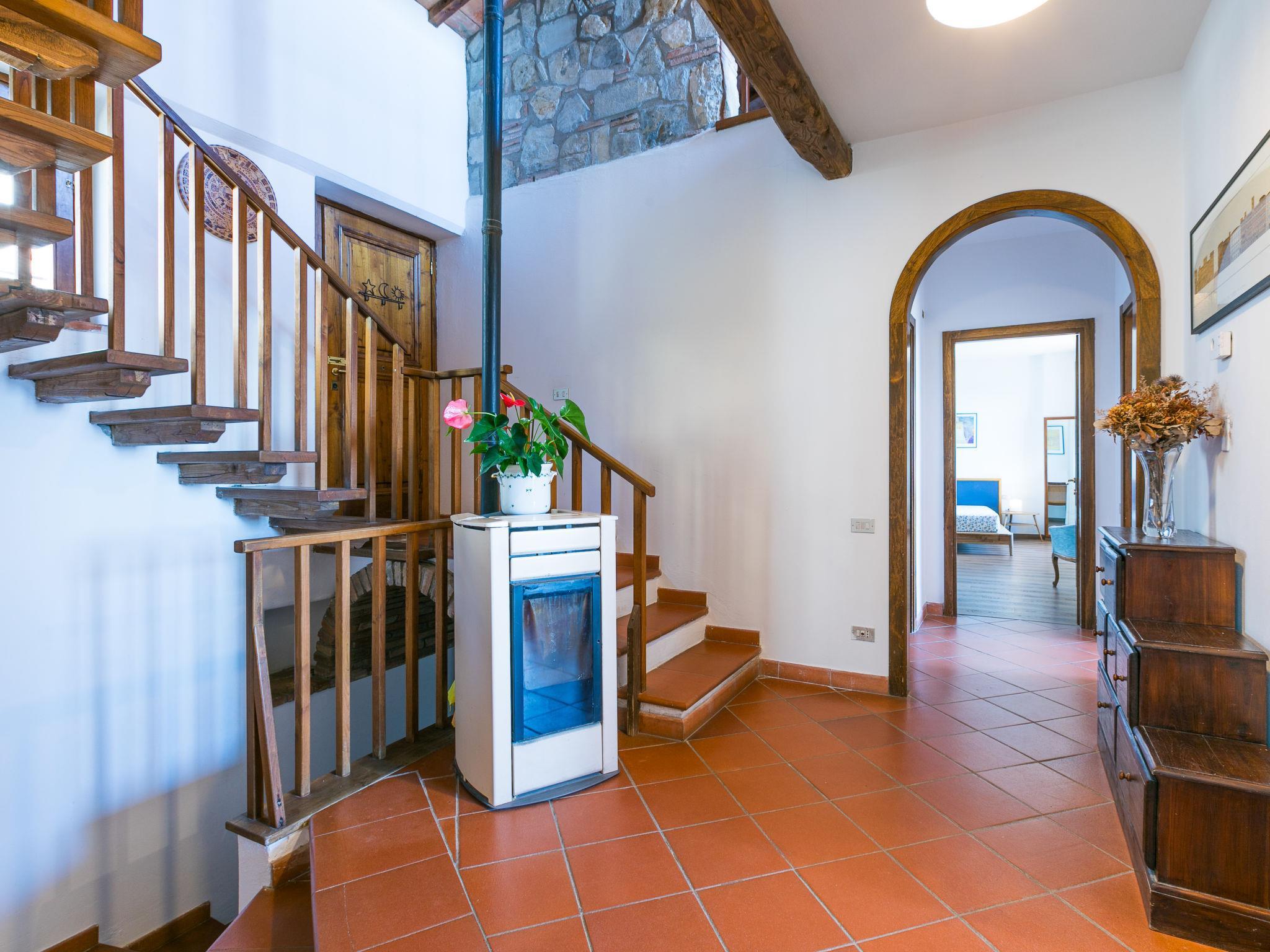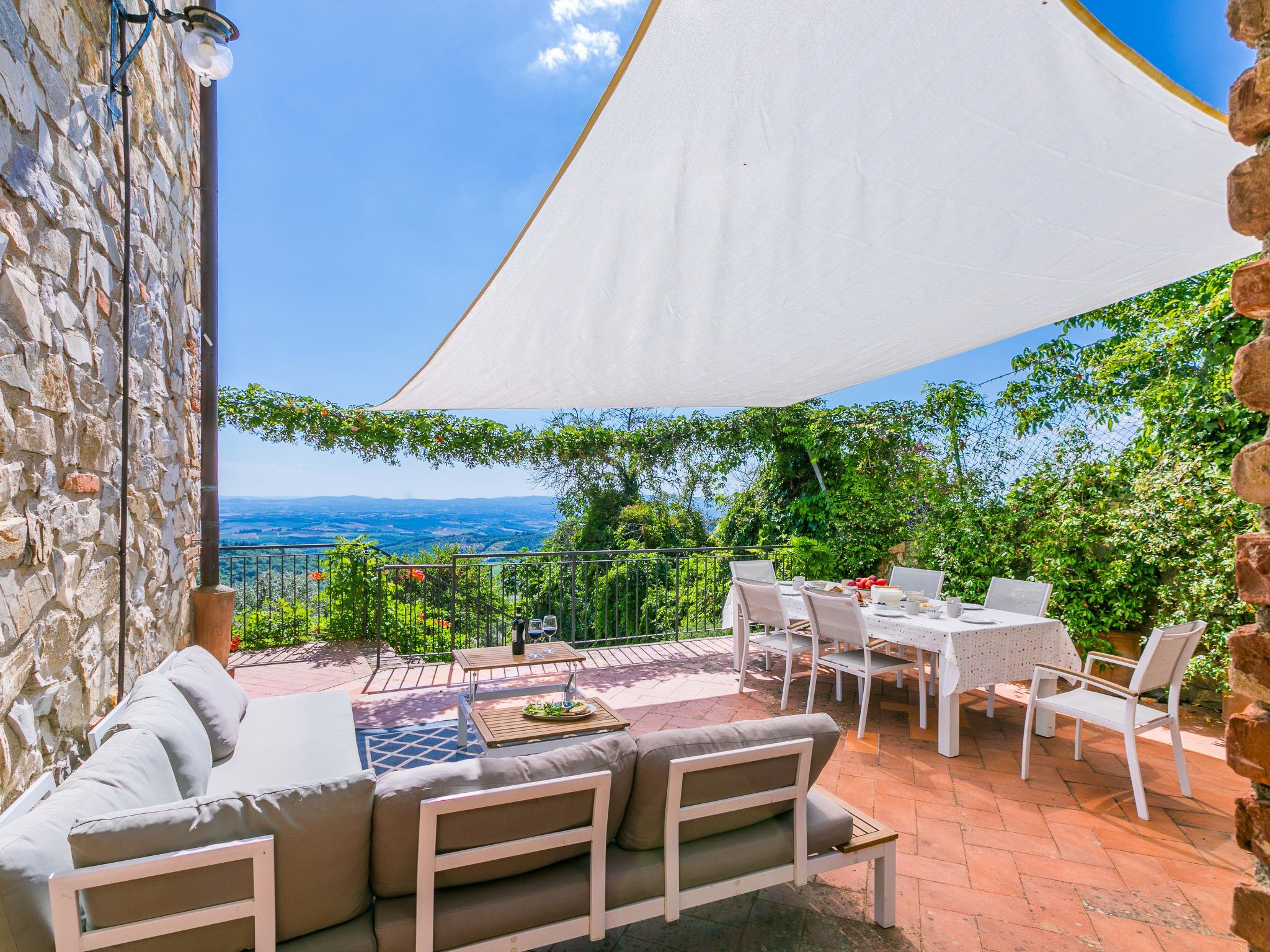 "Terrazza sul Chianti", 7-Zimmer-Doppelhaushälfte 150 m2 auf 3 Stockwerken. Geräumig und hell, renoviert im Jahre 2025, sehr geschmackvoll und gemütlich eingerichtet: Eingang. Grosses Wohnzimmer mit Panoramafenster Richtung Westen mit offenem Kamin und TV (Flachbildschirm), Klimaanlage. Ausgang zur Terrasse. Offenes Esszimmer mit Küchenblock und Klimaanlage. Ausgang zum Garten. Grosse, offene Küche (Backofen, Geschirrspüler, Gasherd, 5 Flammen, Toaster, Wasserkocher, Mikrowelle, Tiefkühler, elektrische Kaffeemaschine, Kapseln für die Kaffeemaschine (Nespresso) extra) mit Klimaanlage. Ausgang zur Terrasse. Sep. WC. Obergeschoss: 1 grosses Doppelzimmer mit Dusche/Bidet/WC und TV (Flachbildschirm), Klimaanlage. Ausgang zum Balkon. 2 Doppelzimmer, jedes Zimmer mit Dusche/Bidet/WC und Klimaanlage. 1 Doppelzimmer mit Klimaanlage. Dusche/Bidet/WC. 2. Obergeschoss: abgeschrägtes, offenes grosses Wohn-/Schlafzimmer, Deckenhöhe 100 - 220 cm mit 1 Bett (80 cm), 1 Diwanbett (130 cm), offenem Kamin (nur Deko), Klimaanlage. Ausgang zum Balkon. Heizung, Klimaanlage. Parkettboden, Natursteinboden. Grosse Terrasse teilweise überdacht, Westlage, Gartensitzplatz. Terrassenmöbel, Gartengrill, Abstellkammer. Herrliche Panoramasicht auf die Landschaft. Zur Verfügung: Waschmaschine, Safe, Bügeleisen, Fliegengitter, Kinderhochstuhl, Babybett bis 2 Jahre, Haartrockner, Holz (extra). Internet (WLAN, gratis). Parkplatz beim Haus. Bitte beachten: geeignet für Familien. Nichtraucher-Unterkunft. Eigener Eingang, Rauchmelder, Feuerlöscher. IT052005C2MJMX9V8B