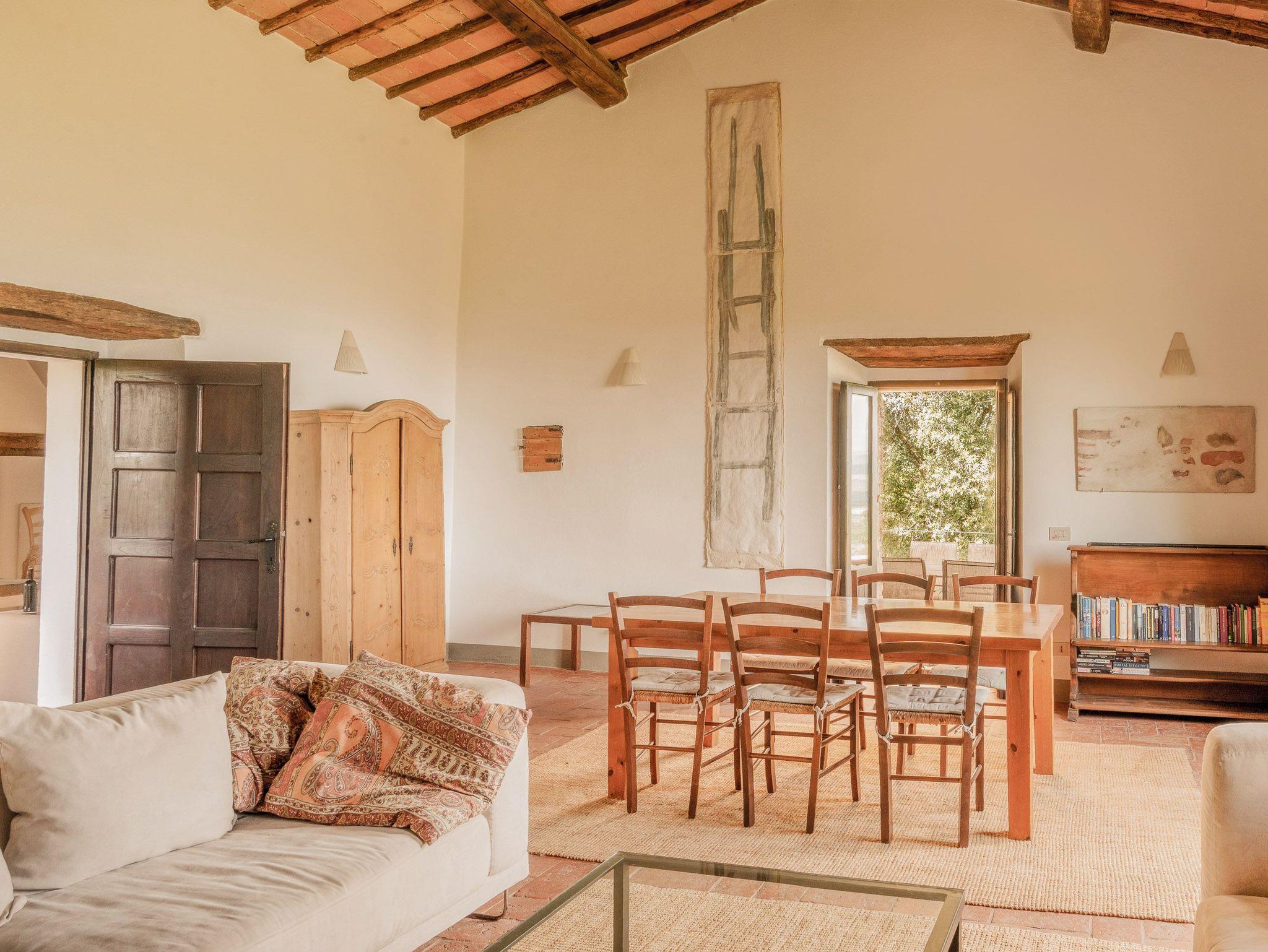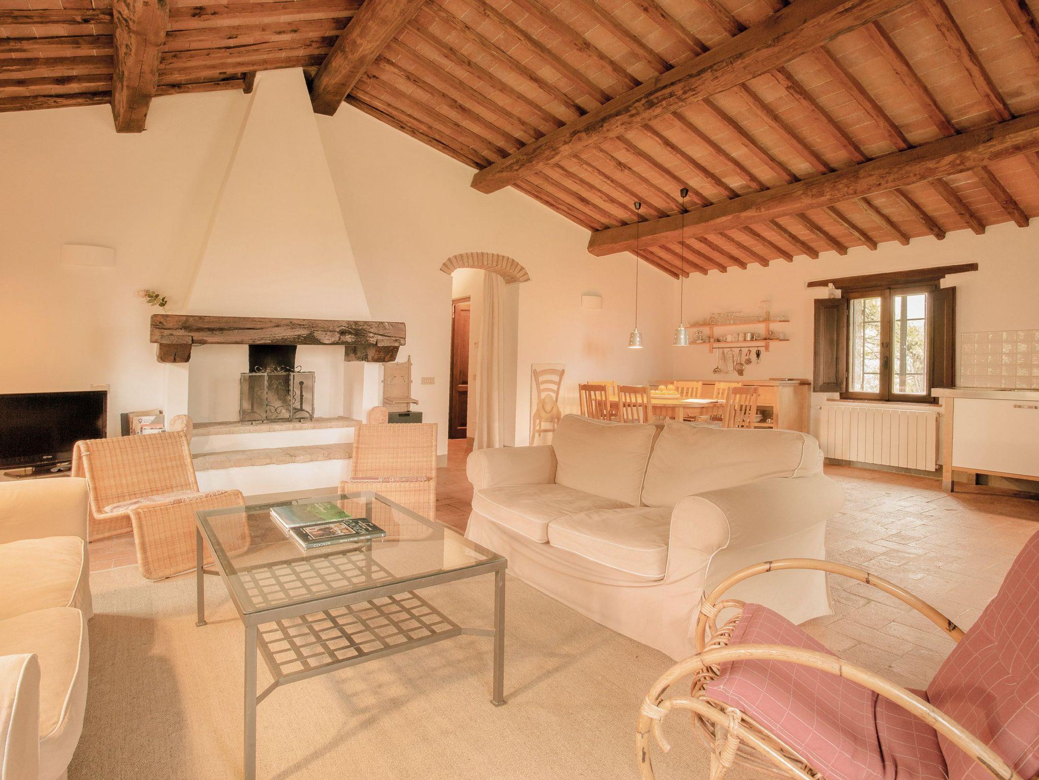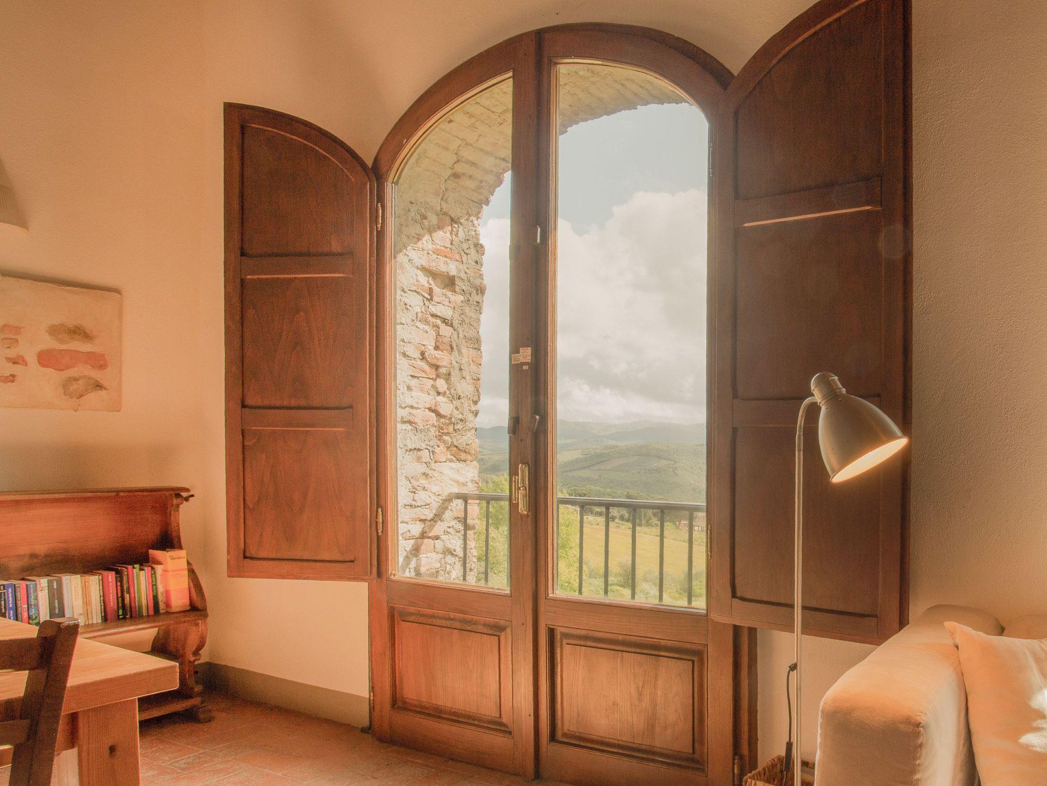 Die obere Wohnung im Haupthaus erstreckt sich über 200 Quadratmeter und vereint die Schönheit der Moderne mit dem Charme vergangener Zeiten. Kunstobjekte an den Wänden verleihen der Wohnung eine private und selten anzutreffende persönliche Note. Mit weiten Ausblicken, großzügigen Räumen und geschmackvoller Ausstattung entspricht die Wohnung höchsten Ansprüchen. Sie verfügt über einen alten Ziegelboden, ein großes Atelier mit Portalfenster und Ausgang zur Terrasse mit fantastischem Weitblick in das Chianti-Gebiet sowie einen großen Kaminraum. Hinzu kommen drei Schlafzimmer mit jeweils zwei Betten und zwei Badezimmer. Aus jedem der gemütlichen Schlafzimmer bieten sich neue, wunderschöne Blicke in die Weinberge. Die Bäder sind modern und zugleich mit altem Dekor eingerichtet. Die Küche ist voll ausgestattet mit Geschirrspüler, Backofen, Kühl- und Gefrierschrank.