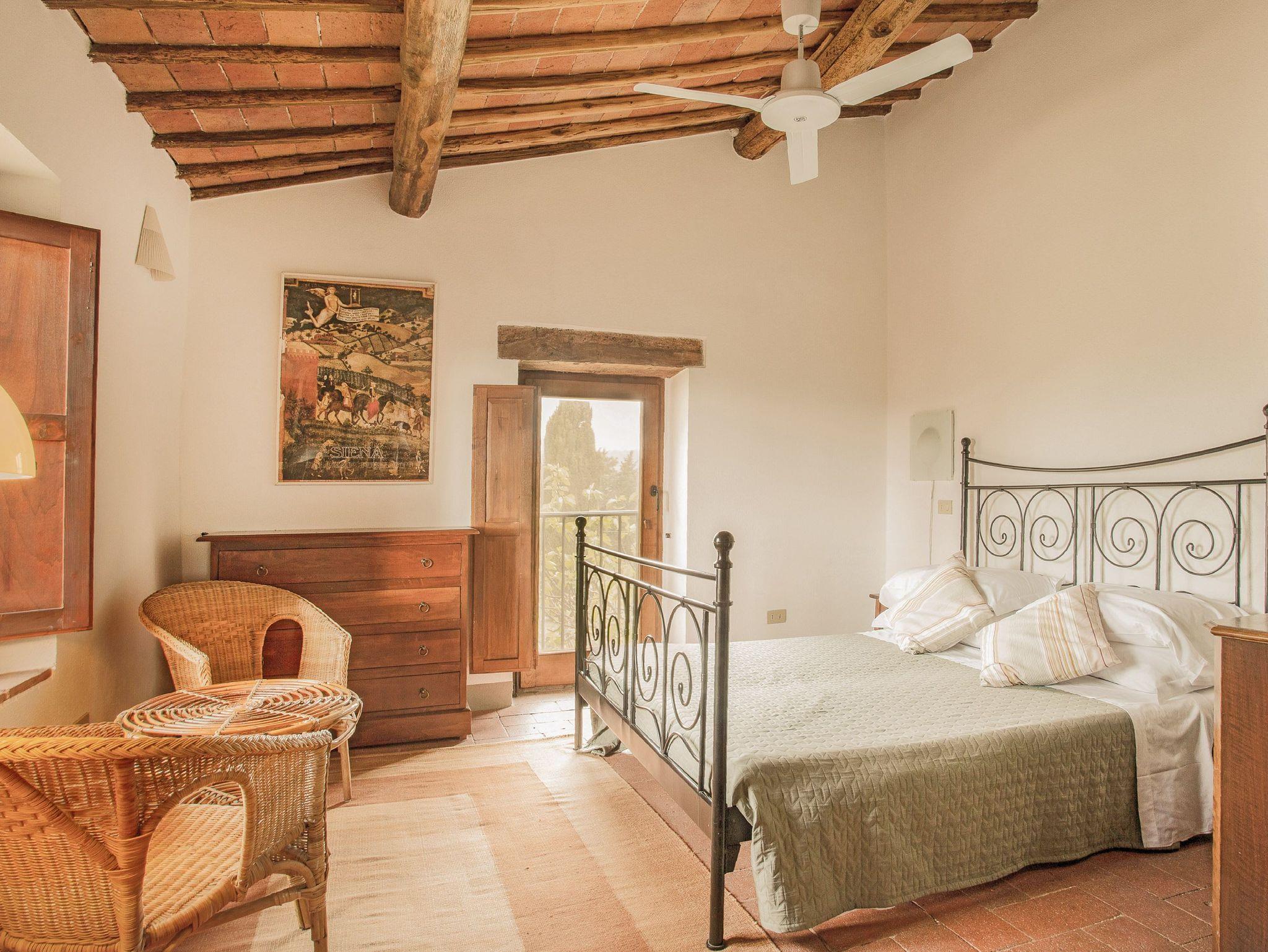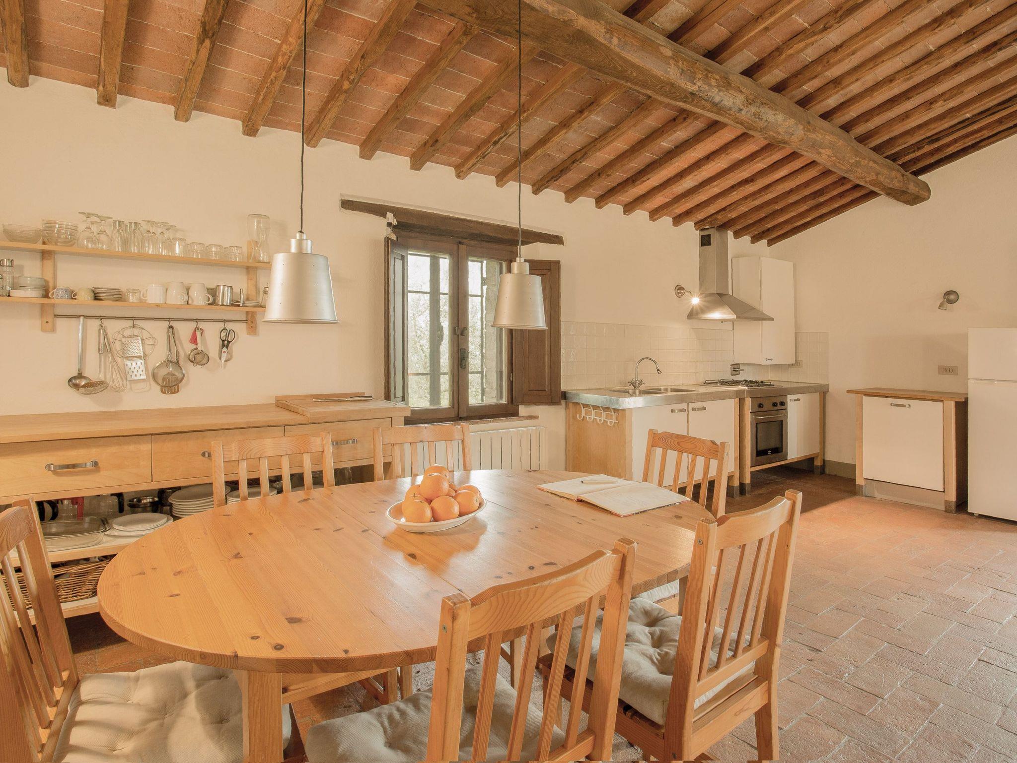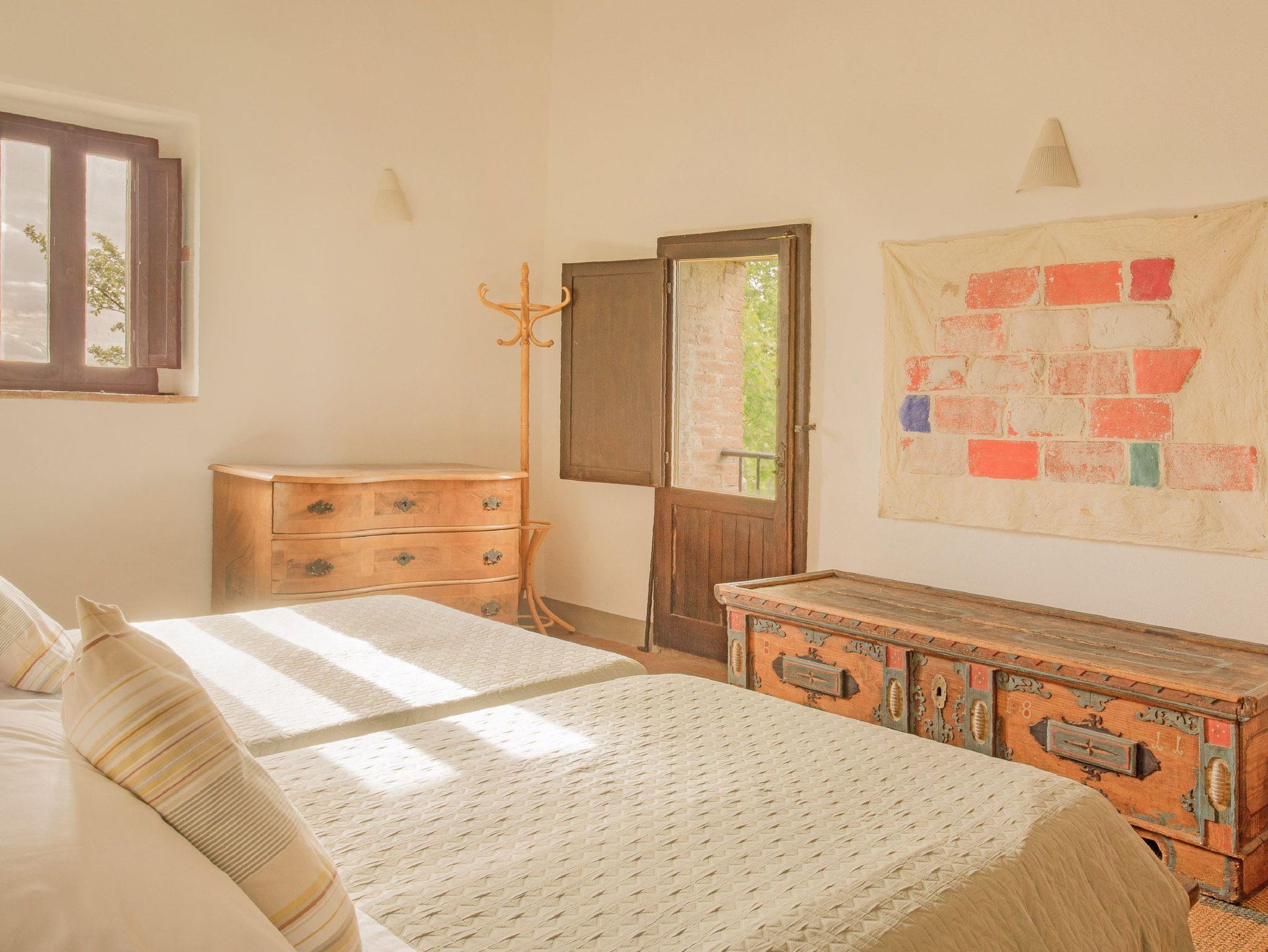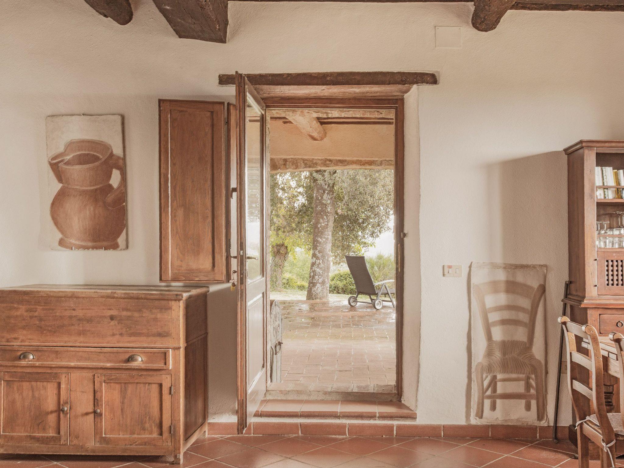 Die obere Wohnung im Haupthaus erstreckt sich über 200 Quadratmeter und vereint die Schönheit der Moderne mit dem Charme vergangener Zeiten. Kunstobjekte an den Wänden verleihen der Wohnung eine private und selten anzutreffende persönliche Note. Mit weiten Ausblicken, großzügigen Räumen und geschmackvoller Ausstattung entspricht die Wohnung höchsten Ansprüchen. Sie verfügt über einen alten Ziegelboden, ein großes Atelier mit Portalfenster und Ausgang zur Terrasse mit fantastischem Weitblick in das Chianti-Gebiet sowie einen großen Kaminraum. Hinzu kommen drei Schlafzimmer mit jeweils zwei Betten und zwei Badezimmer. Aus jedem der gemütlichen Schlafzimmer bieten sich neue, wunderschöne Blicke in die Weinberge. Die Bäder sind modern und zugleich mit altem Dekor eingerichtet. Die Küche ist voll ausgestattet mit Geschirrspüler, Backofen, Kühl- und Gefrierschrank.