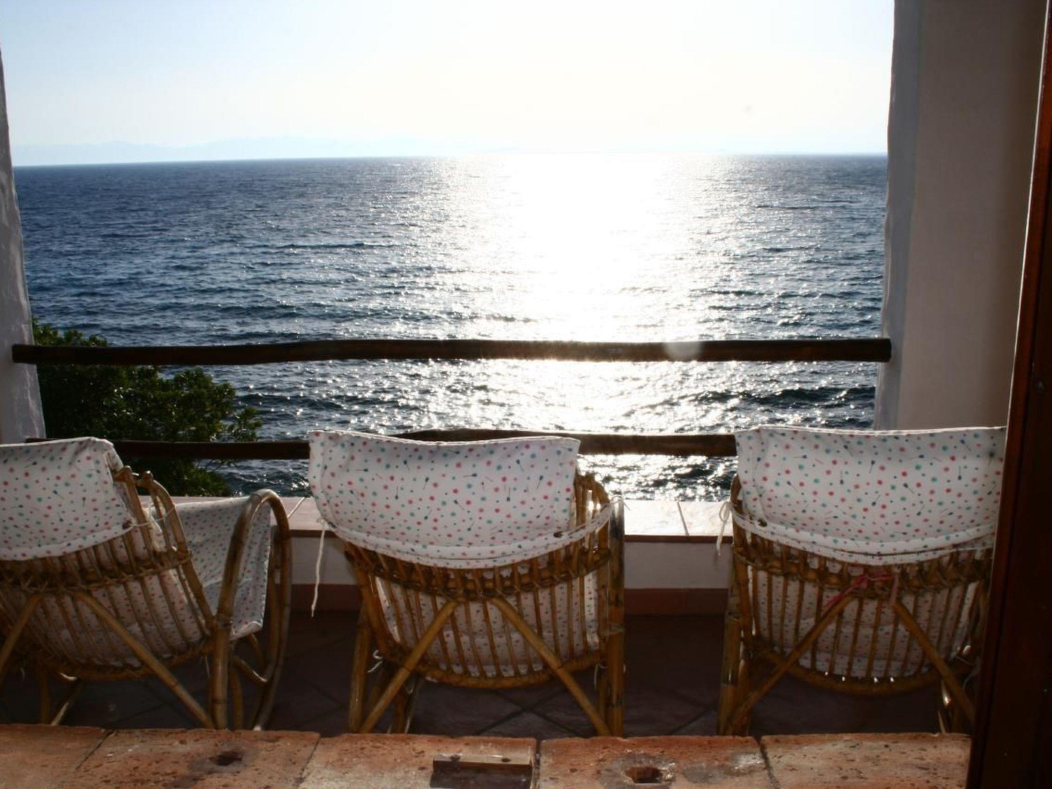 Vom Wohnbereich aus führen zwei große Fenstertüren auf eine große Terrasse mit spektakulärem Blick auf das Meer (das etwa 20 Meter tiefer liegt), die mit Gartenmöbeln ausgestattet ist (Tisch mit Sitzgelegenheiten für 10 Personen, 4 alte Korbschaukelstühle und Verdunklungsvorhänge).