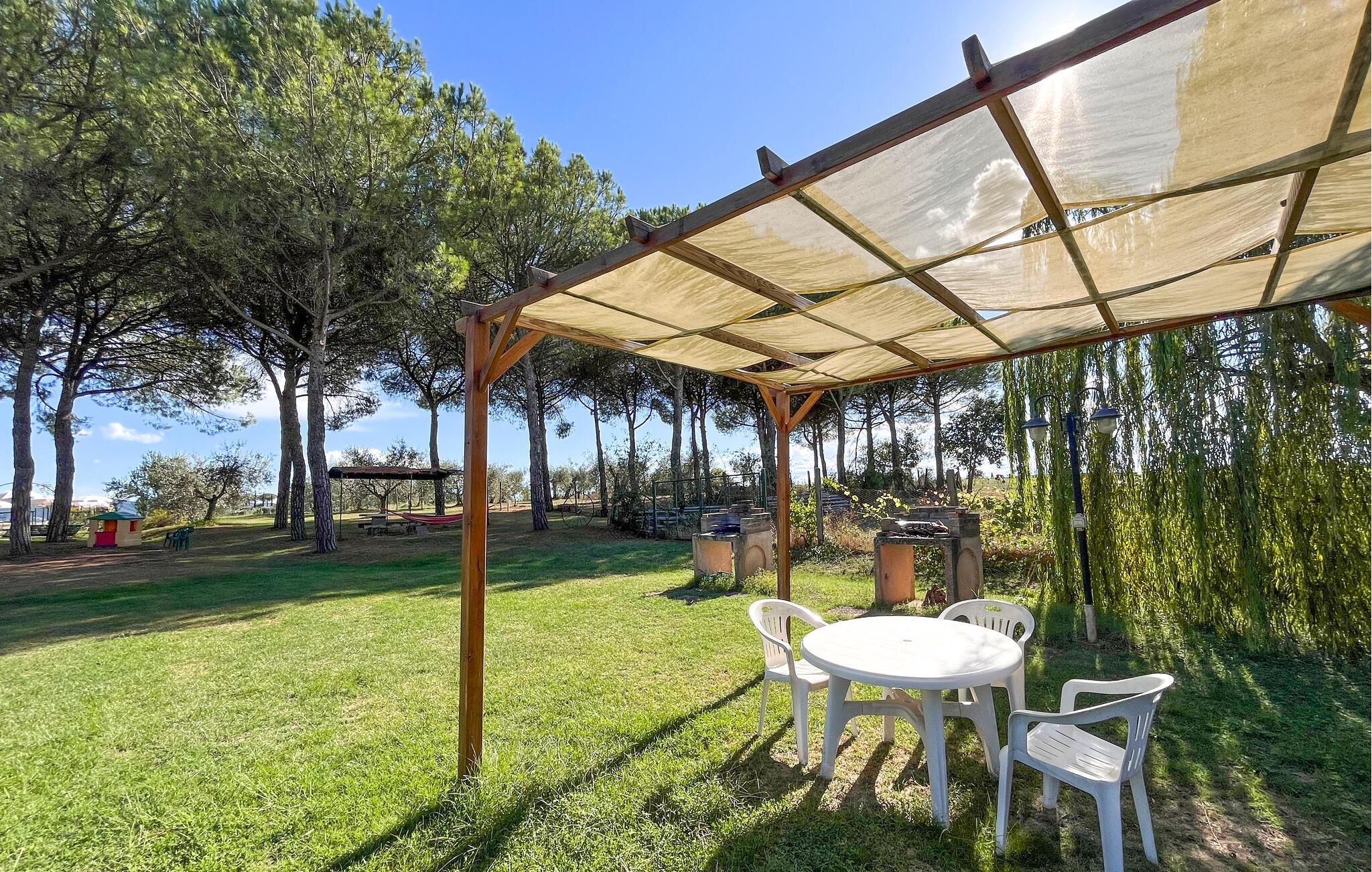Nutzen Sie die Veranda, die Ihnen zur alleinigen Nutzung zur Verfügung steht, und genießen Sie Ihre Mahlzeiten im Freien, während Sie die frische Landluft atmen. Lassen Sie Ihre Kinder auf dem Spielplatz toben oder bereiten Sie ein köstliches Abendessen im Grillbereich zu. Tauchen Sie ein in den gemeinschaftlichen Pool, um sich an heißen Sommertagen abzukühlen und die friedliche Atmosphäre des Anwesens zu genießen.